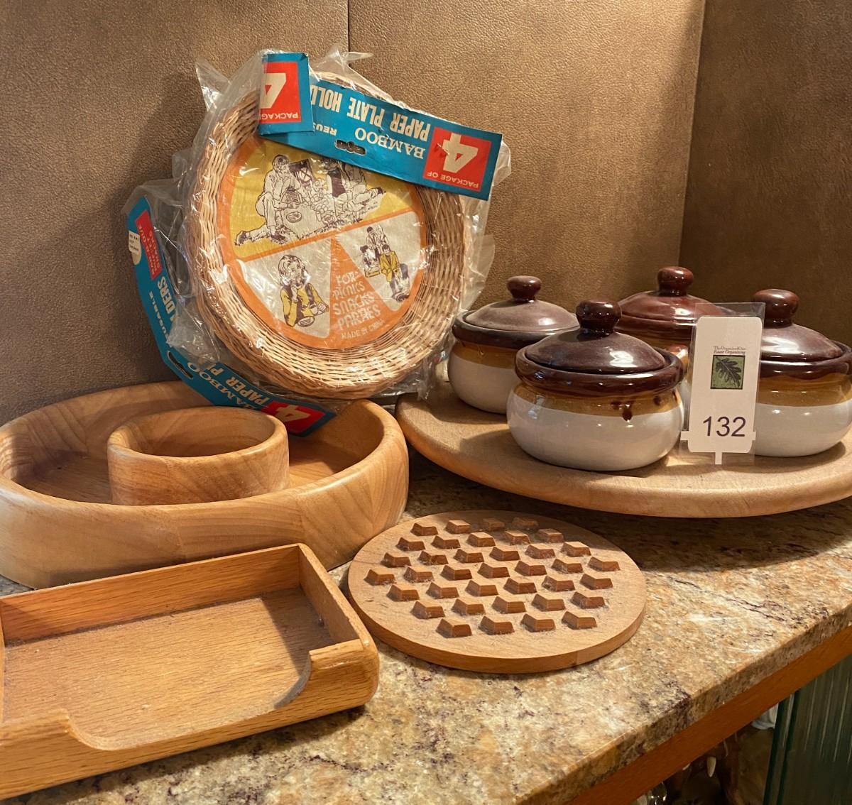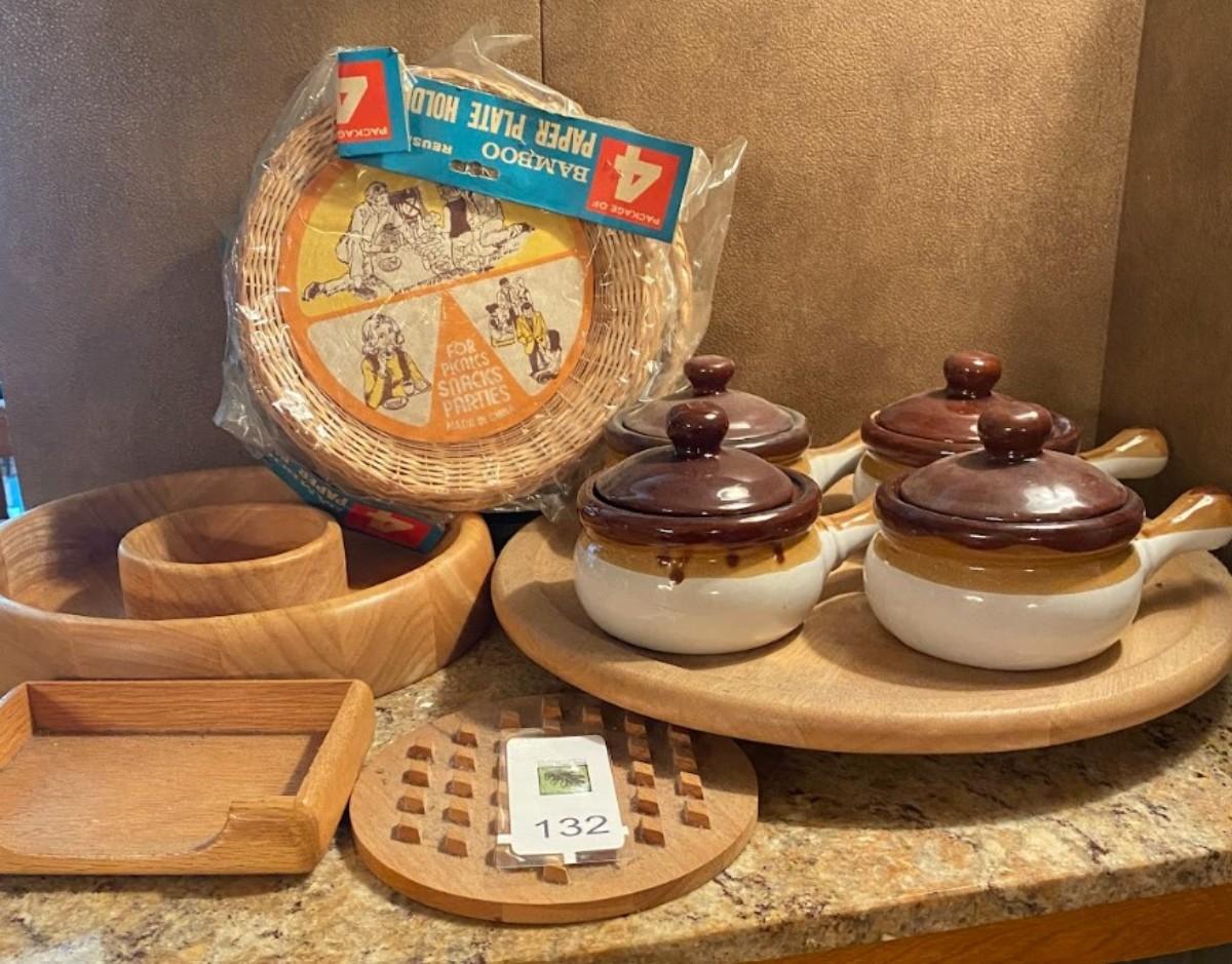 Lot of miscellaneous kitchen items. Round wooden, rotating tray, (4) 5" clay ramekins with lid, stack of wicker plate holders, wooden serving dish