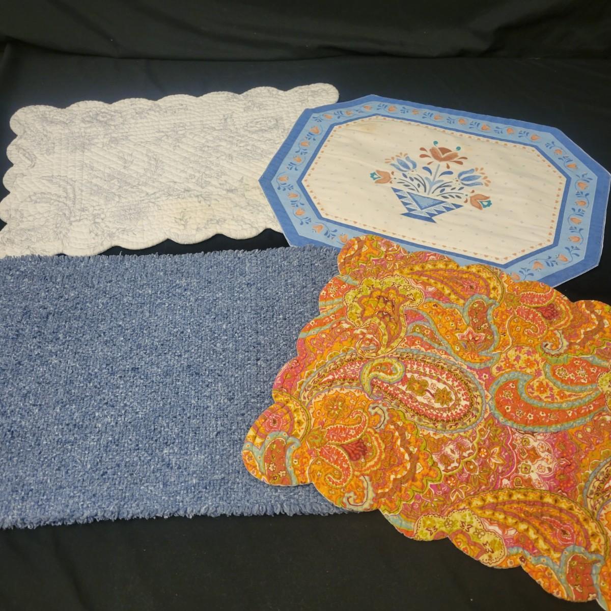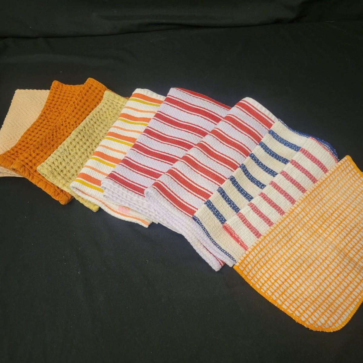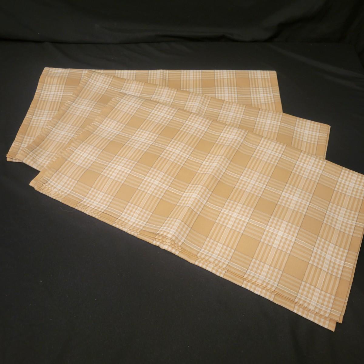 A large assortment of kitchen linens in good condition with some minor stains. Included in this lot are multiple sets of place-mats, kitchen towels and cloths, multiple sets of kitchen gloves and more. Largest linen is the beige plaid linen and measures approximately 43" x 48". Shipping available