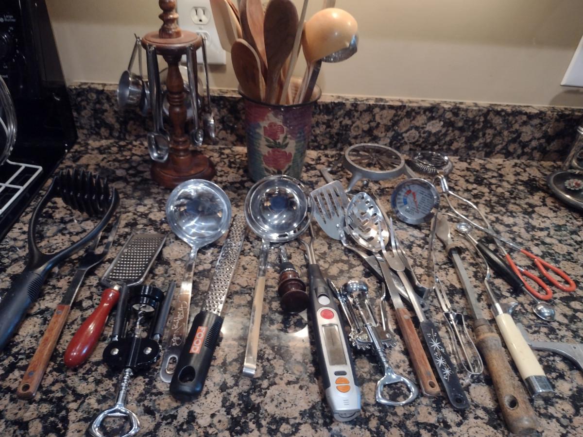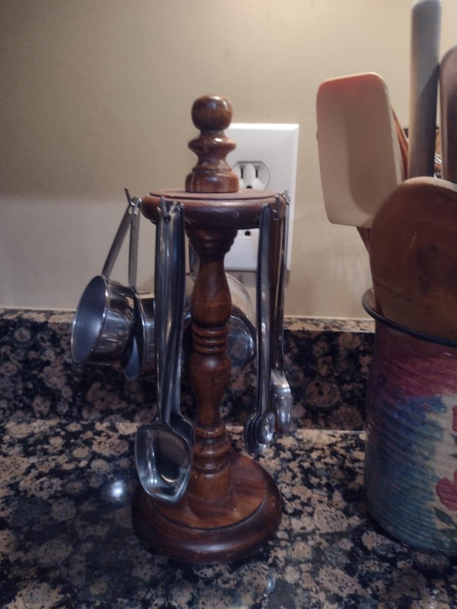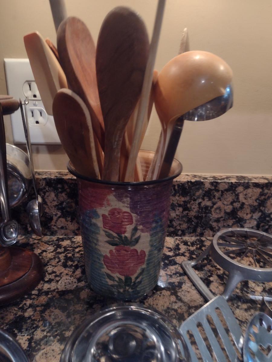 Collection of Kitchen Utensils. Includes measuring cups and pottery utensil holder.