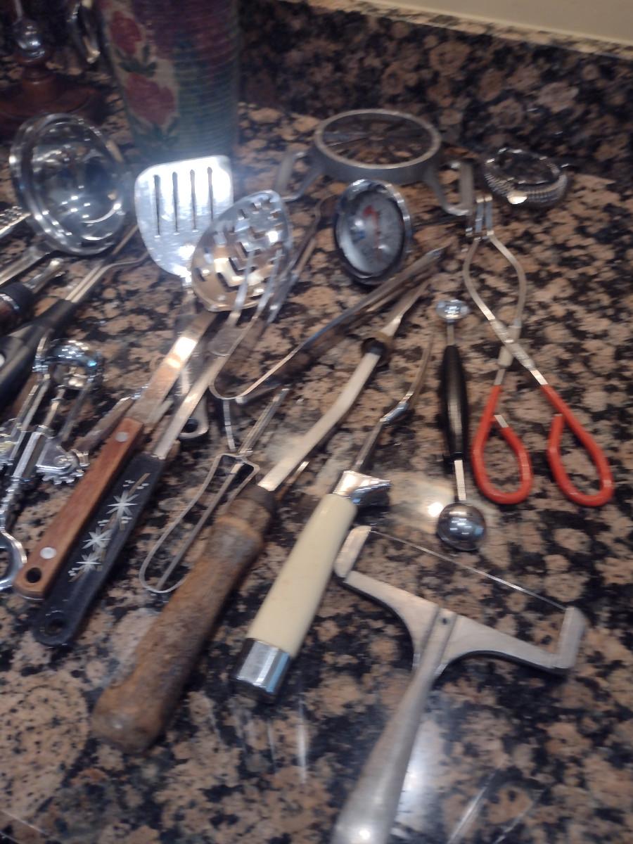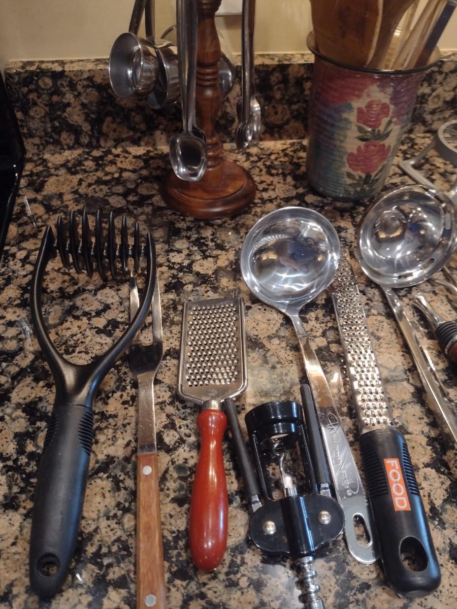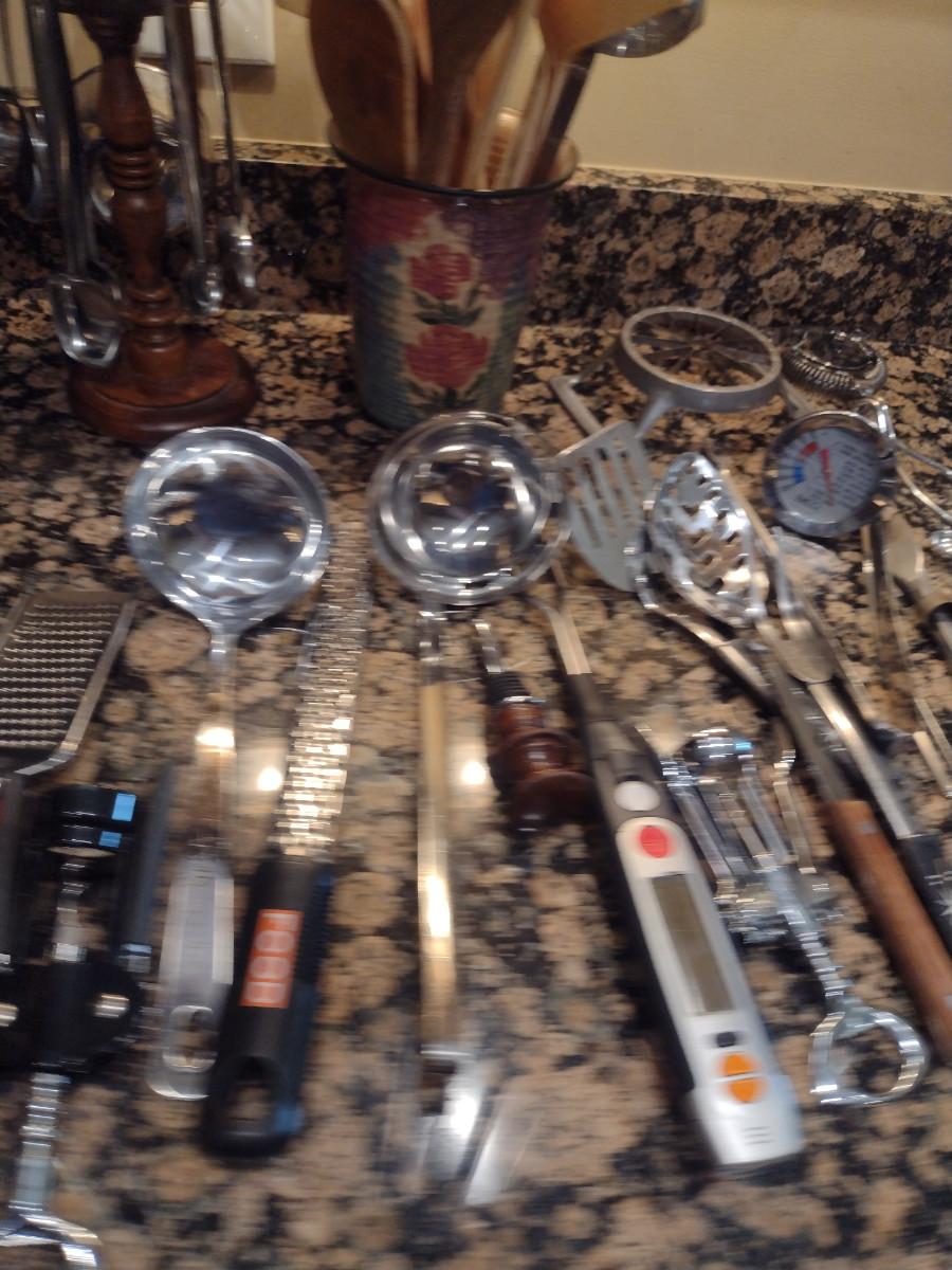 Collection of Kitchen Utensils. Includes measuring cups and pottery utensil holder.