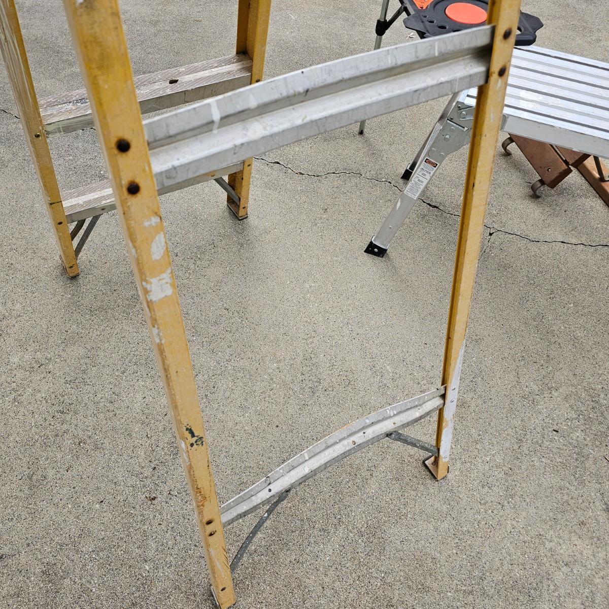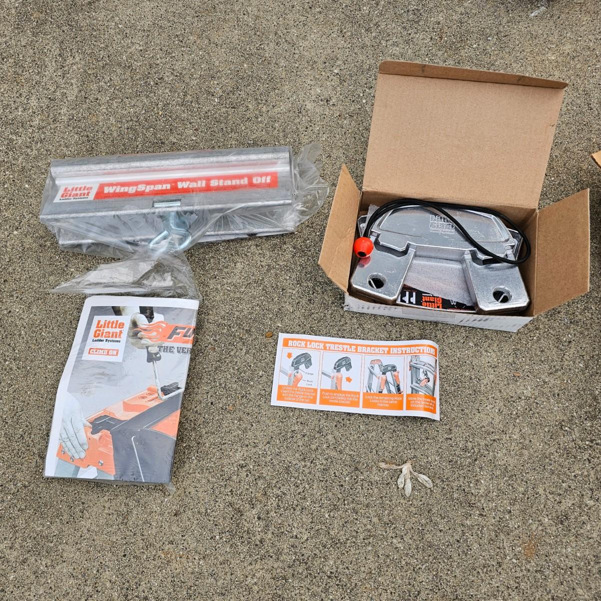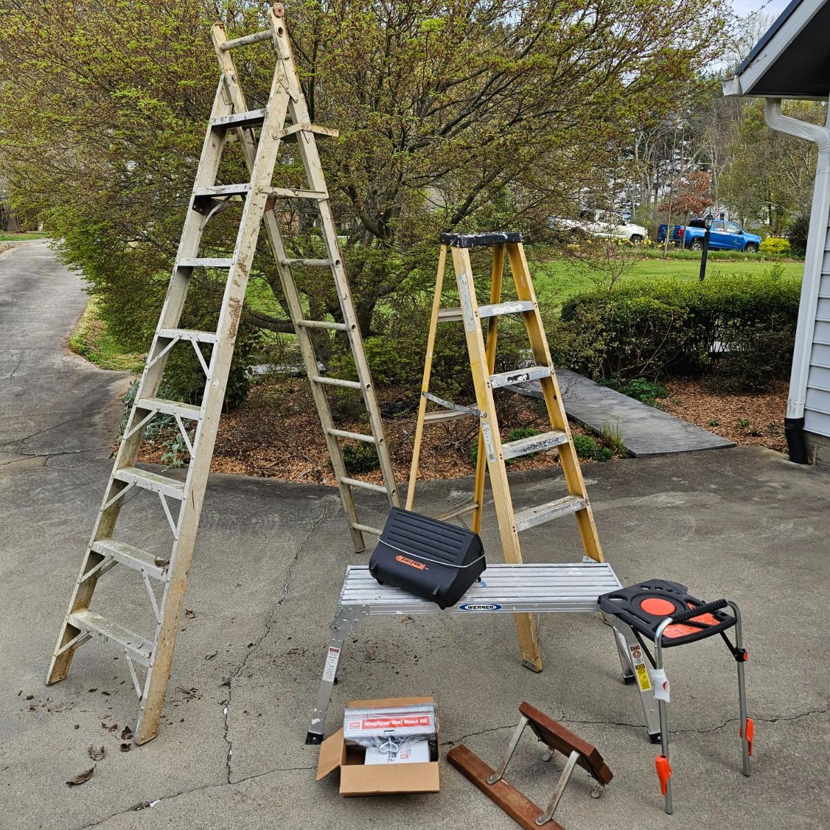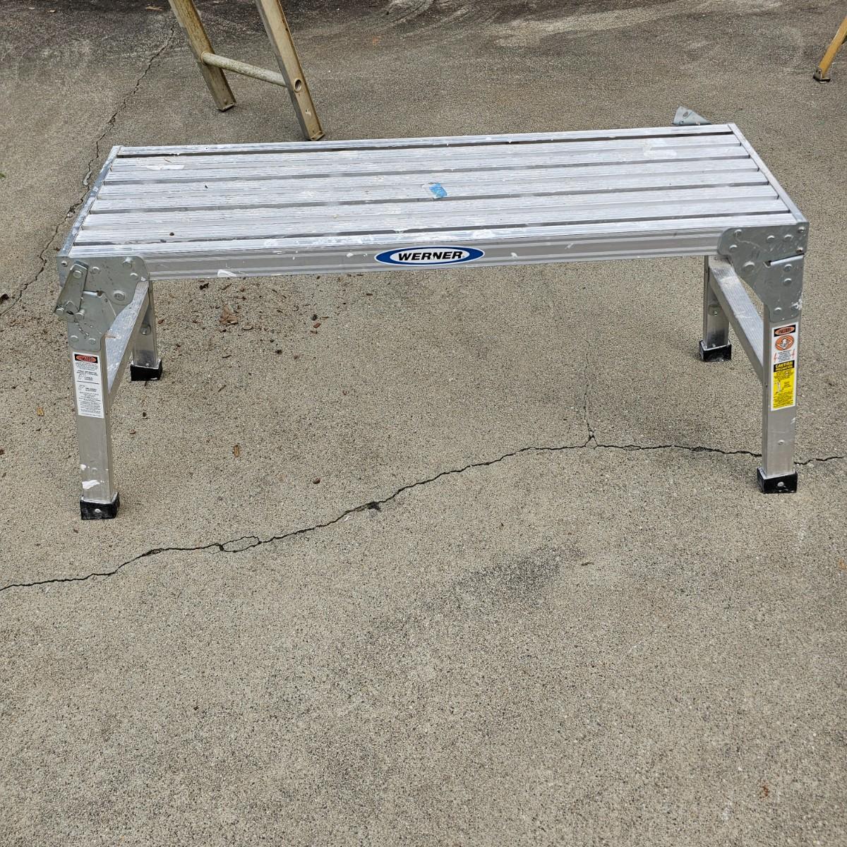 Two stepladders and assorted add ons for painting and other. One six foot fiberglass stepladder, one nine foot aluminum combo step and extension ladder. One Werner small scaffold unit, 12" x 40" x 12"H. Some Little Giant brand attachment pieces, new in box. See photos for details. Local pickup only.