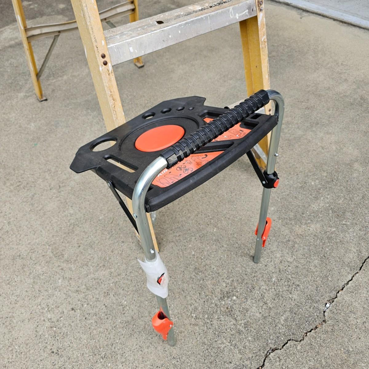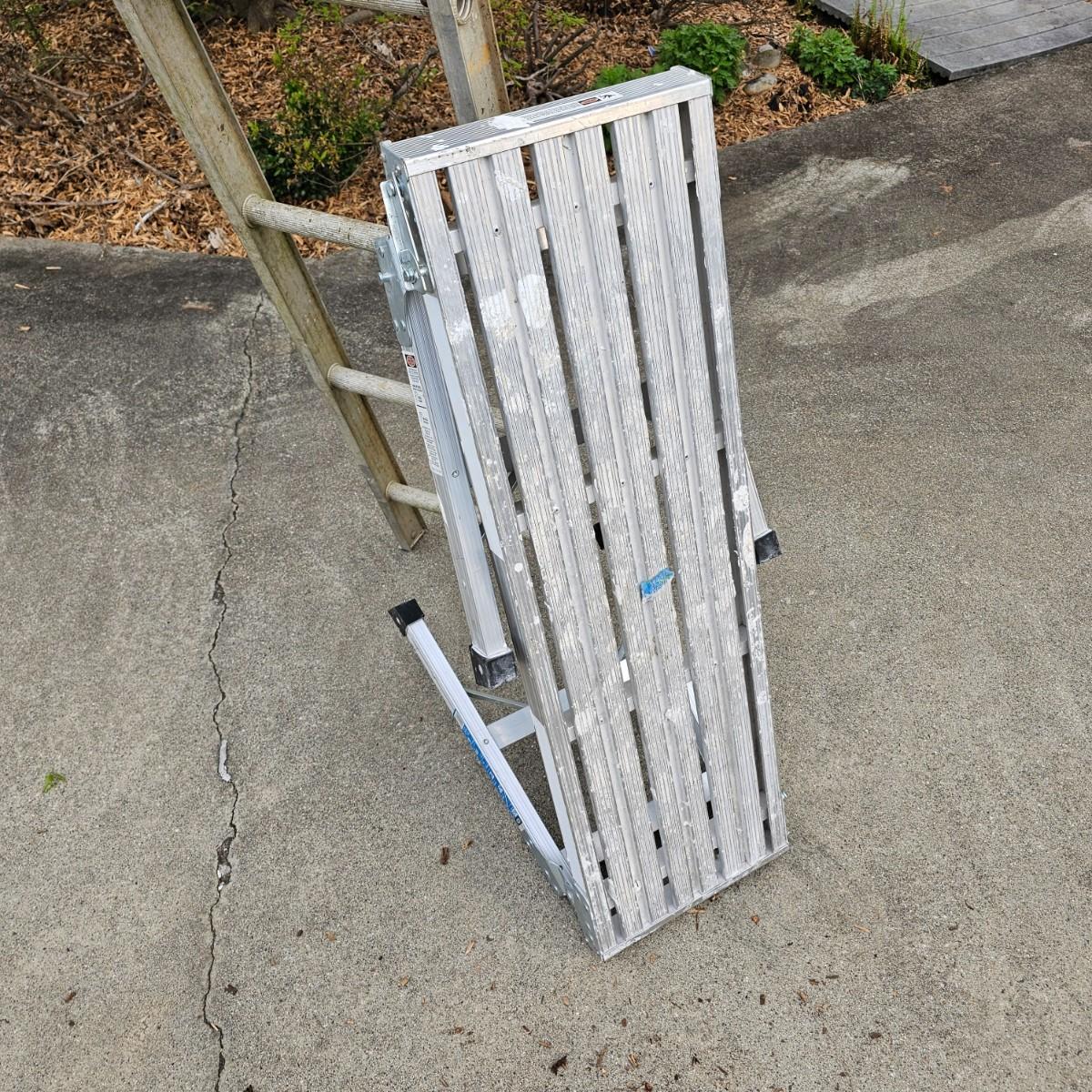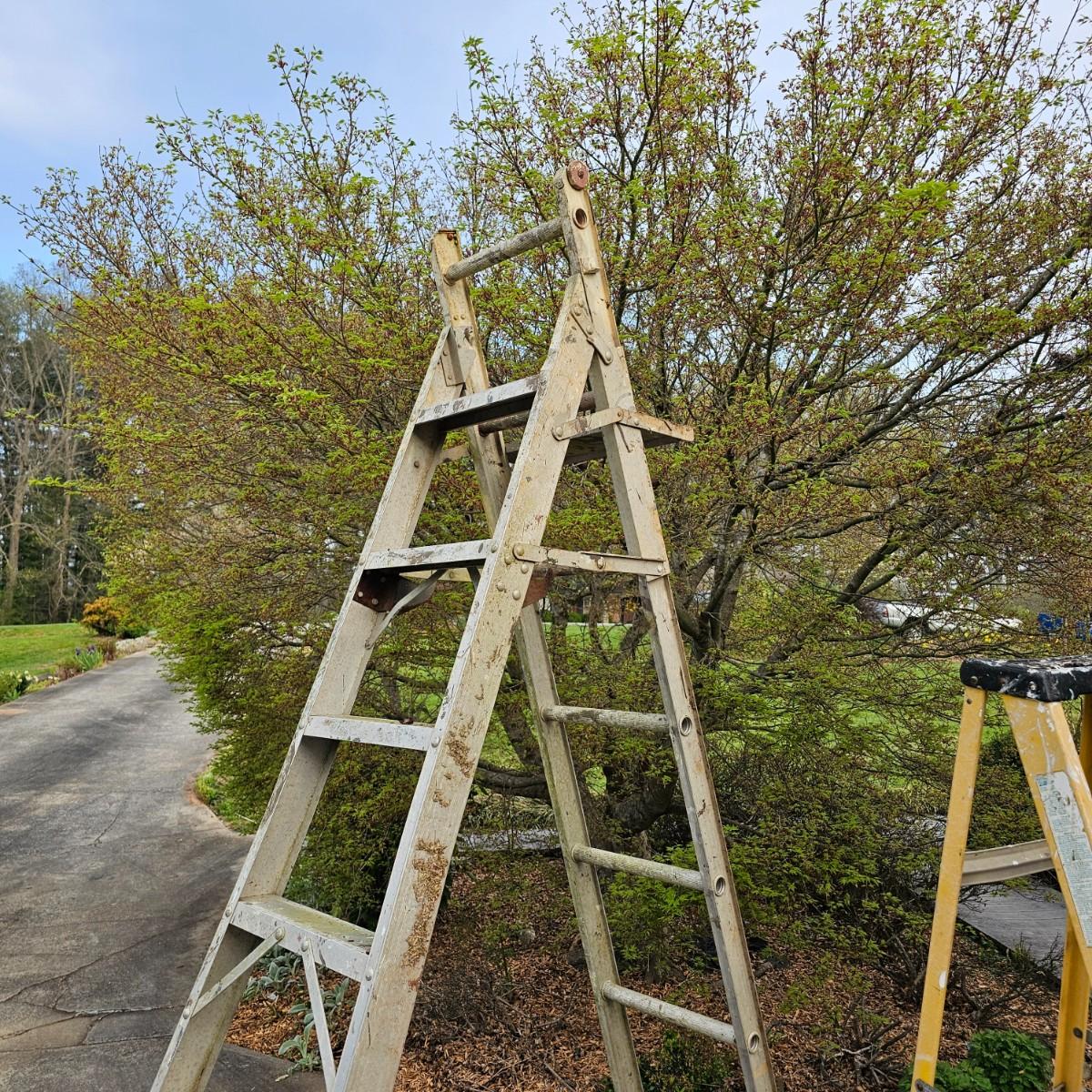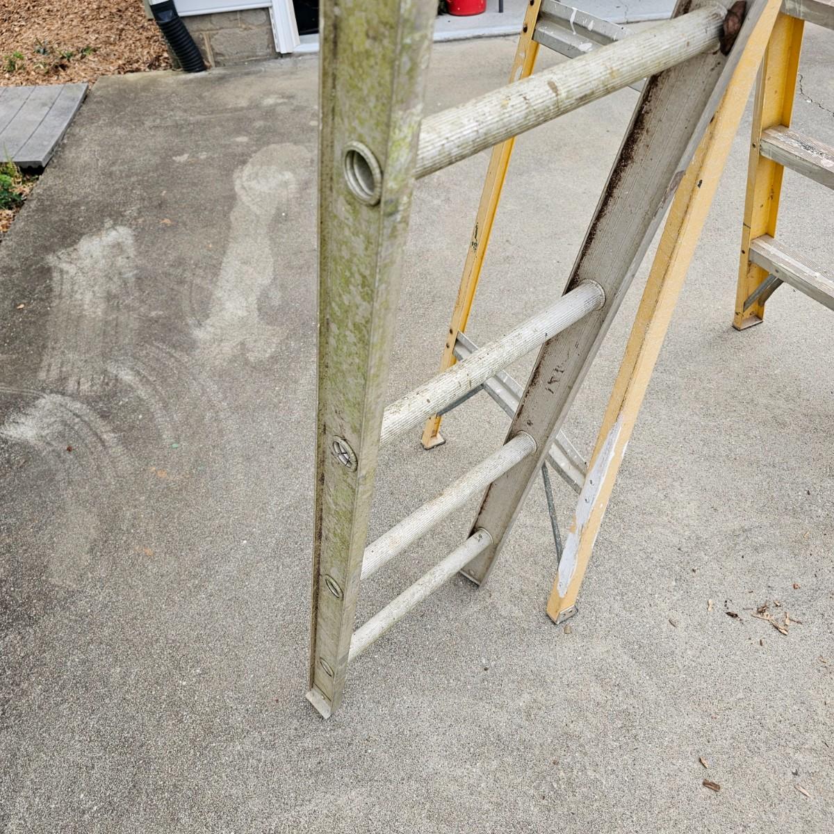 Two stepladders and assorted add ons for painting and other. One six foot fiberglass stepladder, one nine foot aluminum combo step and extension ladder. One Werner small scaffold unit, 12" x 40" x 12"H. Some Little Giant brand attachment pieces, new in box. See photos for details. Local pickup only.