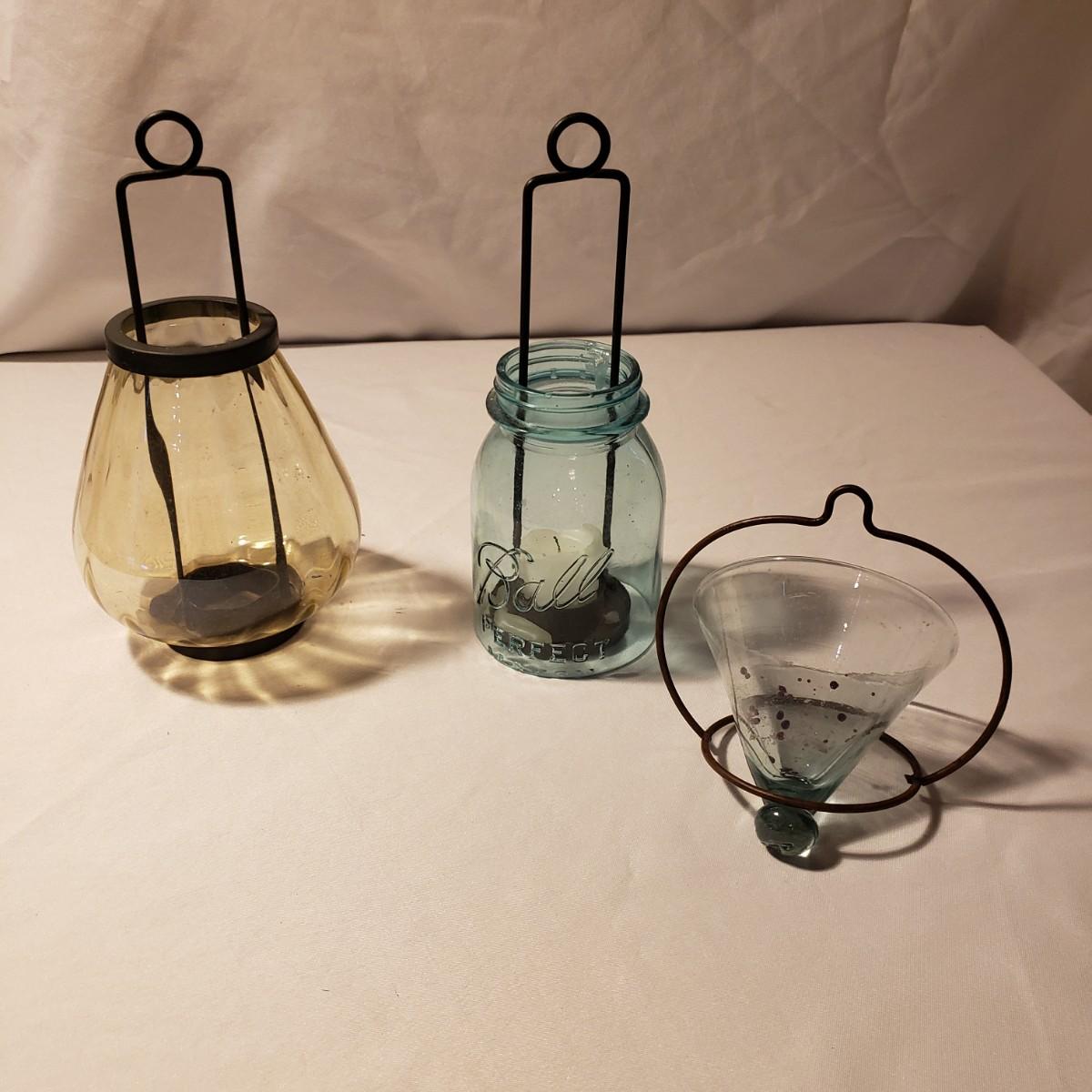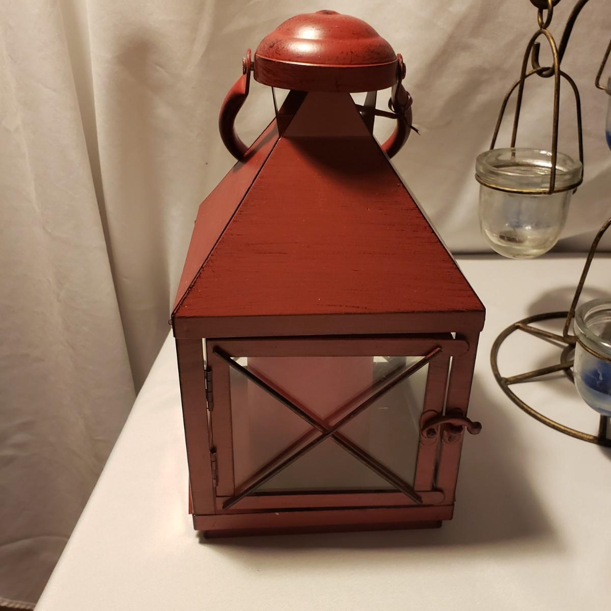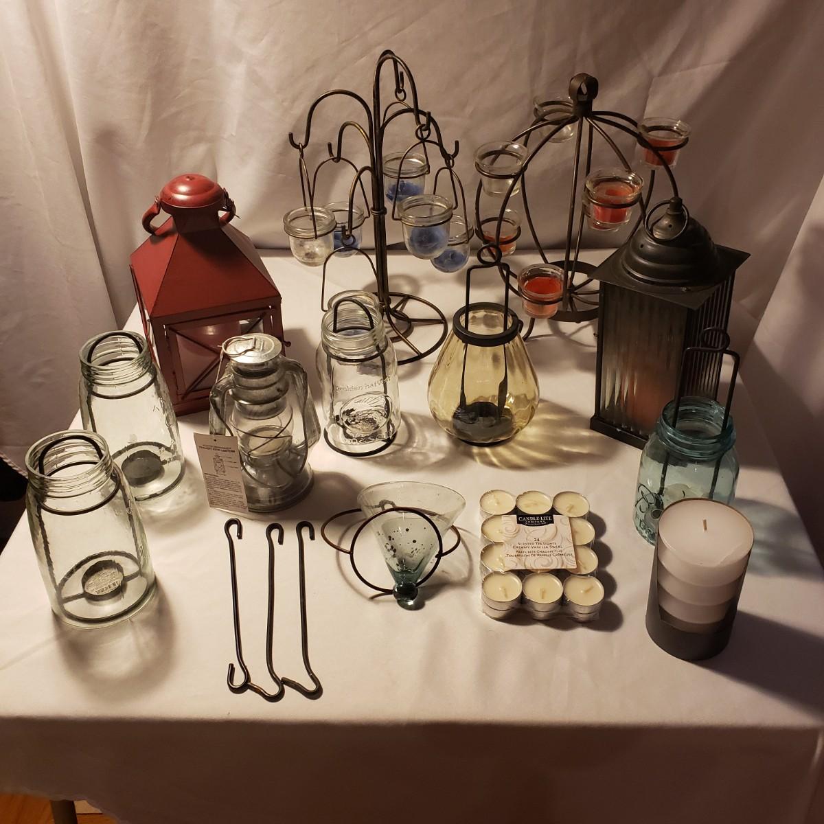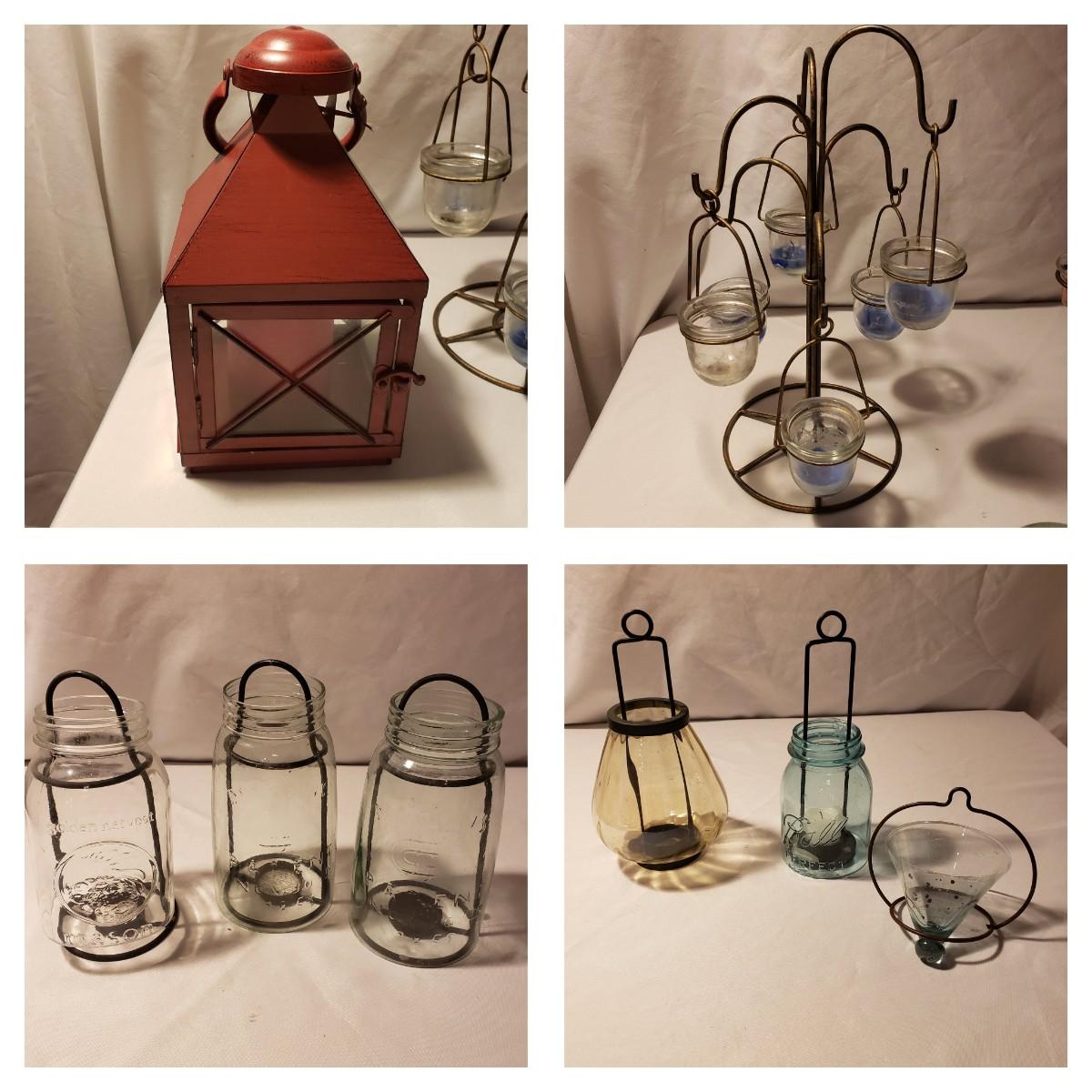 Let there be light! You'll have it with this lot! A wide variety of unique candle holders including two metal multi cup holders that measure approximately 10" x 13"H. There are two metal with glass sides lanterns, one red and the other grey metal. The red one has a battery candle that was not tested. The grey metal one has a beveled type of glass that just needs a good cleaning. There are multiple glass Mason jar types of hanging lanterns that are metal and hold a tea candle. See pictures for details.