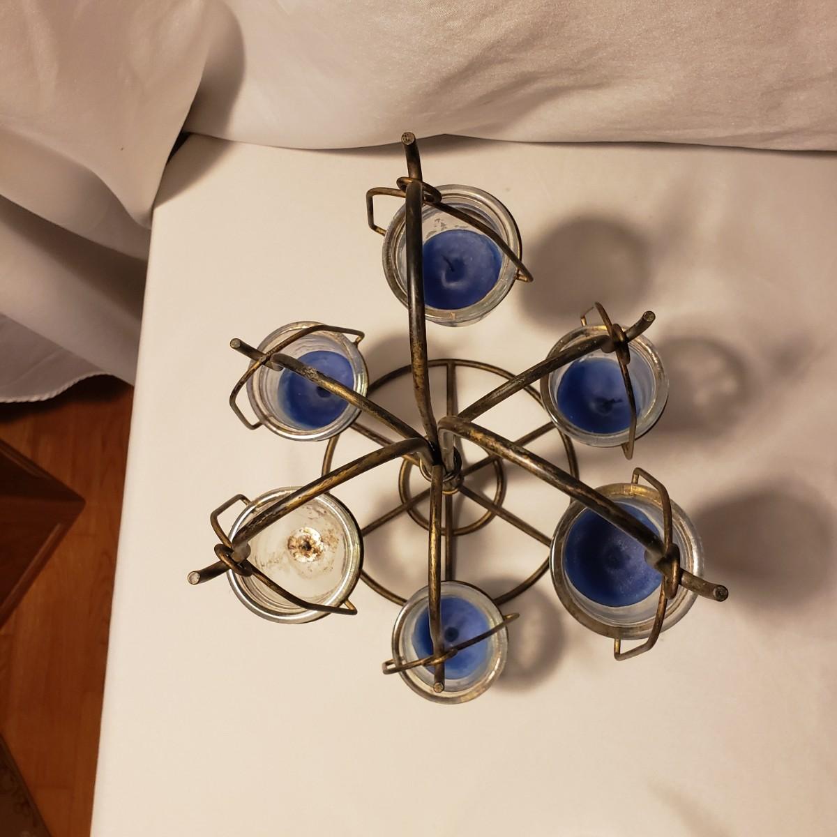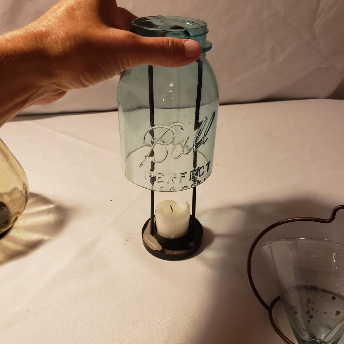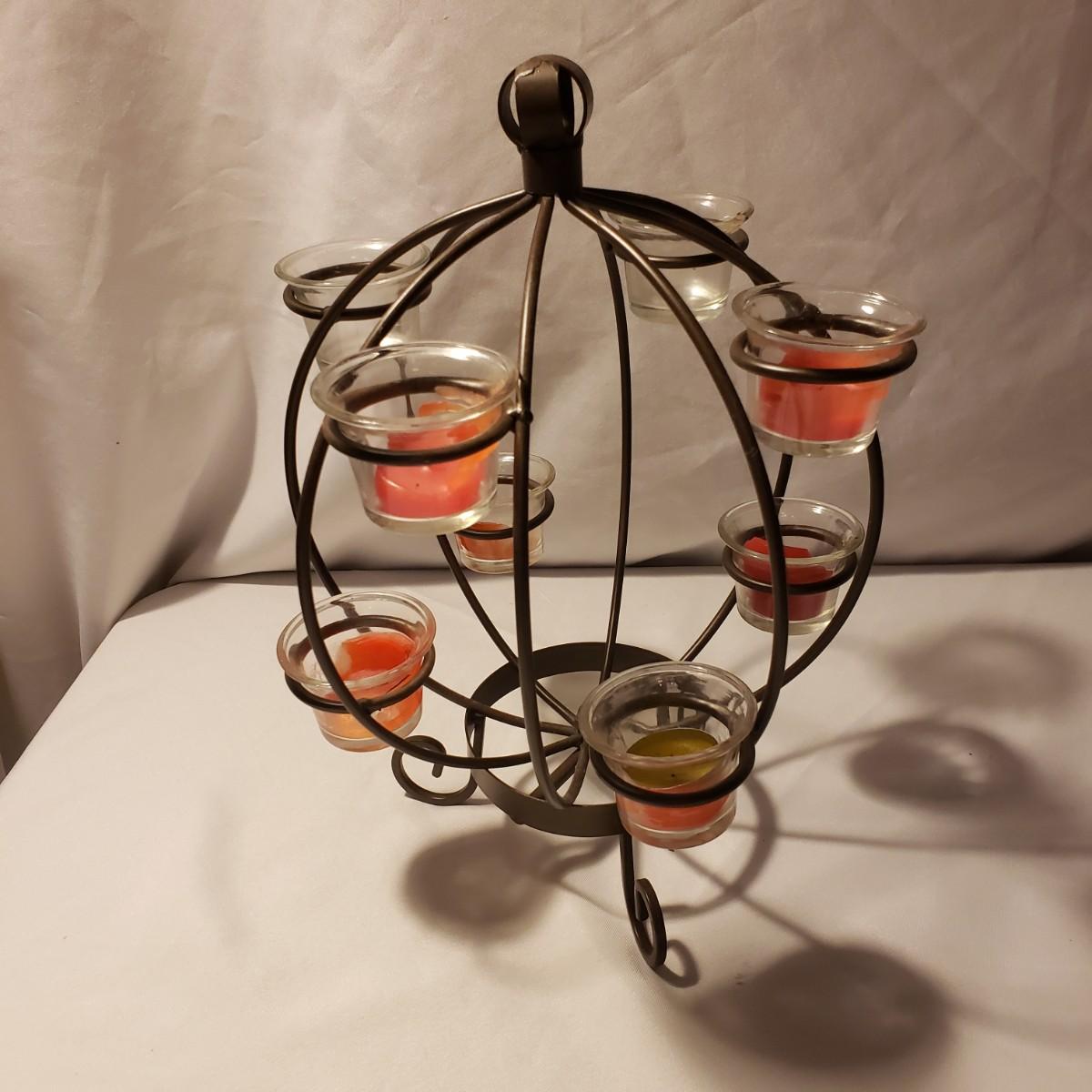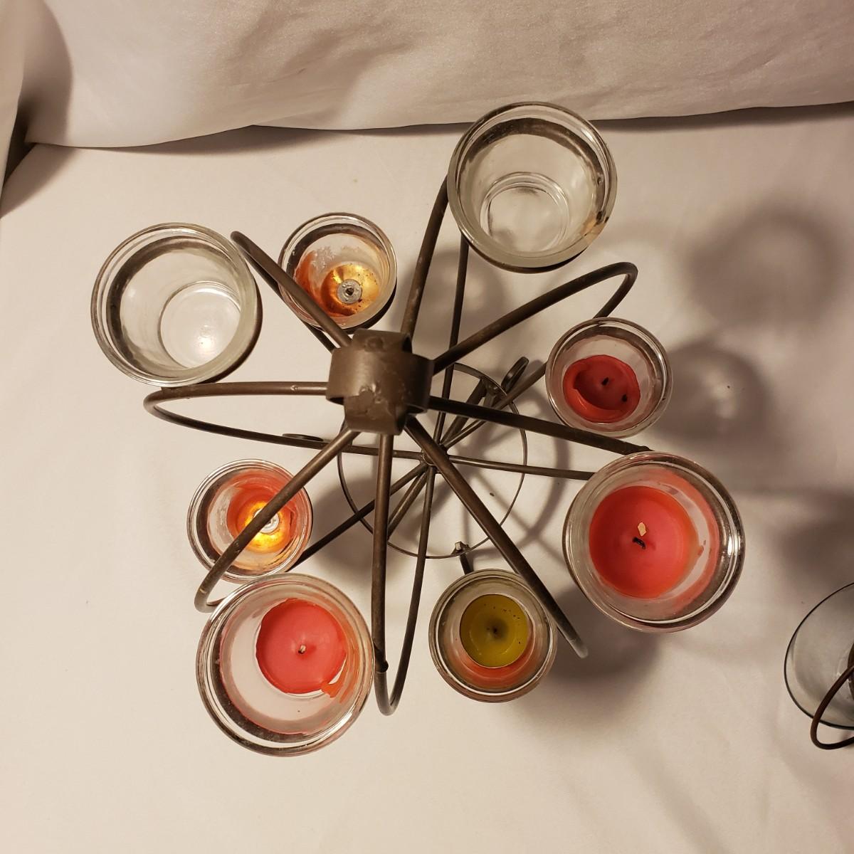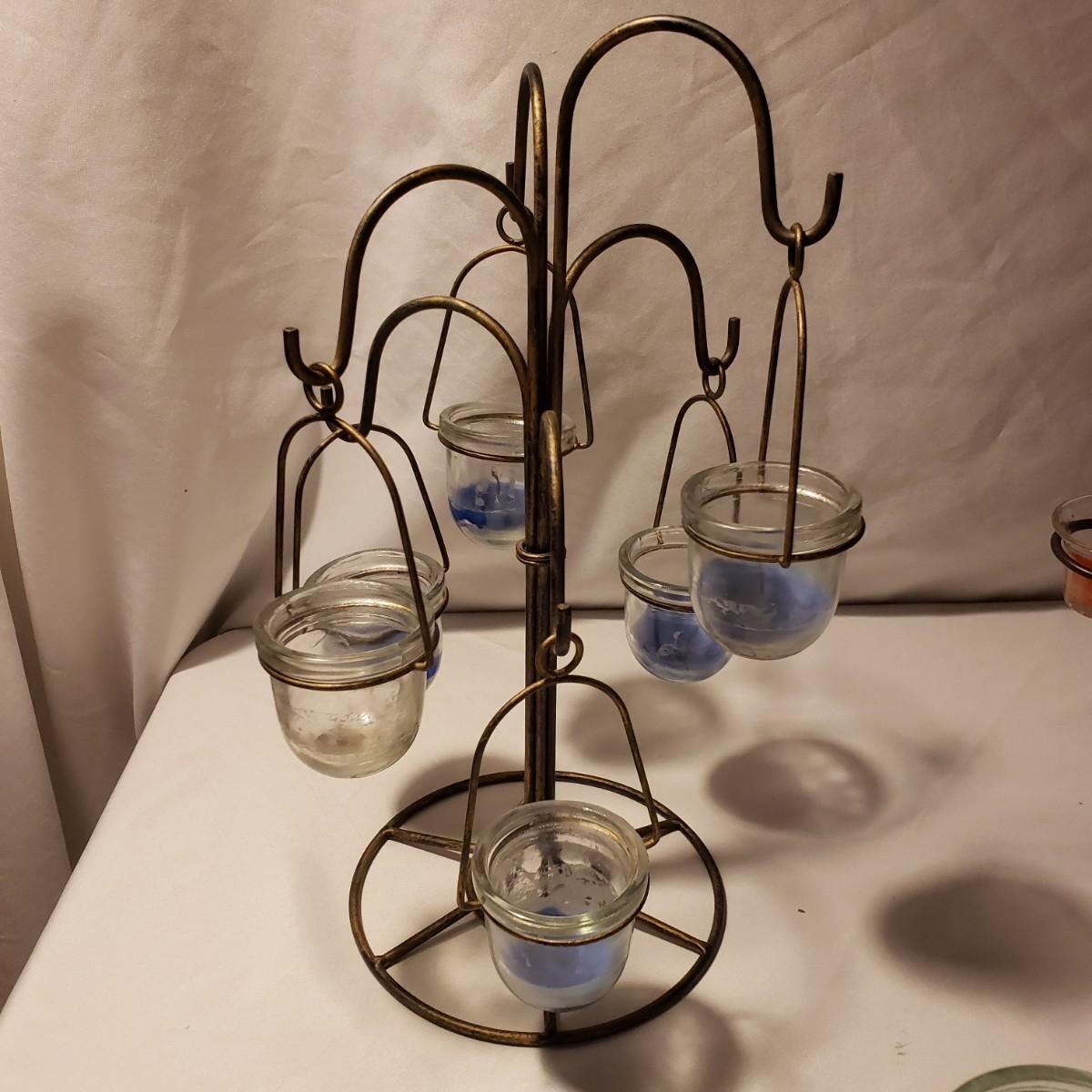 Let there be light! You'll have it with this lot! A wide variety of unique candle holders including two metal multi cup holders that measure approximately 10" x 13"H. There are two metal with glass sides lanterns, one red and the other grey metal. The red one has a battery candle that was not tested. The grey metal one has a beveled type of glass that just needs a good cleaning. There are multiple glass Mason jar types of hanging lanterns that are metal and hold a tea candle. See pictures for details.