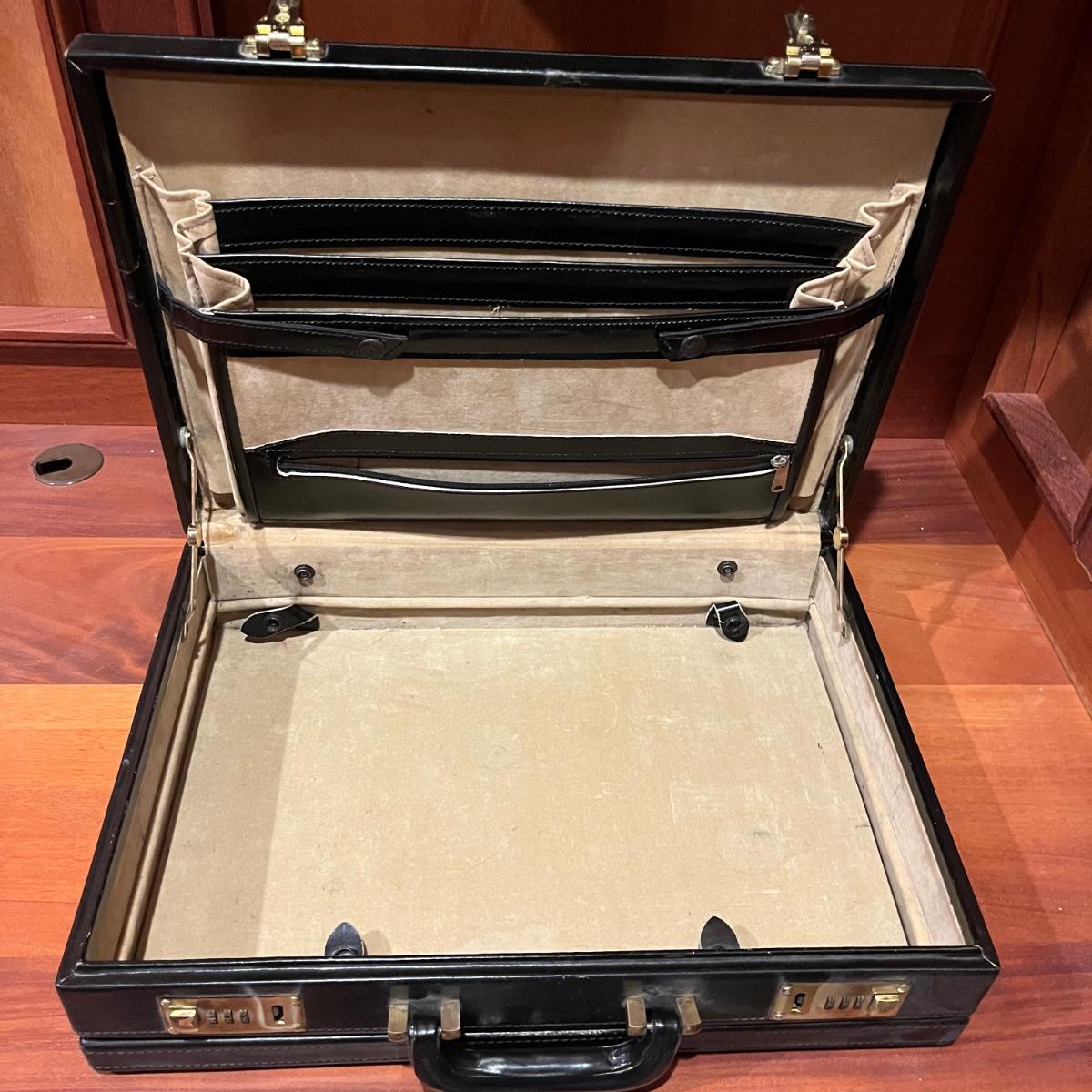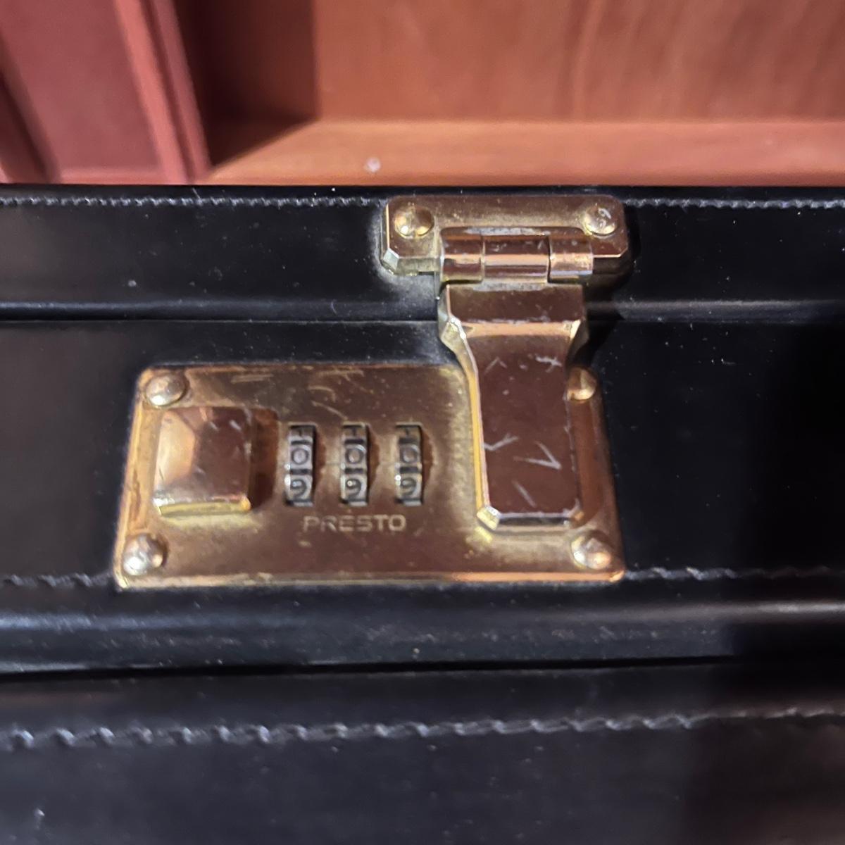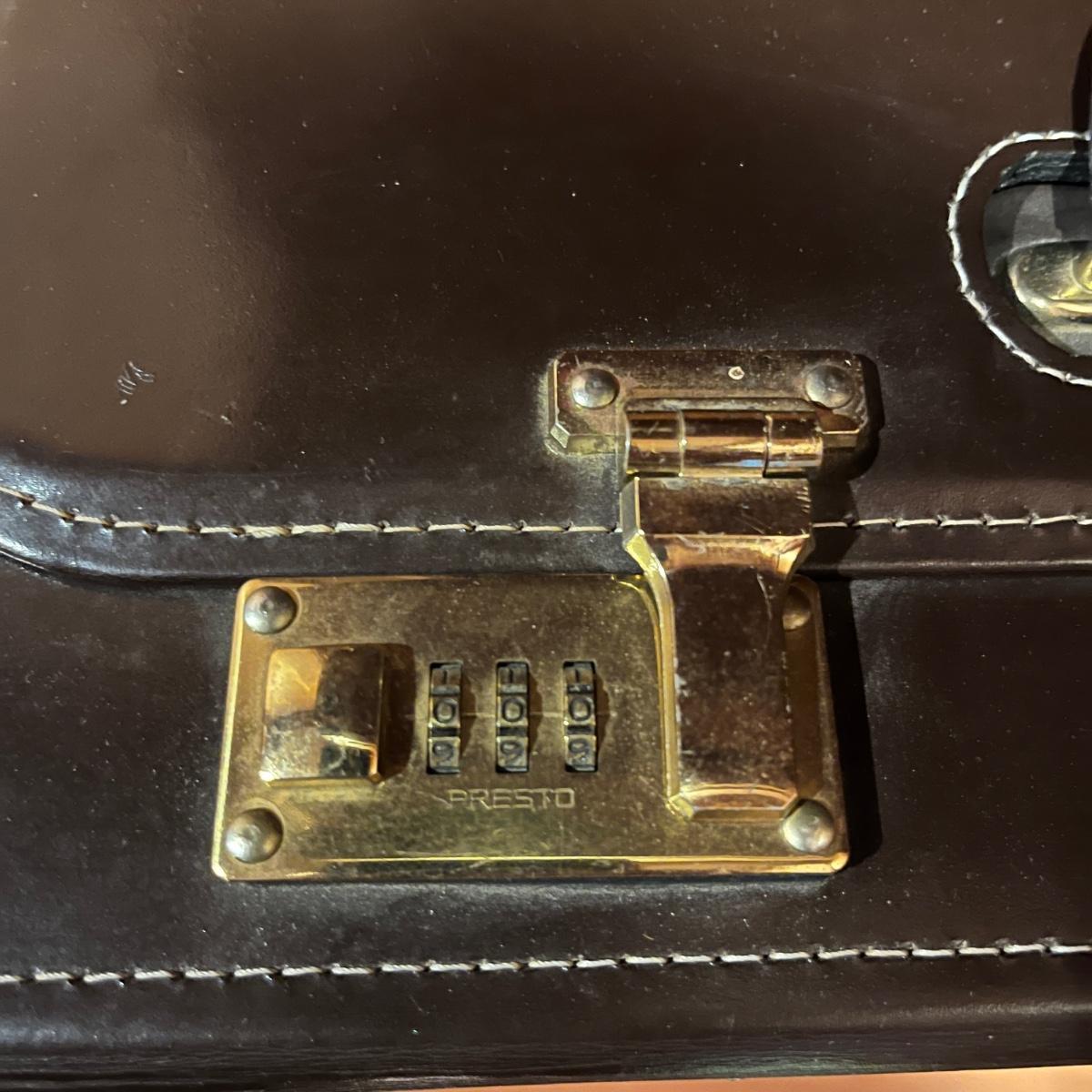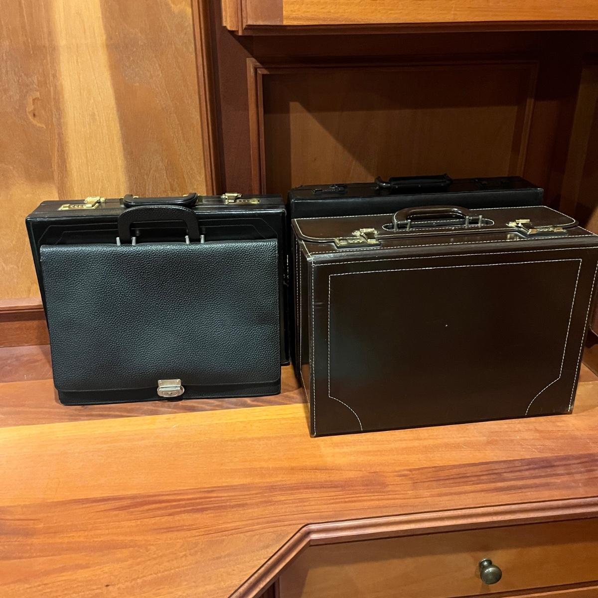 This collection of briefcases includes large briefcase with combination locks, one monogrammed briefcase with combination locks with corner cut, see pictures. Also includes a briefcase with combination locks and one portfolio style briefcase with lock that has no key. Largest briefcase measures 7.5” x 18” x 12”H. All items appear to be leather.