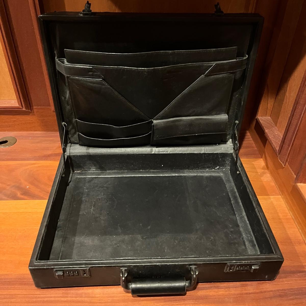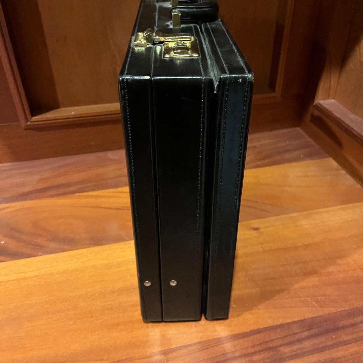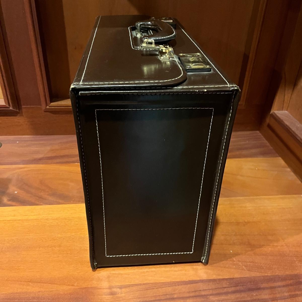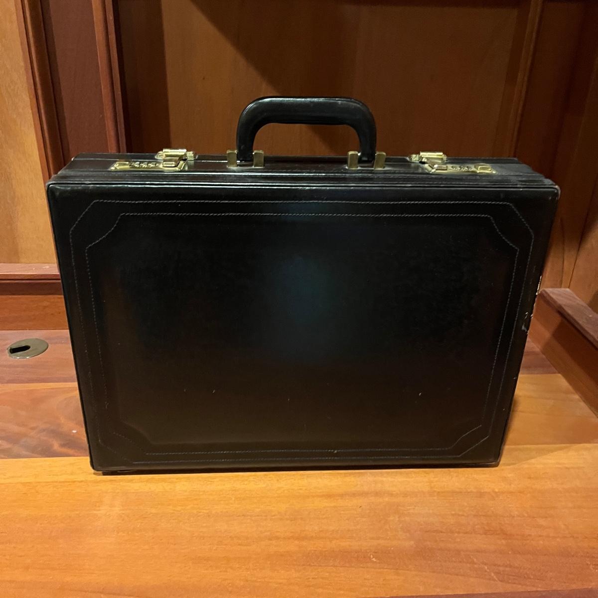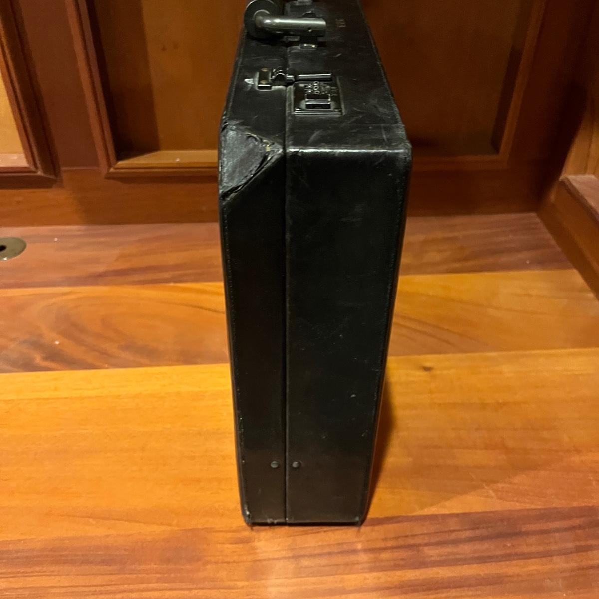 This collection of briefcases includes large briefcase with combination locks, one monogrammed briefcase with combination locks with corner cut, see pictures. Also includes a briefcase with combination locks and one portfolio style briefcase with lock that has no key. Largest briefcase measures 7.5” x 18” x 12”H. All items appear to be leather.