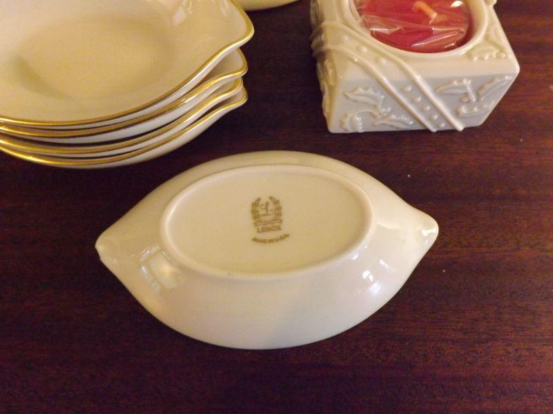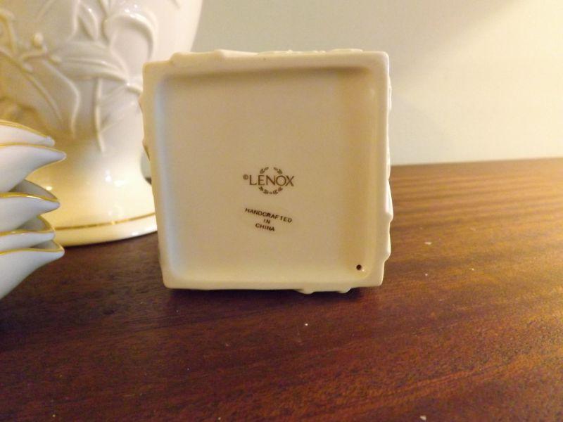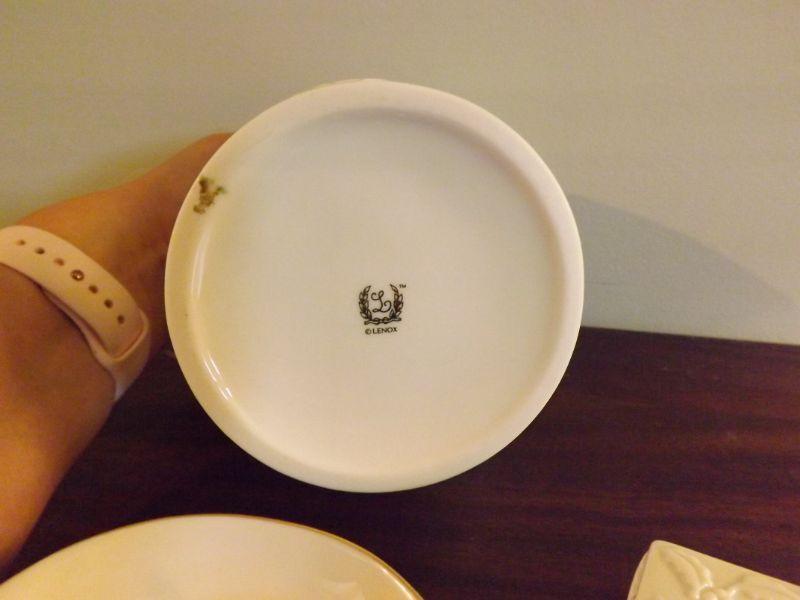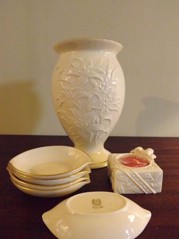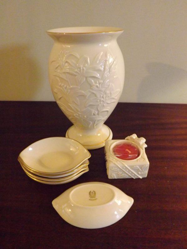 Collection of Lenox - Vase, 5 small dishes, and a tealight holder. **Please read Terms and Conditions before placing a bid. Pick up is Sunday, September 1, 2019 from 10am to 4pm in Williamstown. All sales are final. All sales are as is, where is. Please review all photos. Any props included in photos are not included in listing. All measurements are approximate.