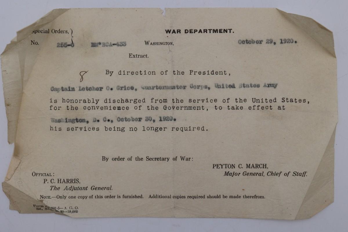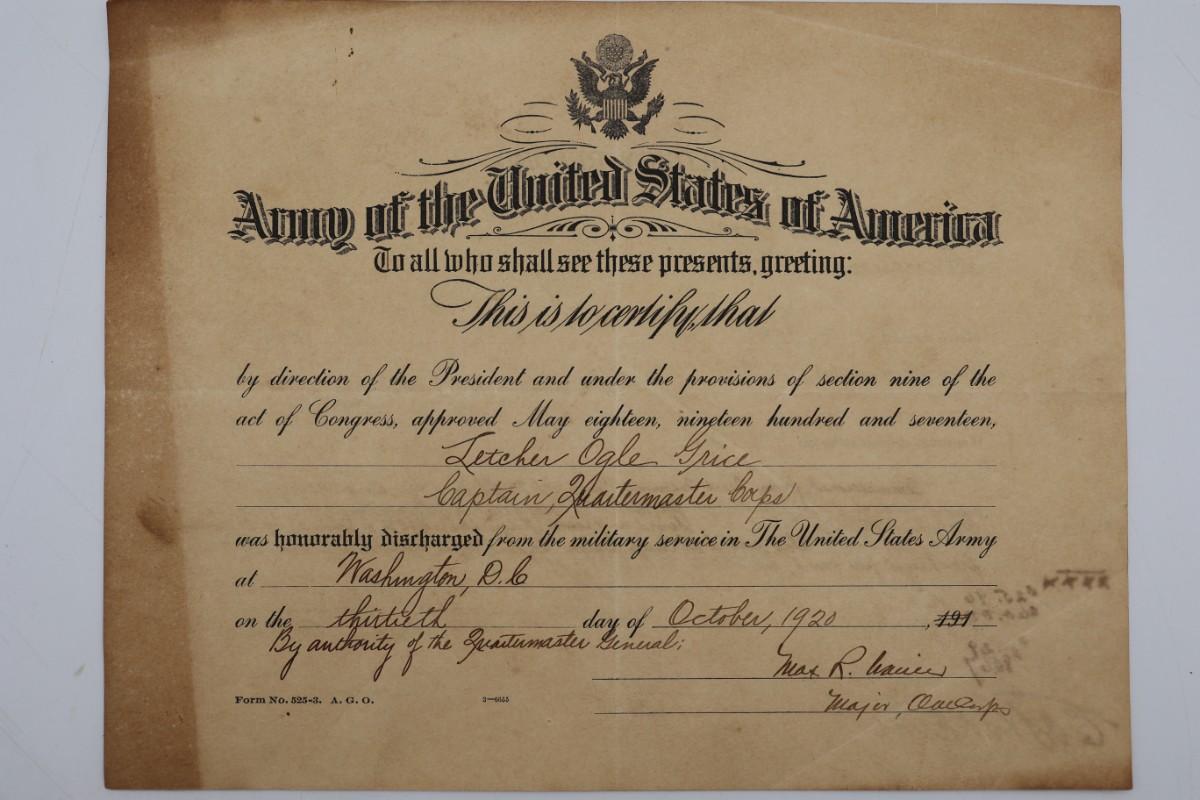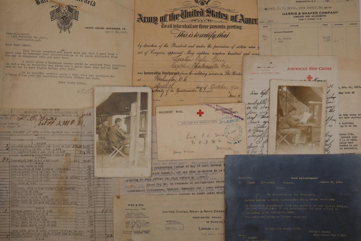 This collection is of Letcher Ogle Grice containing personal letters, army documents, newspapers, receipts, postcards, letter to president during and after WWI.