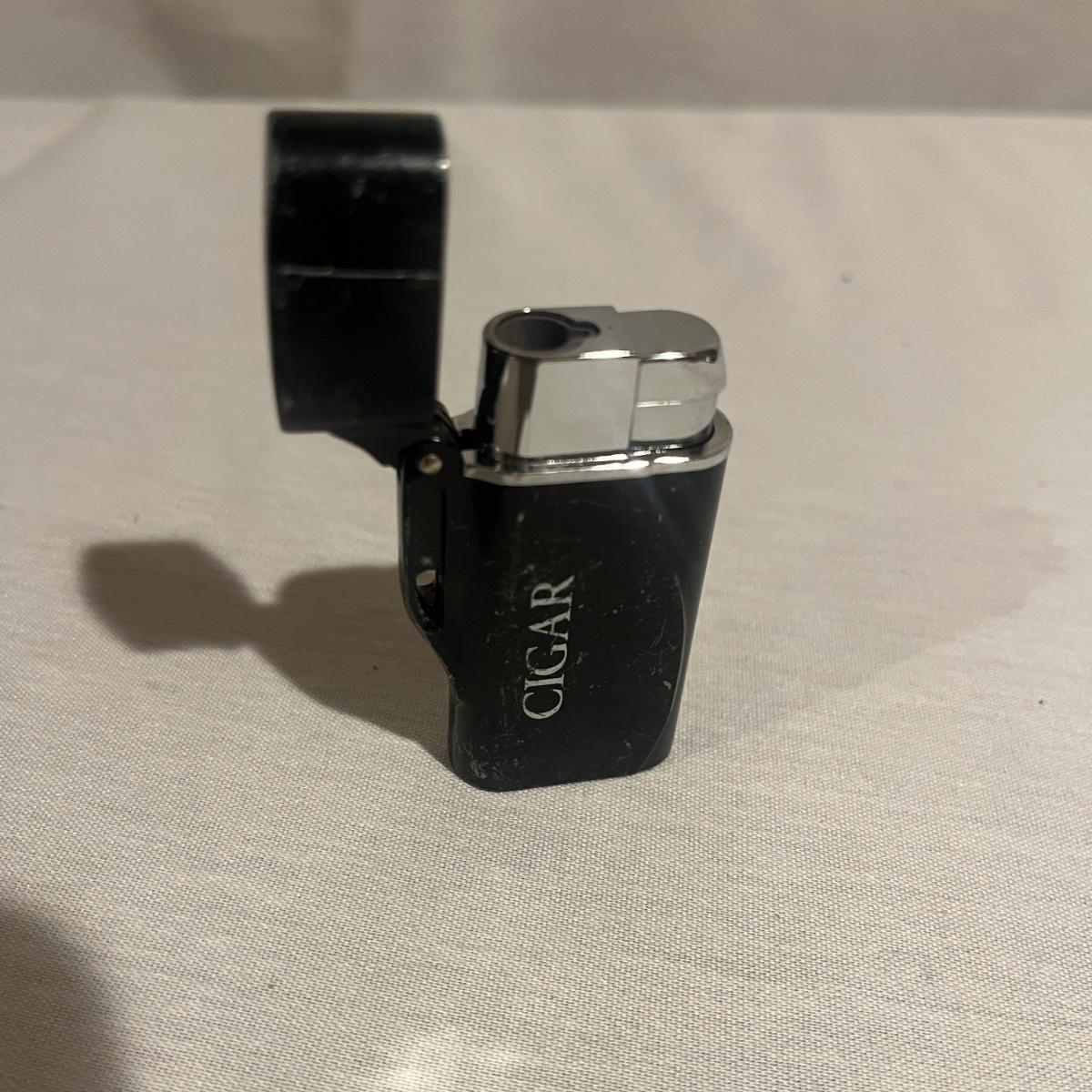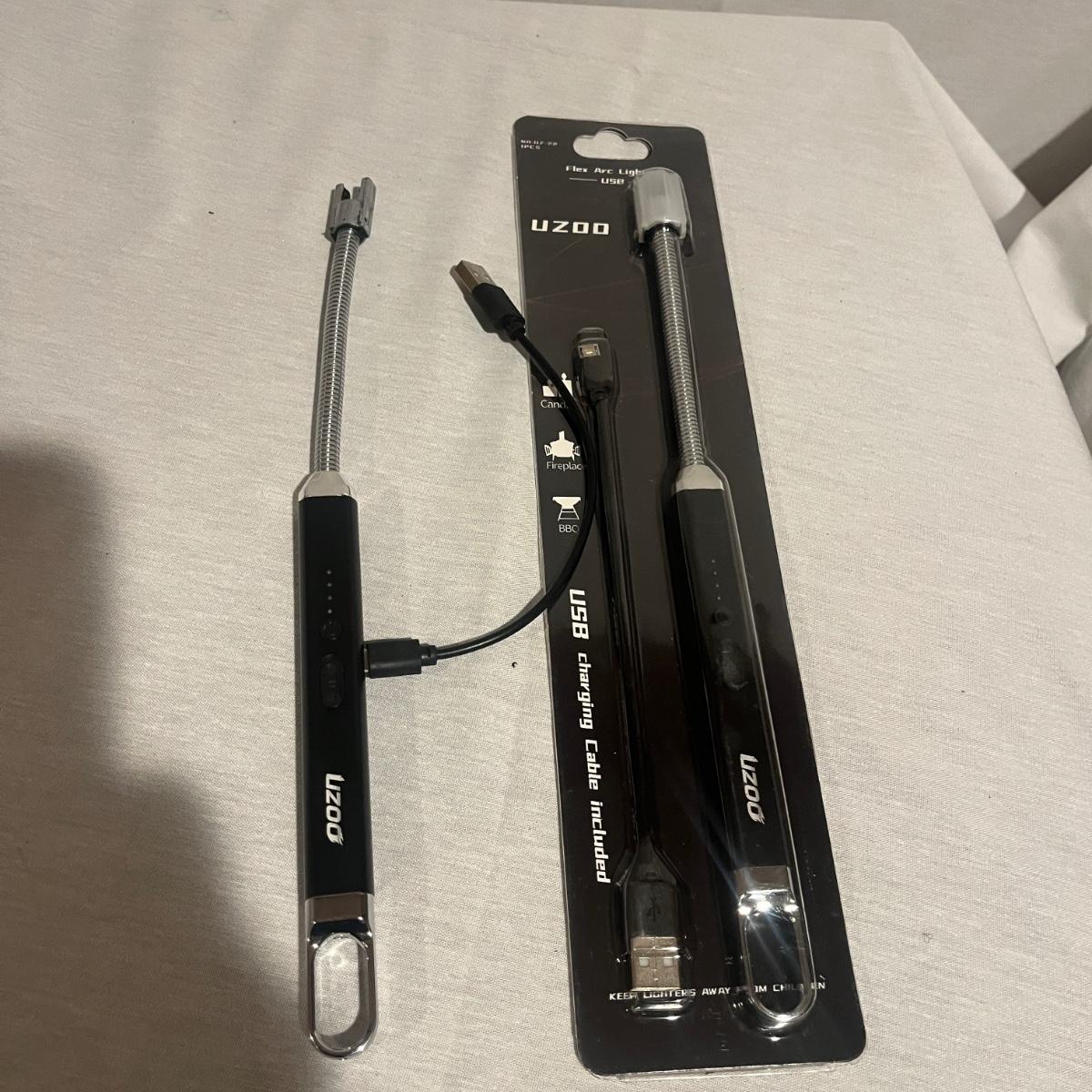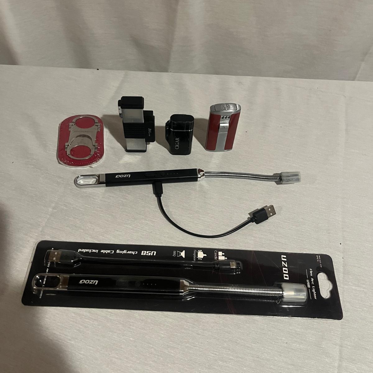 Lot includes two Uzoo Flex arc lighters and a Jet Line lighter. There are also two unmarked lighters and a Montecristo cigar cutter. The Uzoo lighter lit when button was pushed. The others did not. Uzoo lighter measures 11” long.