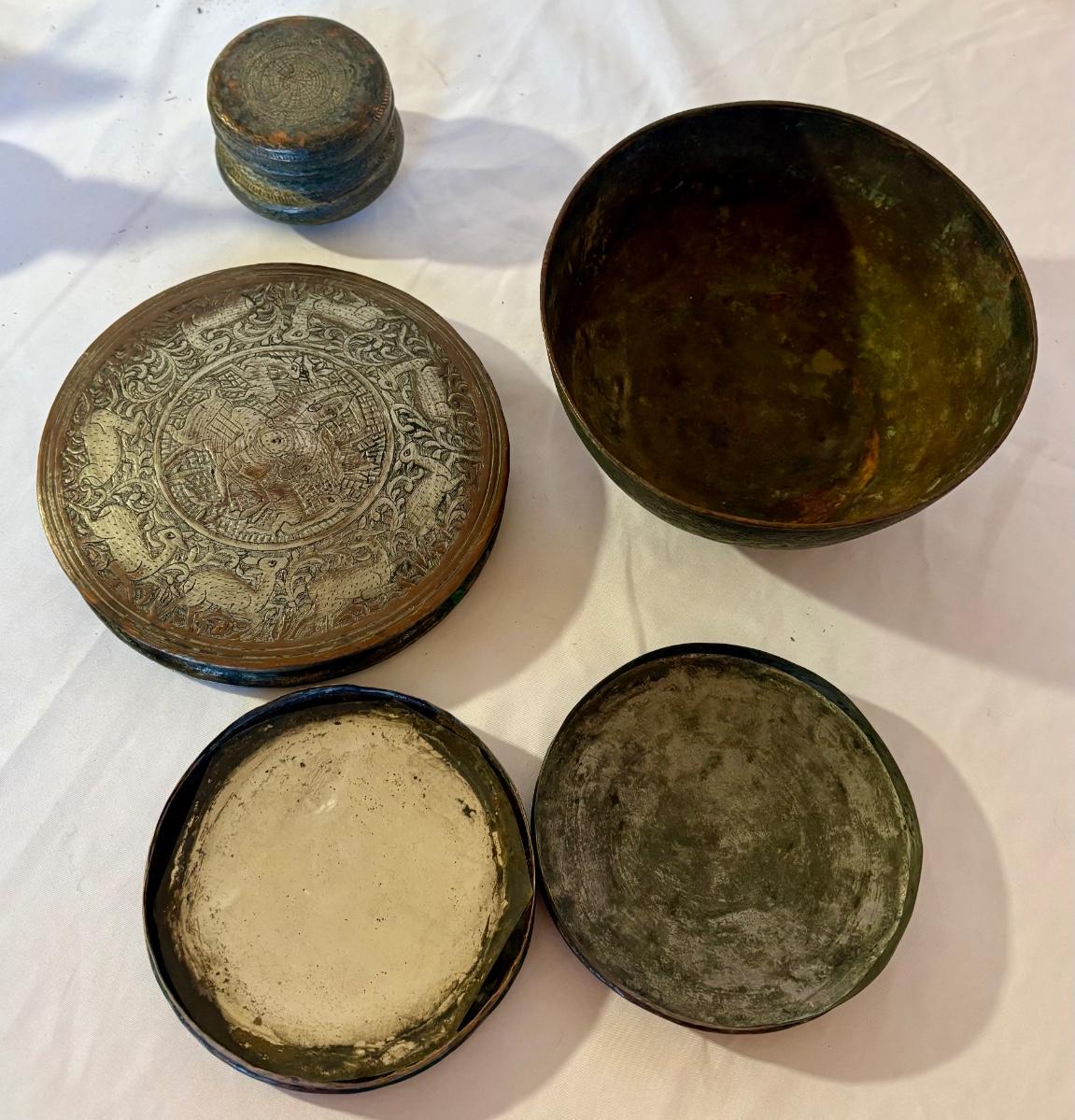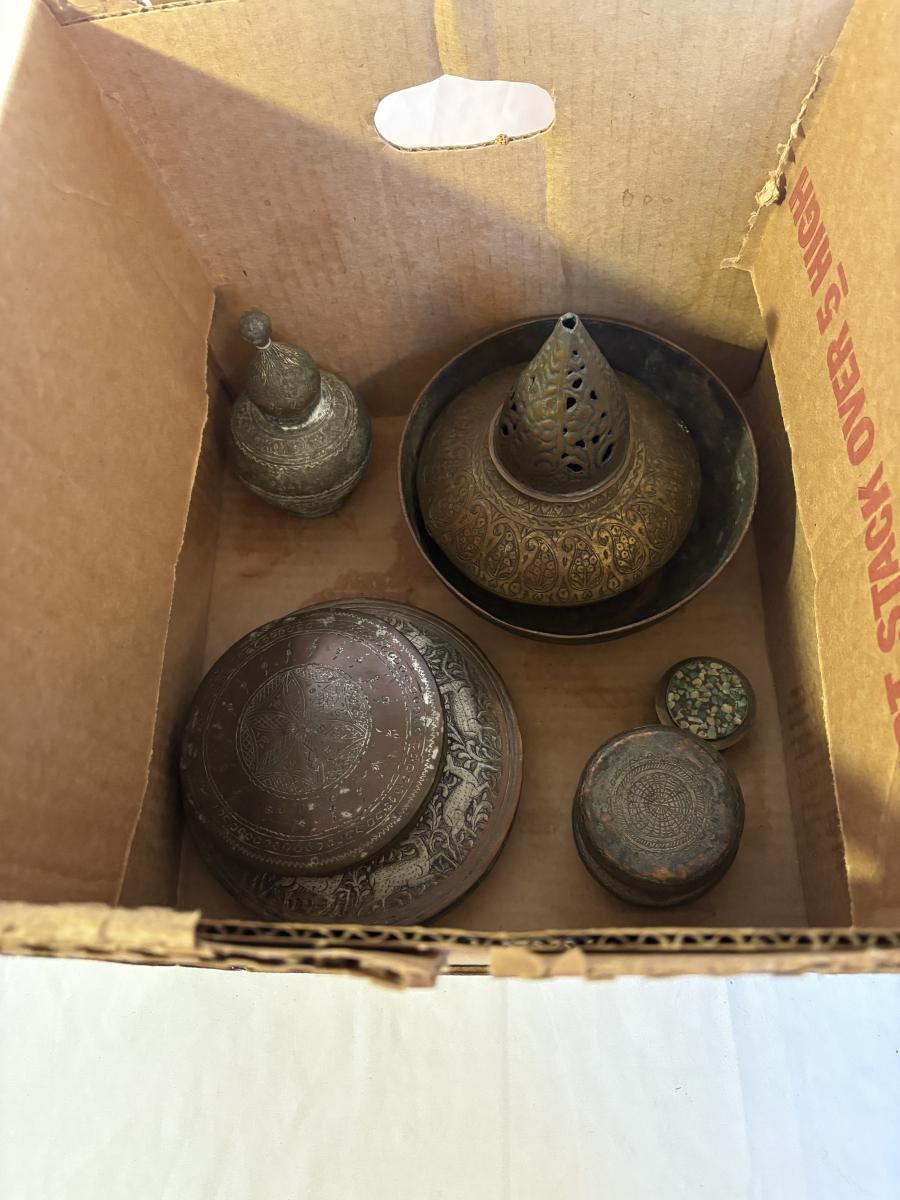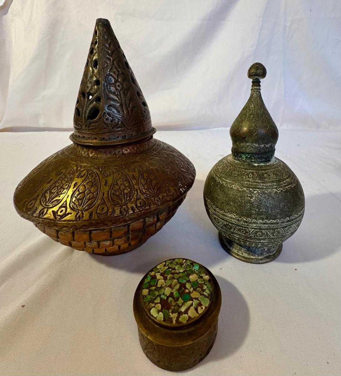 Middle Eastern and/or Indian look etched metal containers. Incense burner is 6”D at widest point and 7.5”H. Smallest piece is 2”D. Smaller round container holds a mirror. Shipping available.