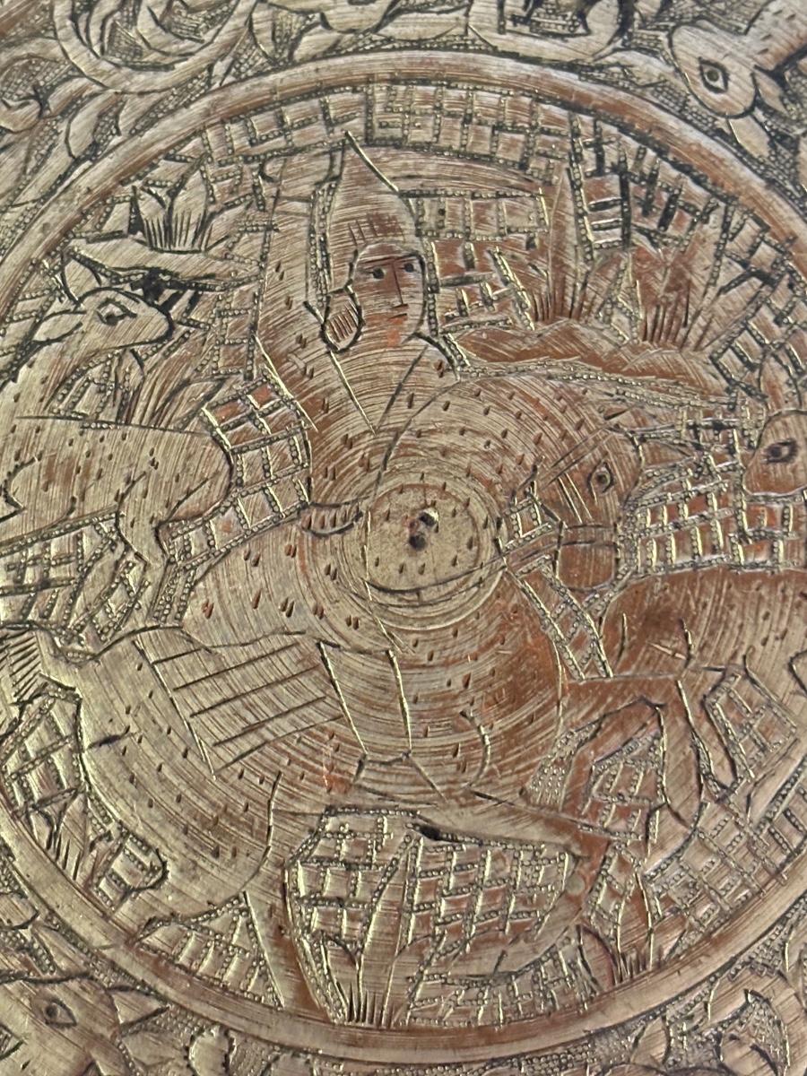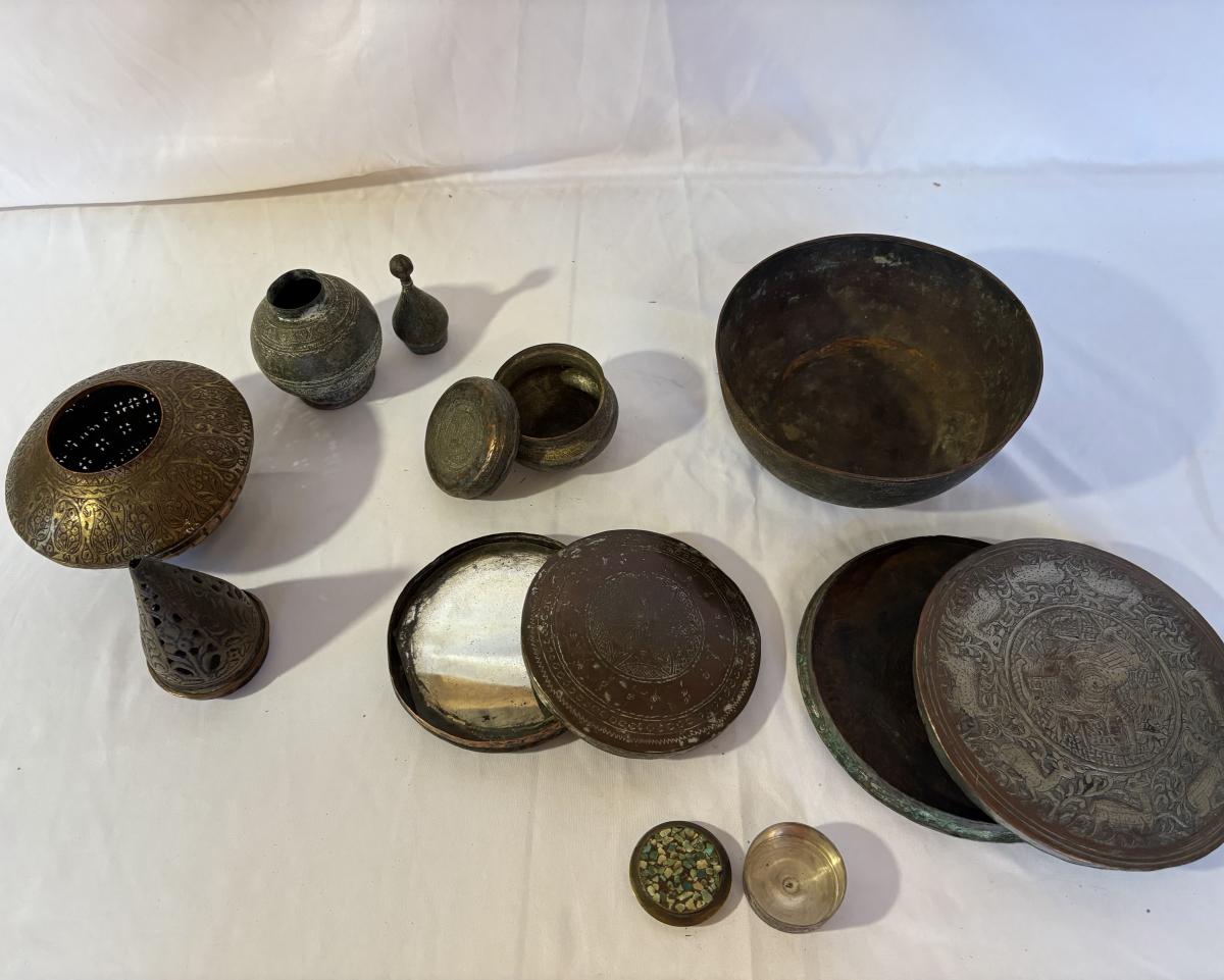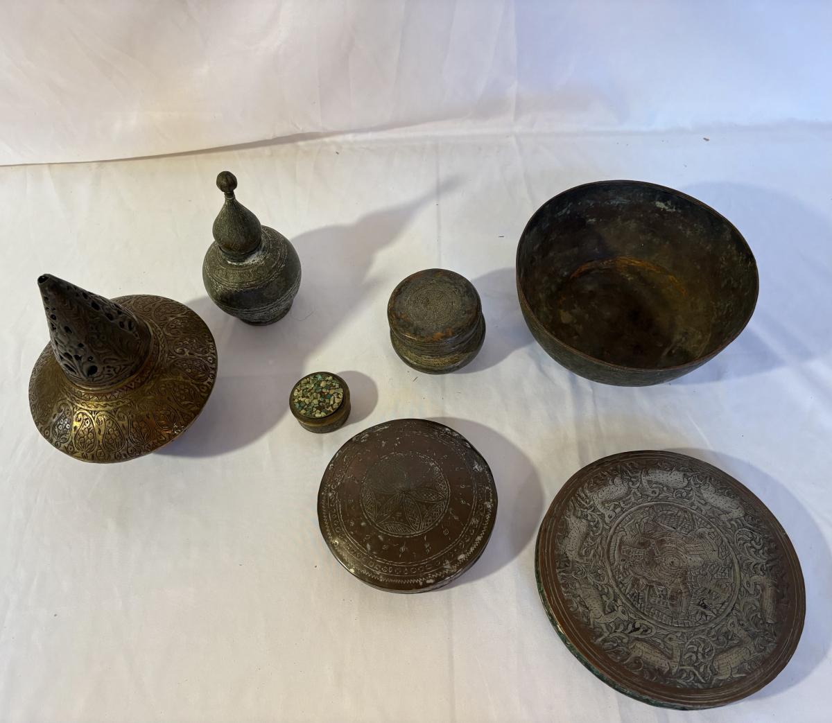 Middle Eastern and/or Indian look etched metal containers. Incense burner is 6”D at widest point and 7.5”H. Smallest piece is 2”D. Smaller round container holds a mirror. Shipping available.