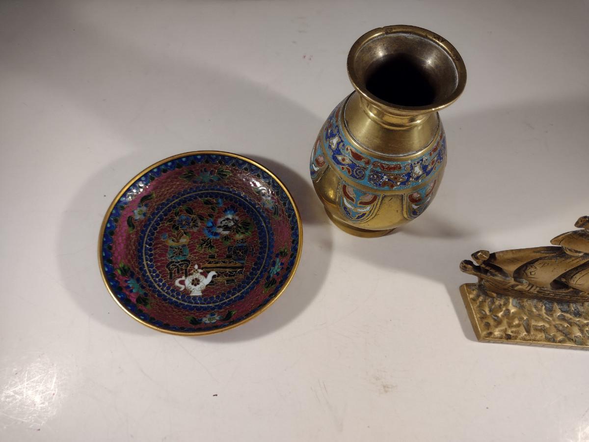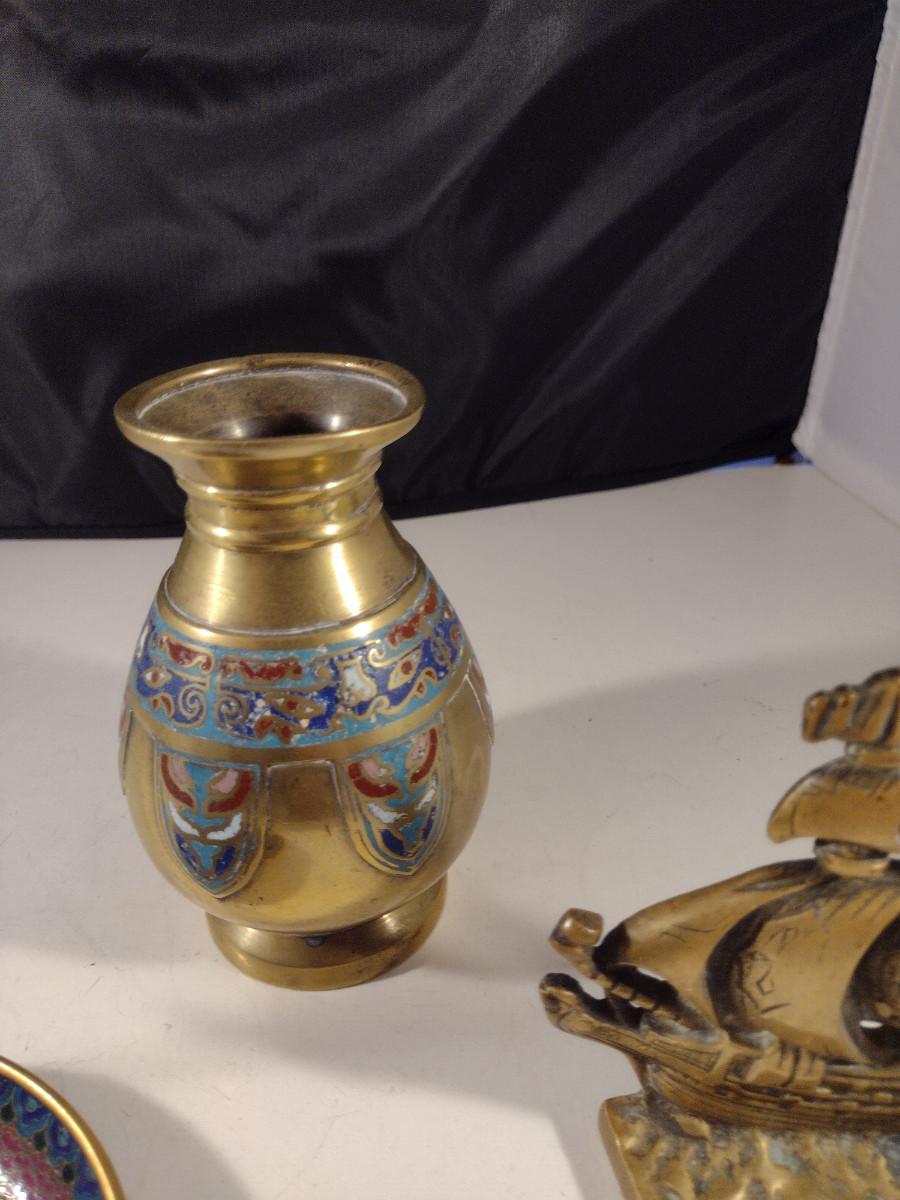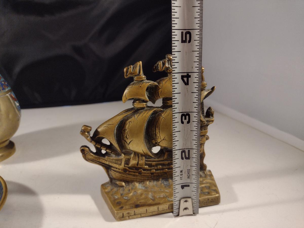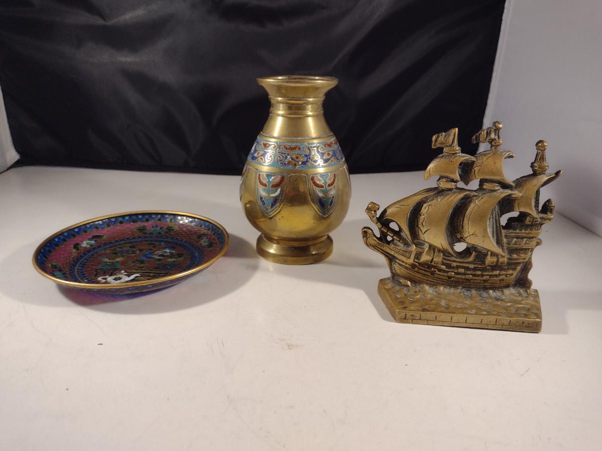 Collection of Metal Home Decor- Enameled Plate, Vase, Ship Design Bookend