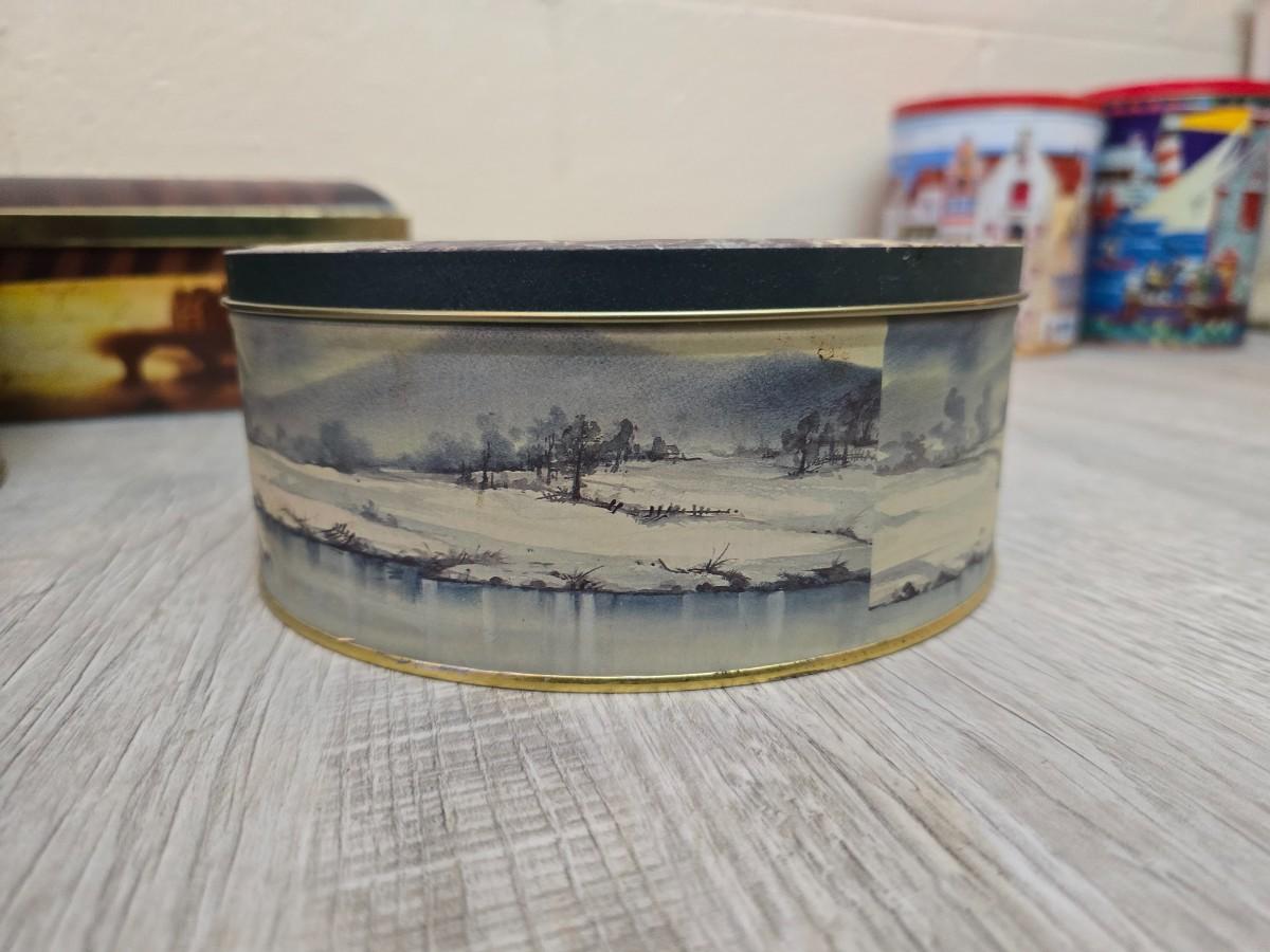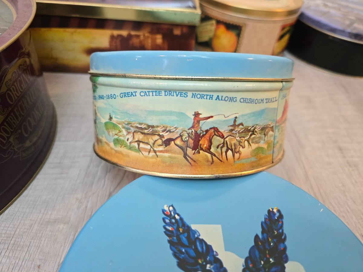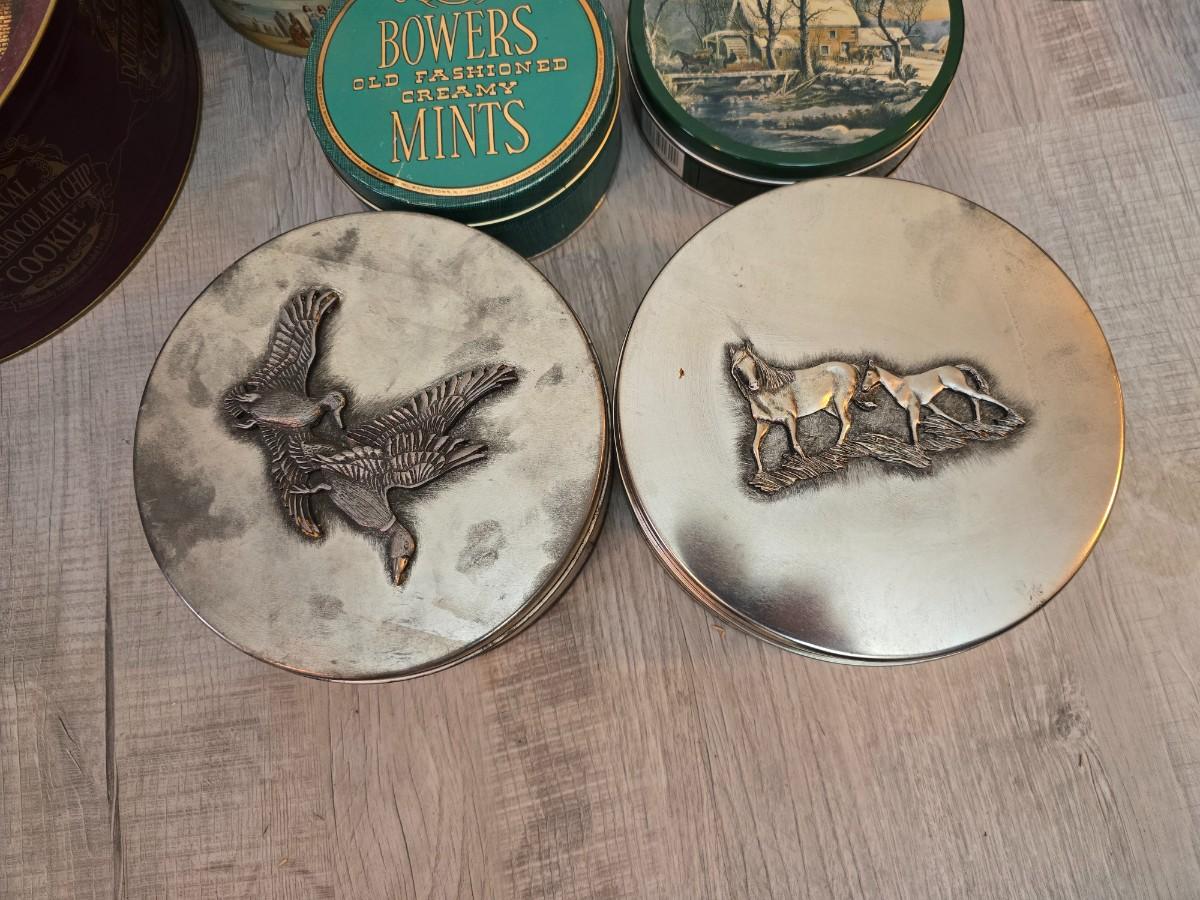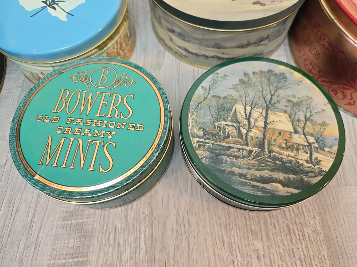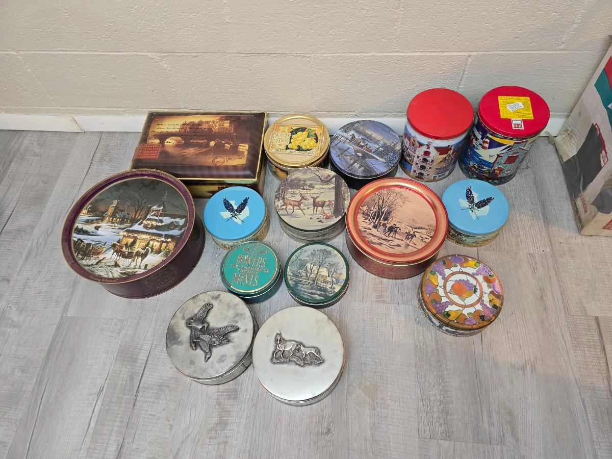 Collection of metal tins - Many with really neat country / farm scenes on them - some vintage