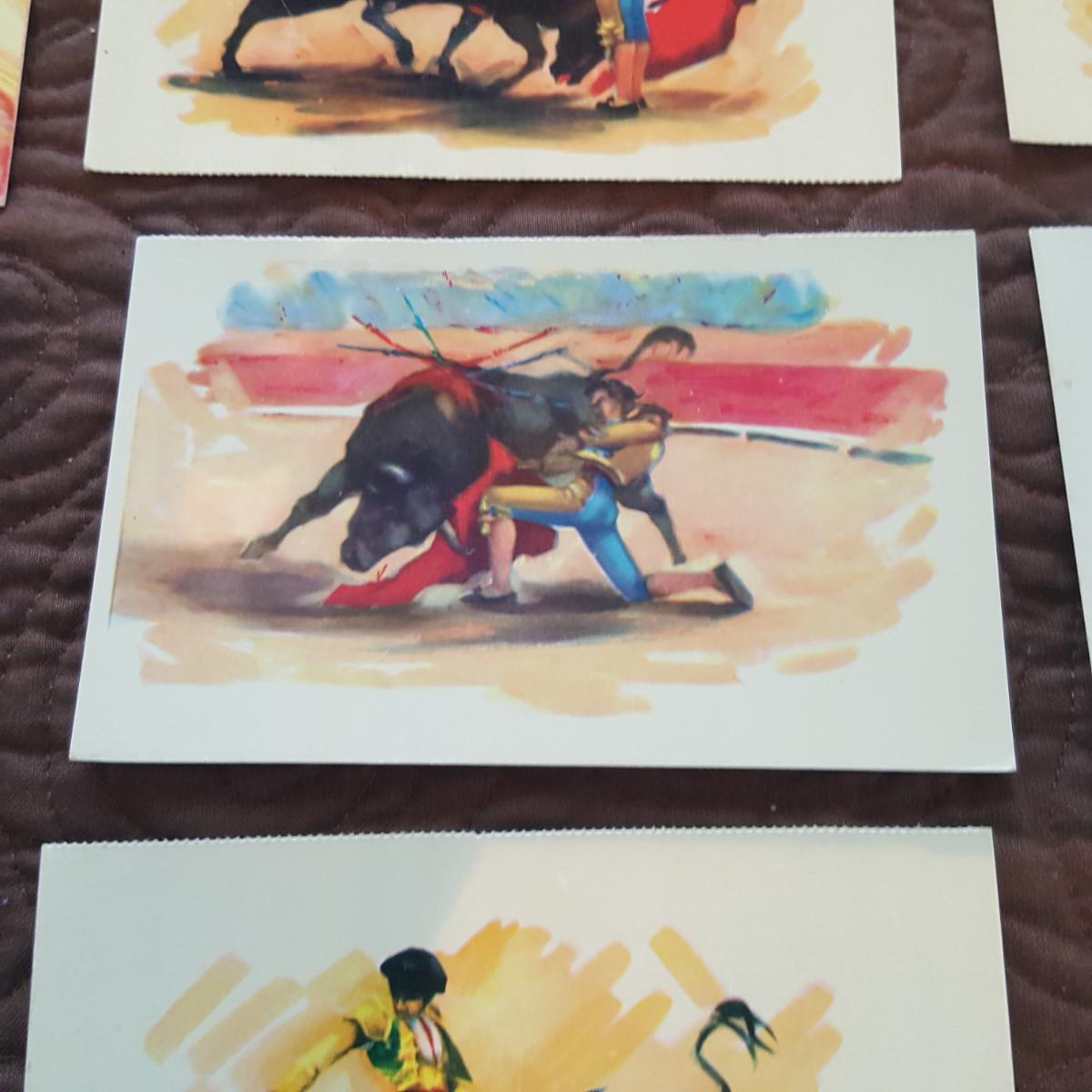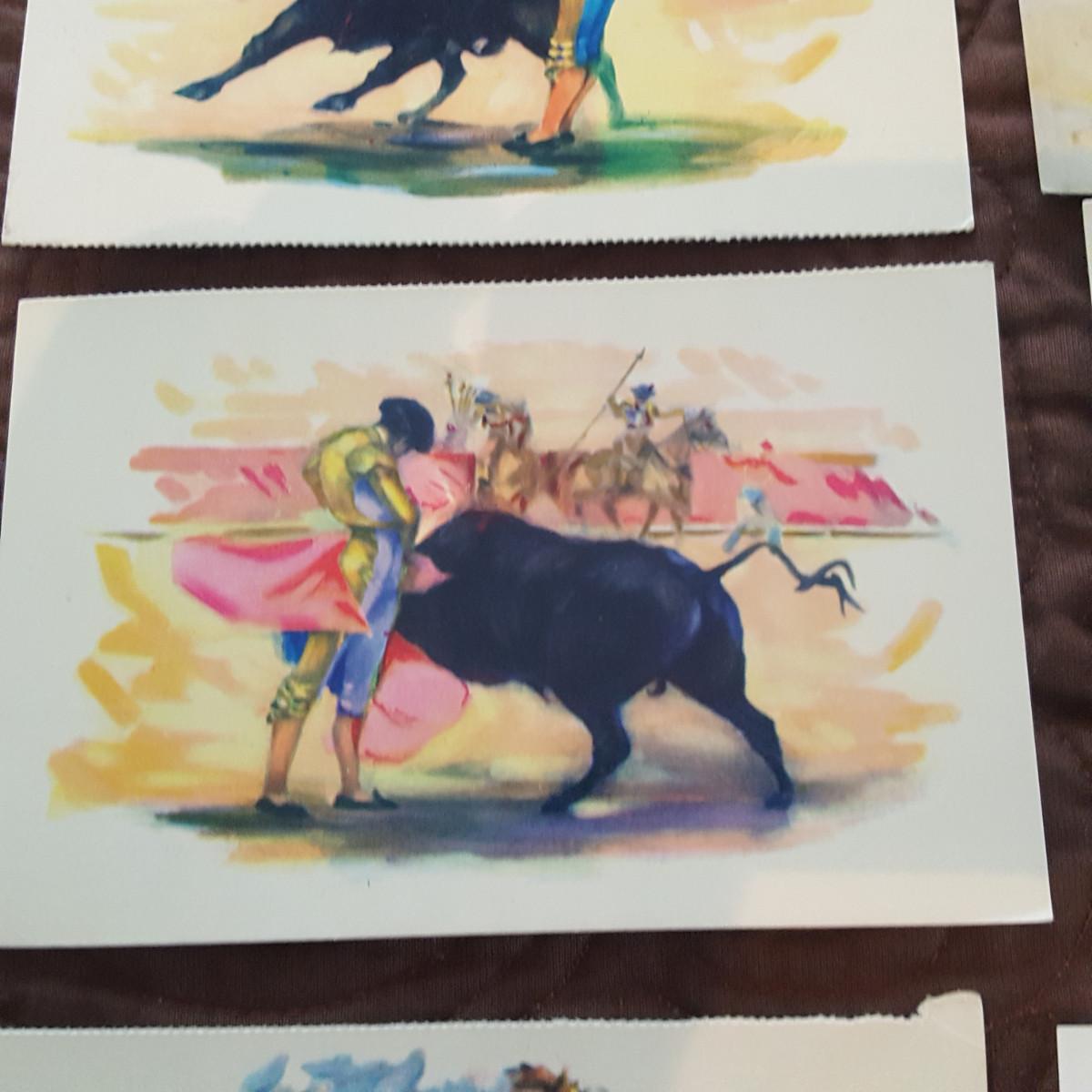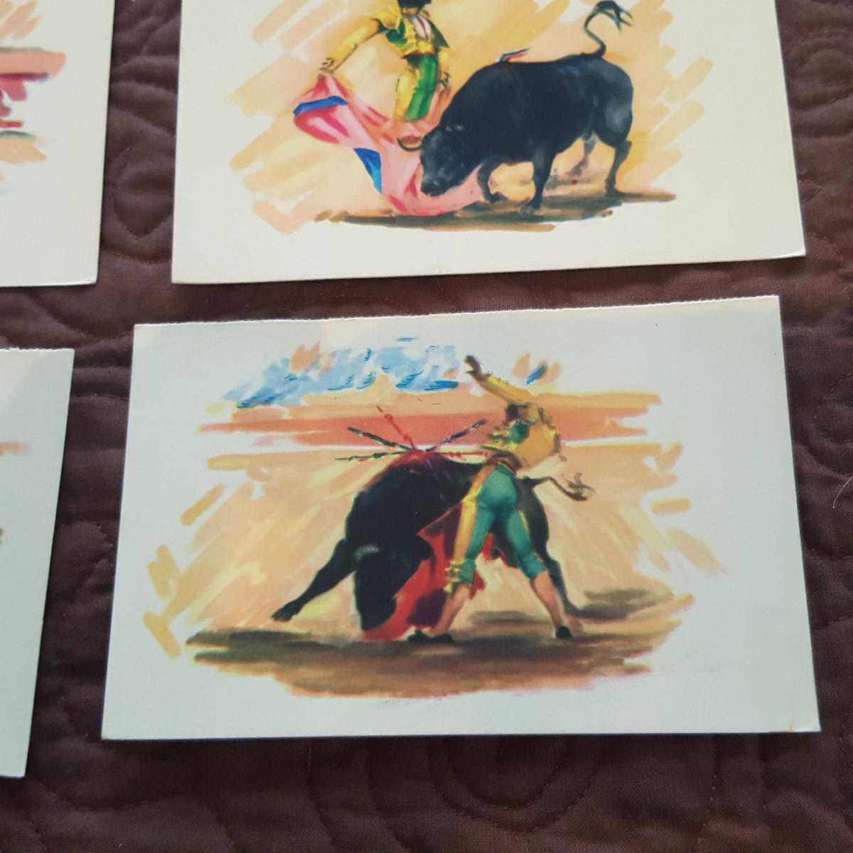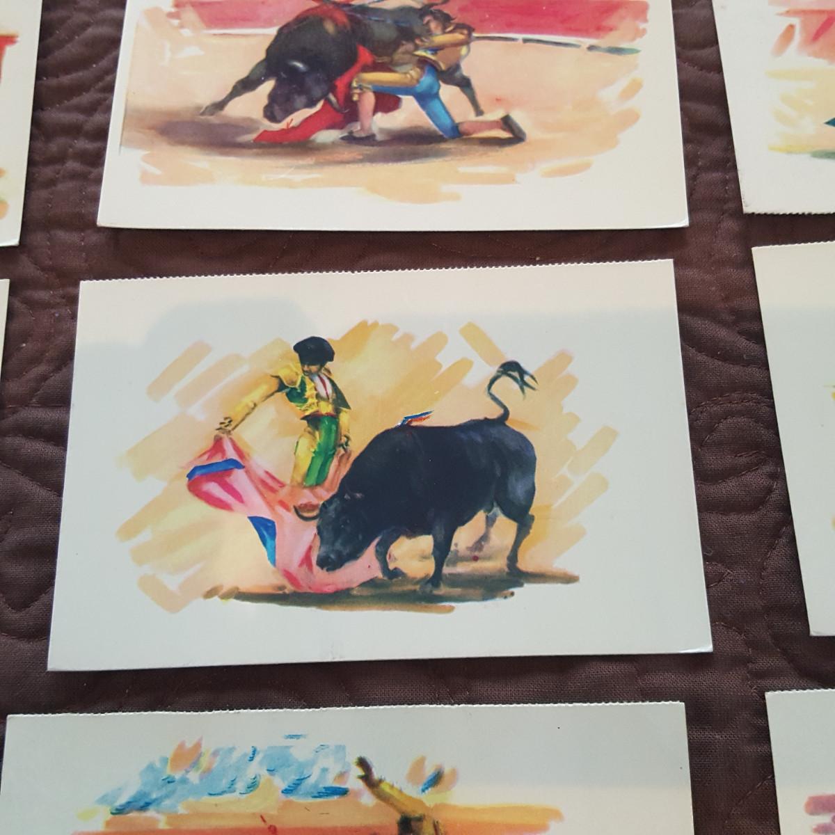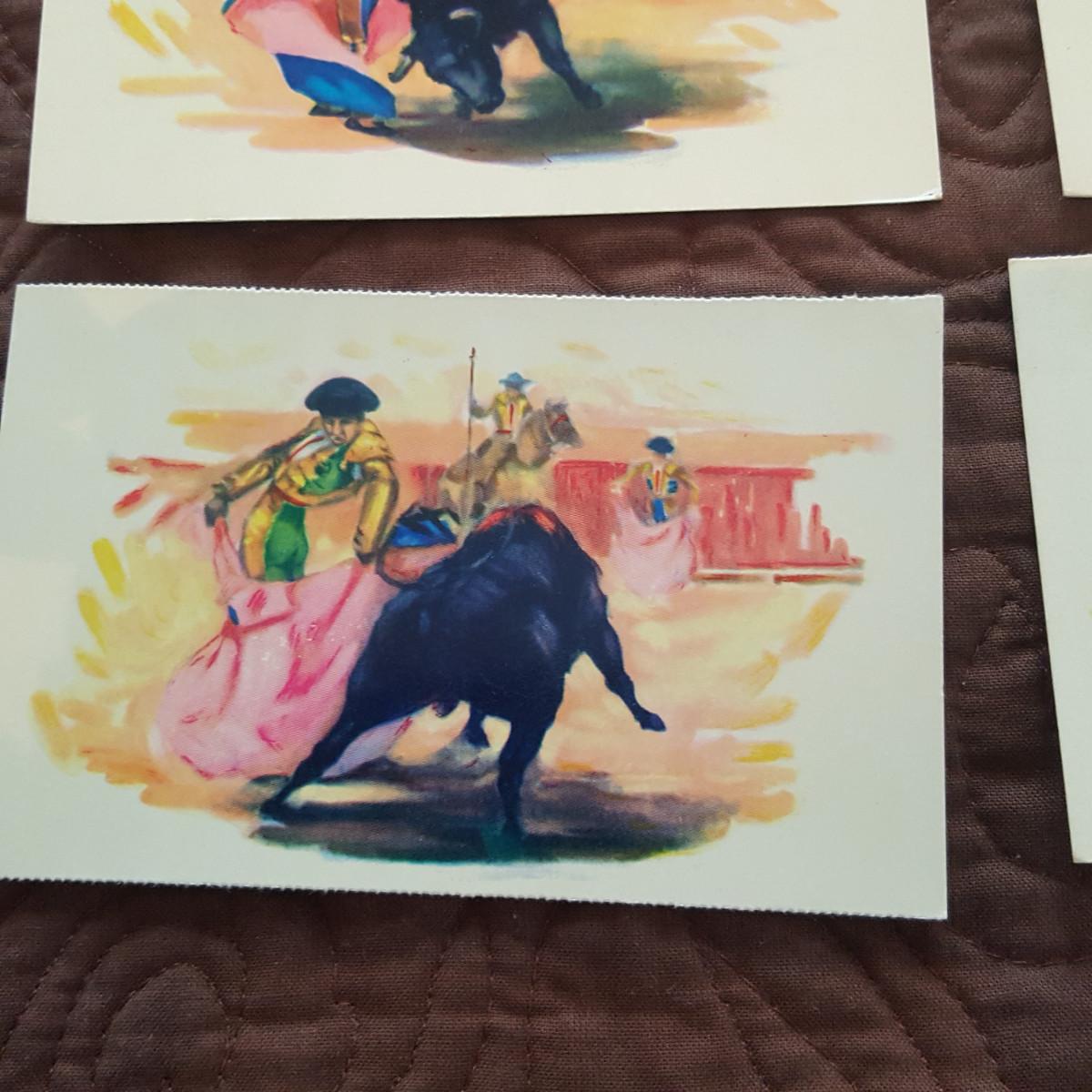 This auction lot is for a Collection of Mexican Bull Fight Art Postcards. The postcards were printed in Mexico and most probably a tourist purchase. The collection contains 22 different views. Most of the cards sport a perforated edge and appear that they once were part of a folder or of a larger printed sheet. They are in nice condition and could be just collected or used for many creative efforts.