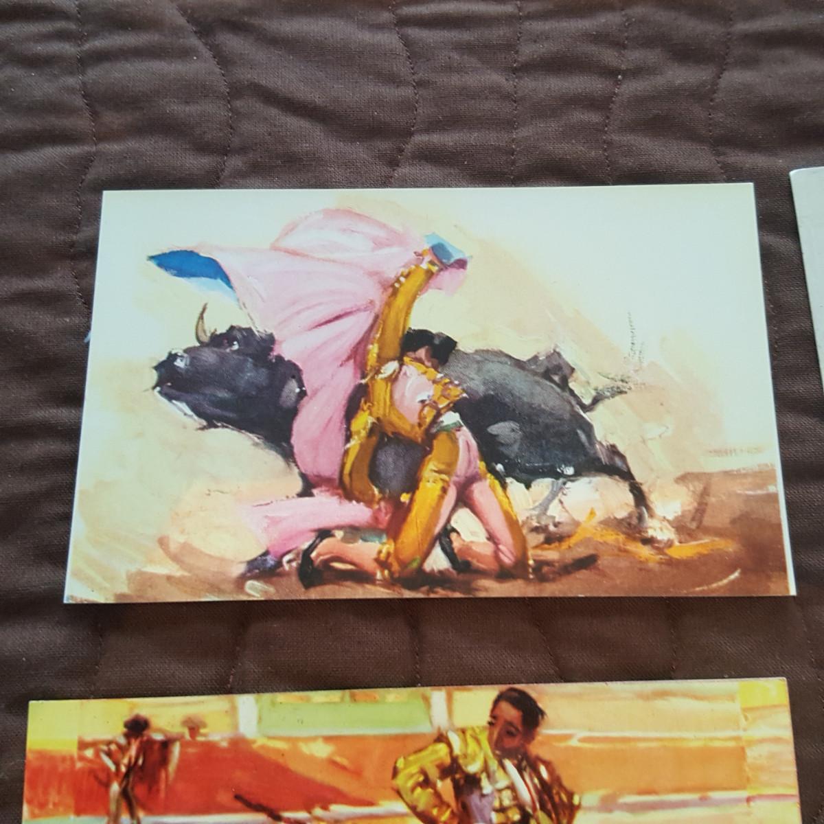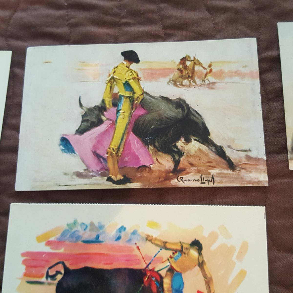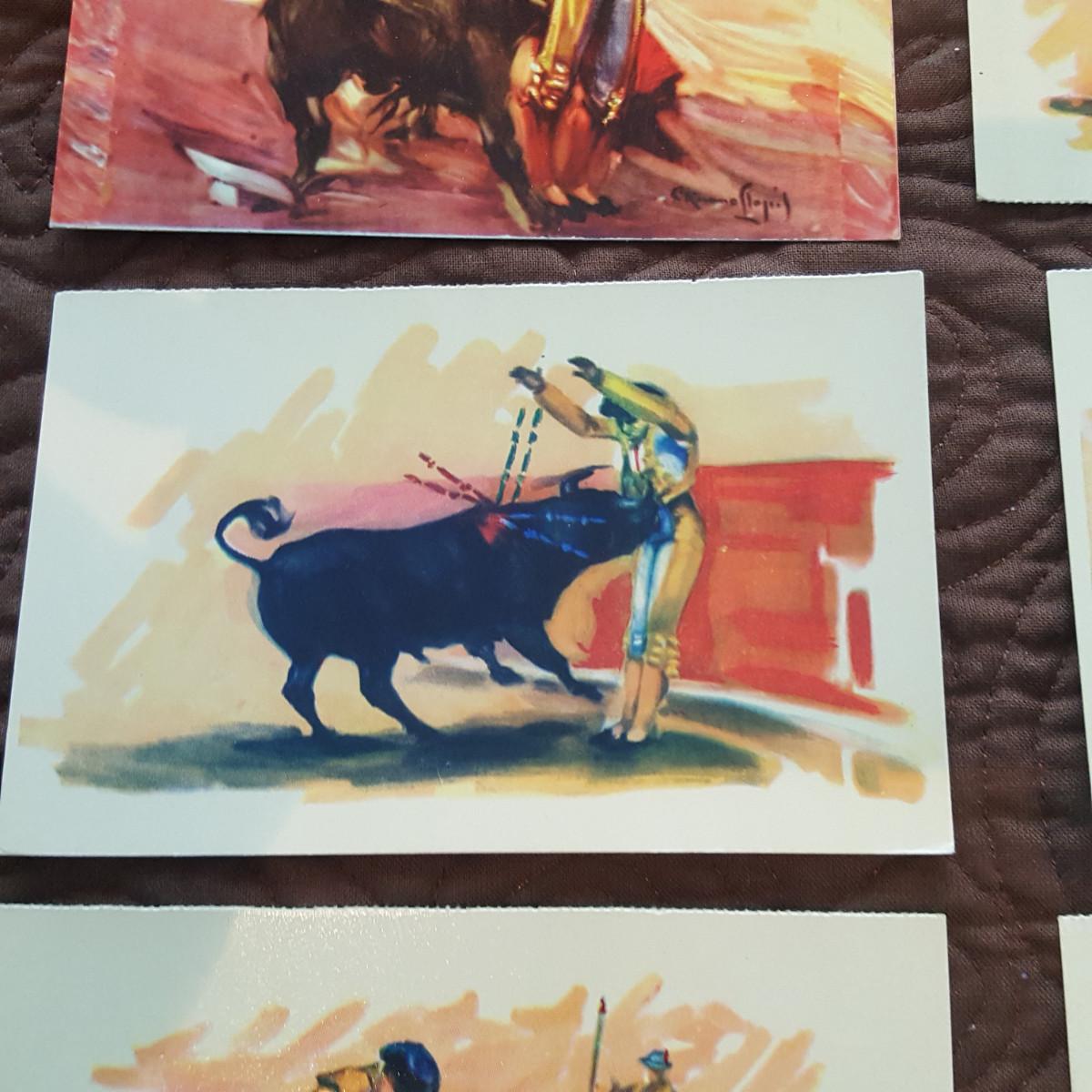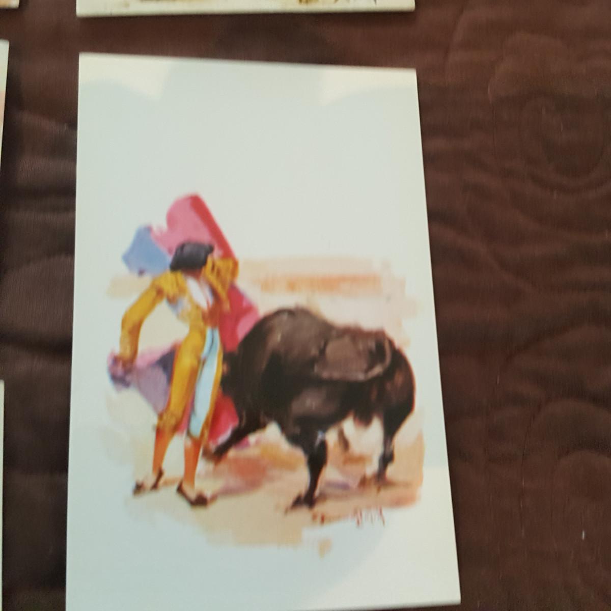 This auction lot is for a Collection of Mexican Bull Fight Art Postcards. The postcards were printed in Mexico and most probably a tourist purchase. The collection contains 22 different views. Most of the cards sport a perforated edge and appear that they once were part of a folder or of a larger printed sheet. They are in nice condition and could be just collected or used for many creative efforts.