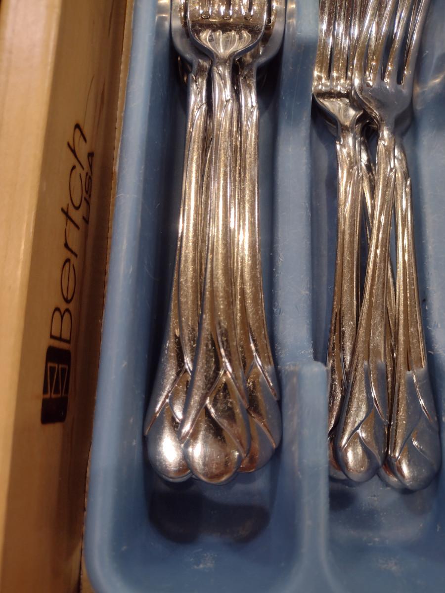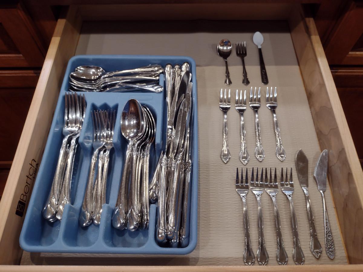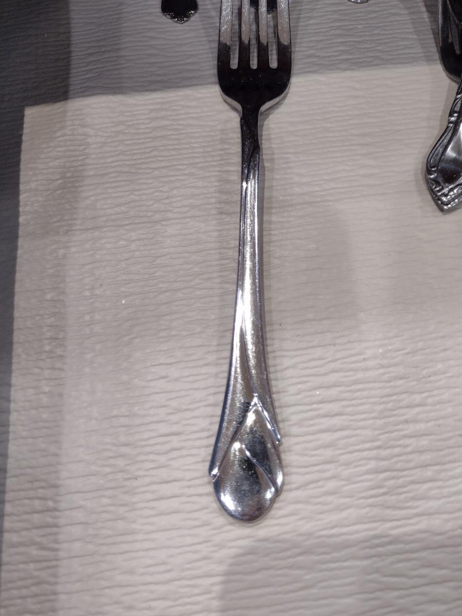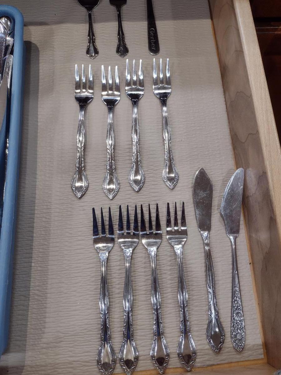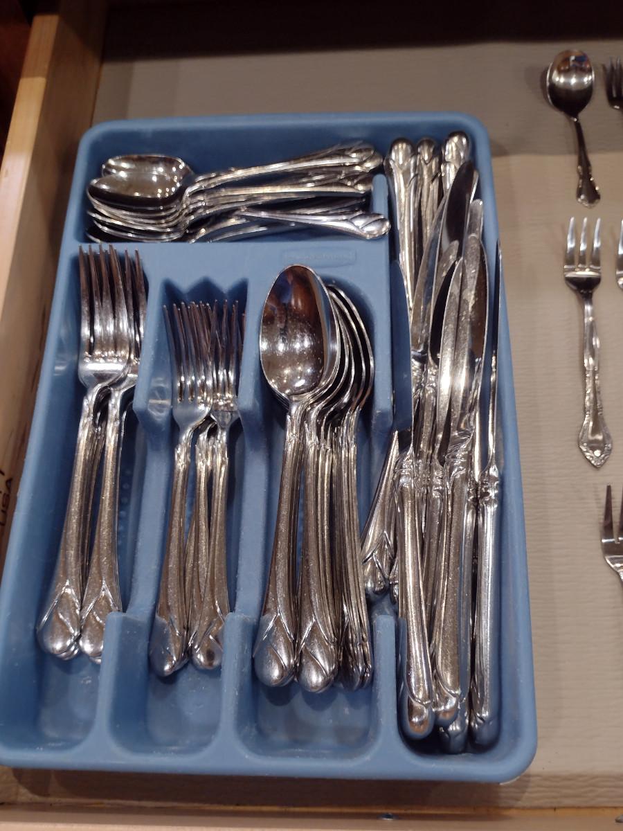 Collection of Mikasa Stainless Flatware- Gerald Patrick Pattern- Approx 59 Pieces. Includes: dinner fork- 9, salad fork- 6, knife- 16, small spoon- 14, large spoon- 14. Also includes other mismatched pieces shown in pictures. Seafood forks are Rogers.