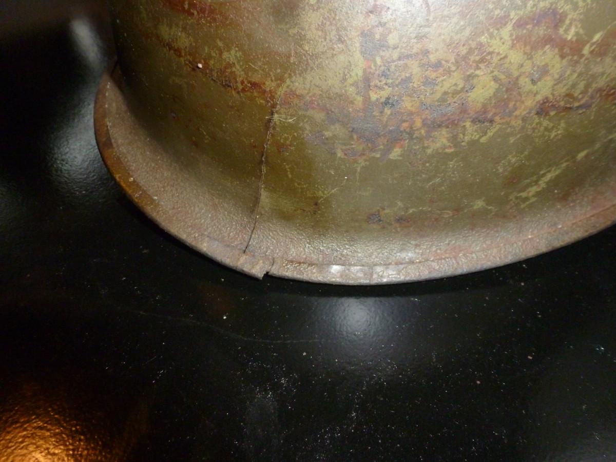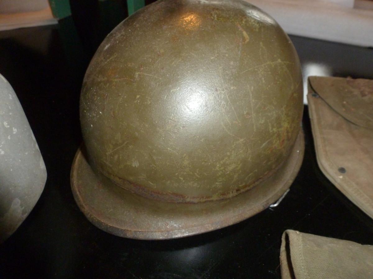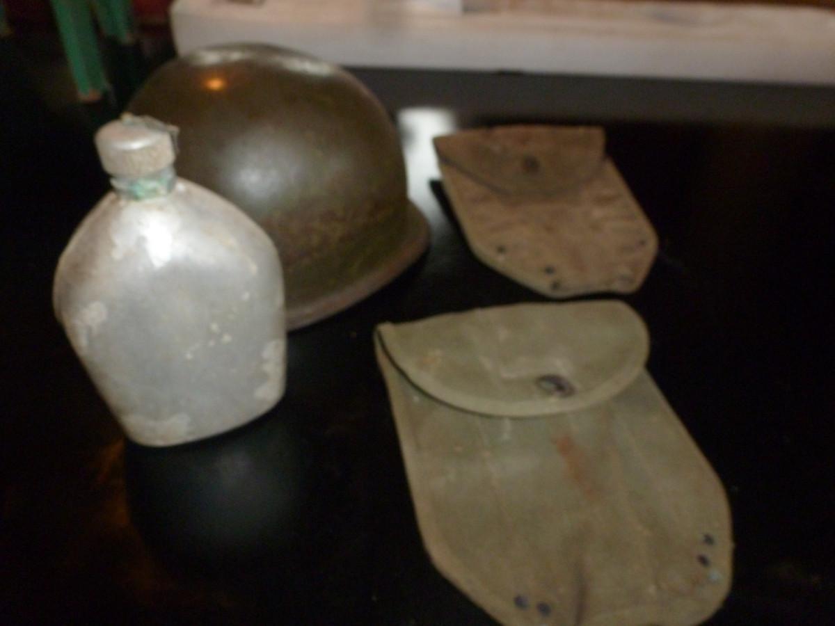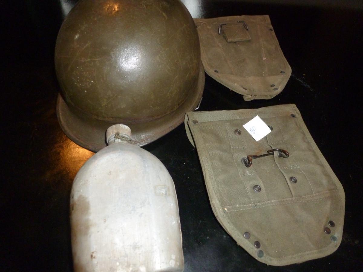 Collection of Militaria. Korean War helmet, WWI water canteen, two WWII shovel covers.