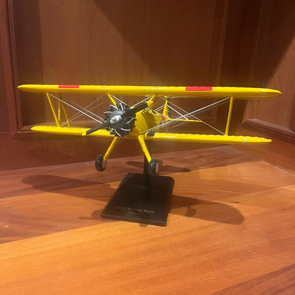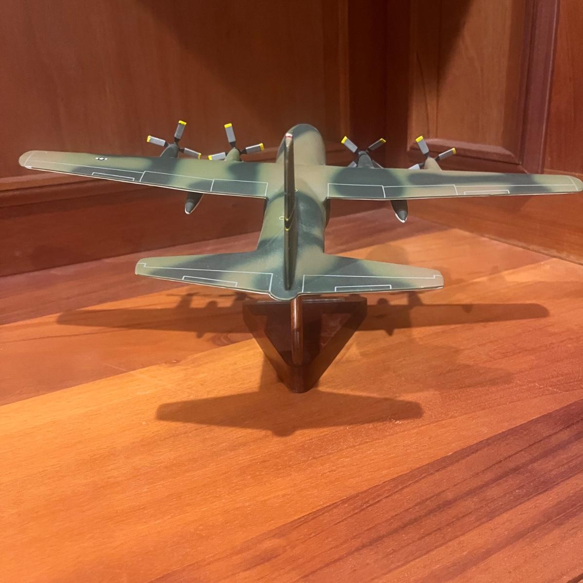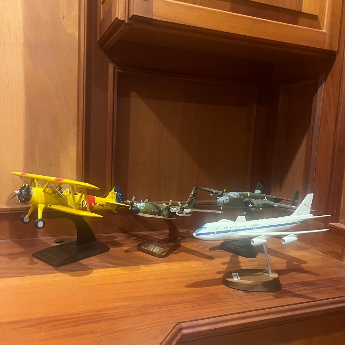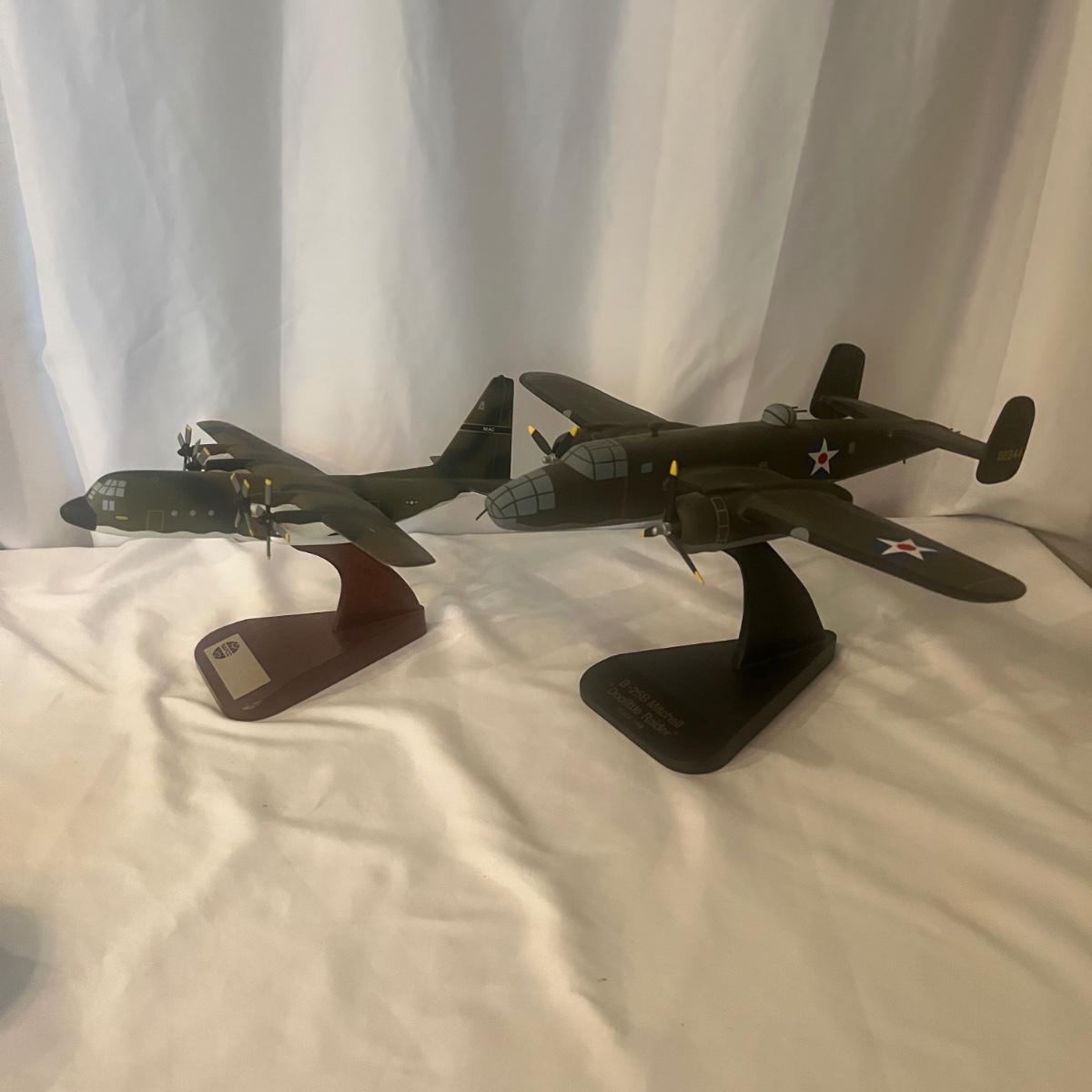 This collection of models includes a Boeing E-4B, C-130, B-25B and a N2S Yellow Peril biplane. The biplane measures 16” x 13” x 8”H and appears to be resin. The other three planes appear to be wooden.