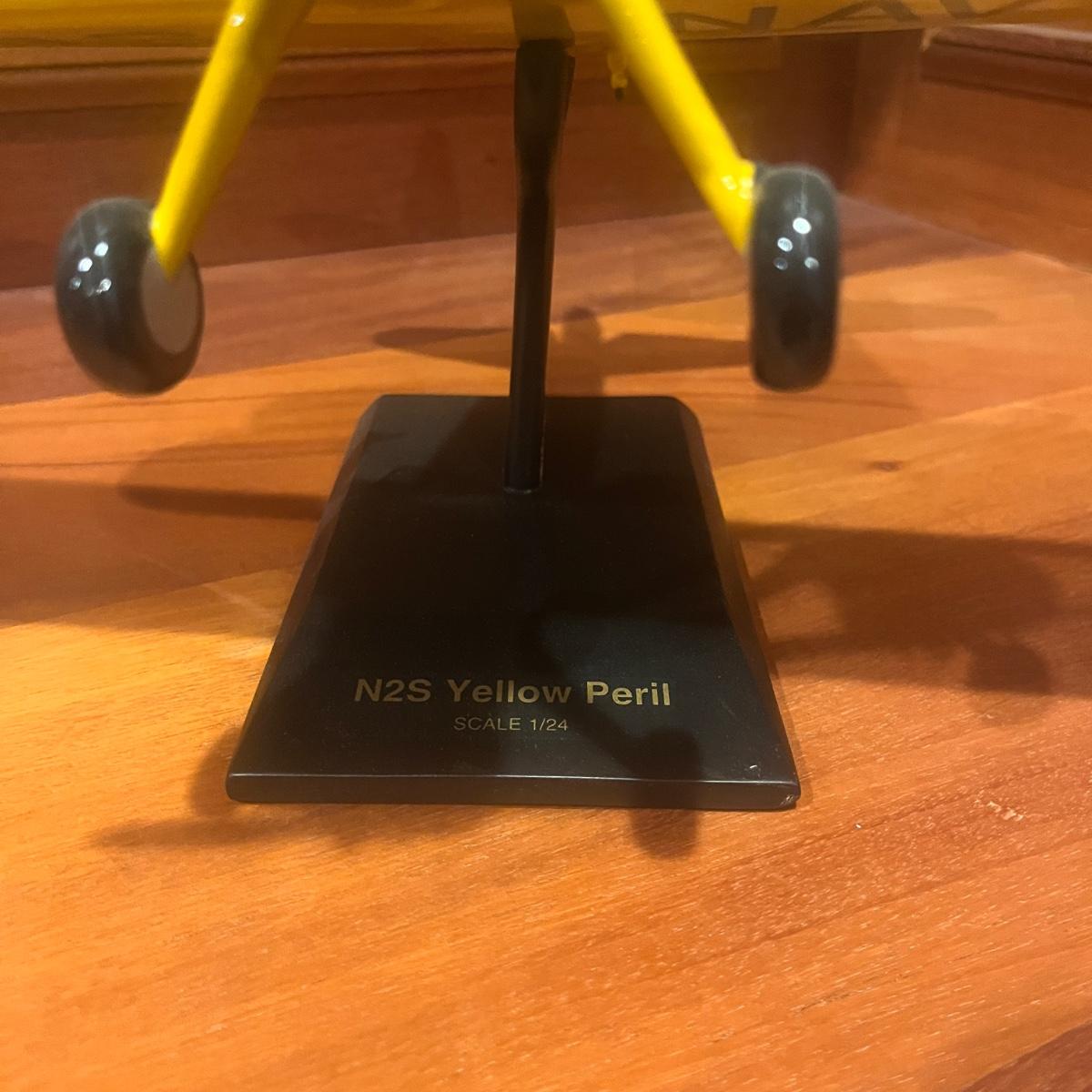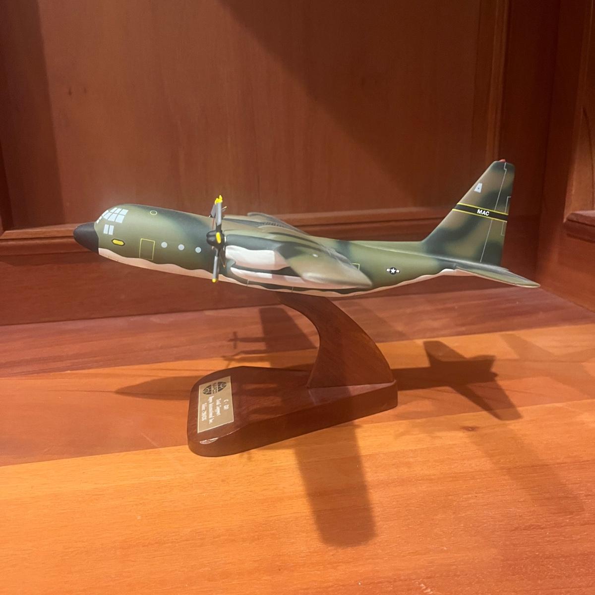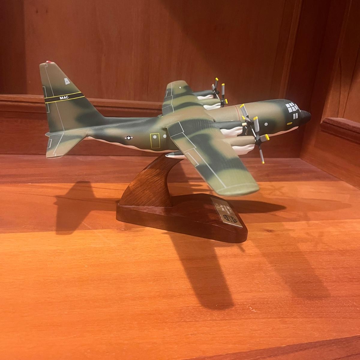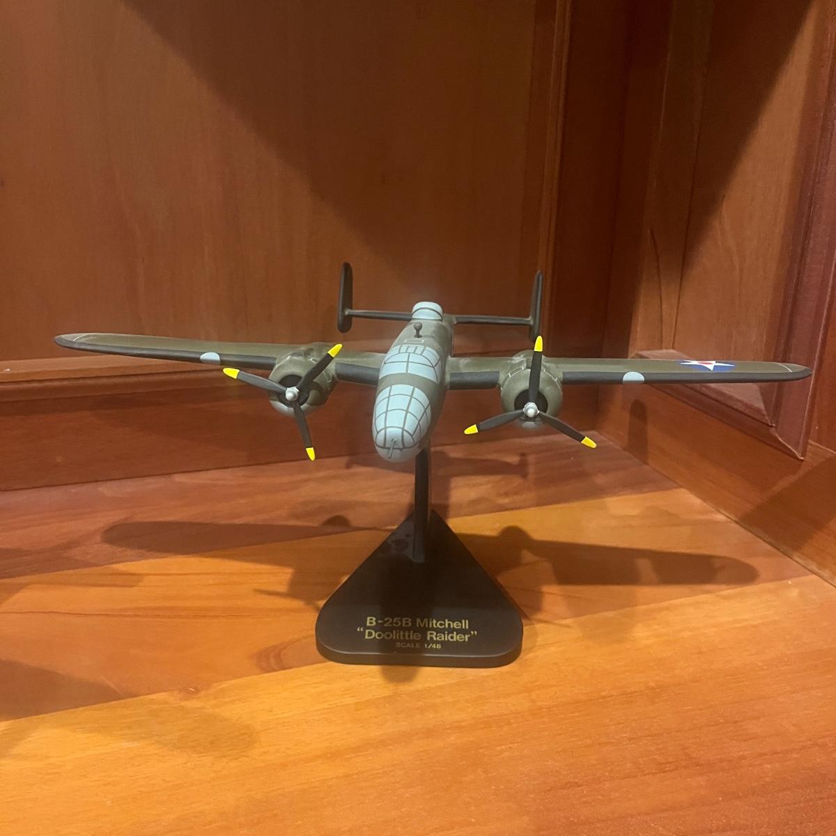 This collection of models includes a Boeing E-4B, C-130, B-25B and a N2S Yellow Peril biplane. The biplane measures 16” x 13” x 8”H and appears to be resin. The other three planes appear to be wooden.
