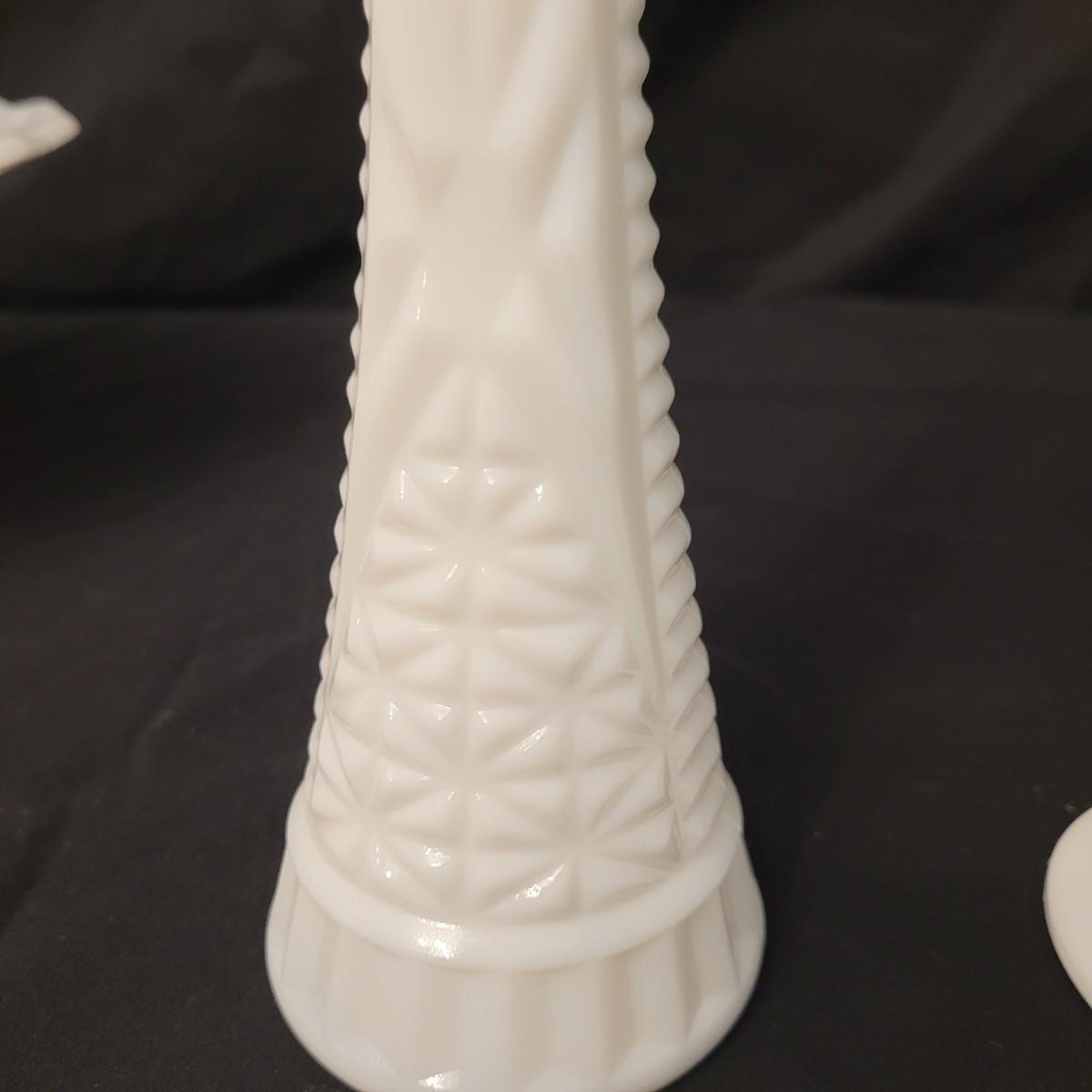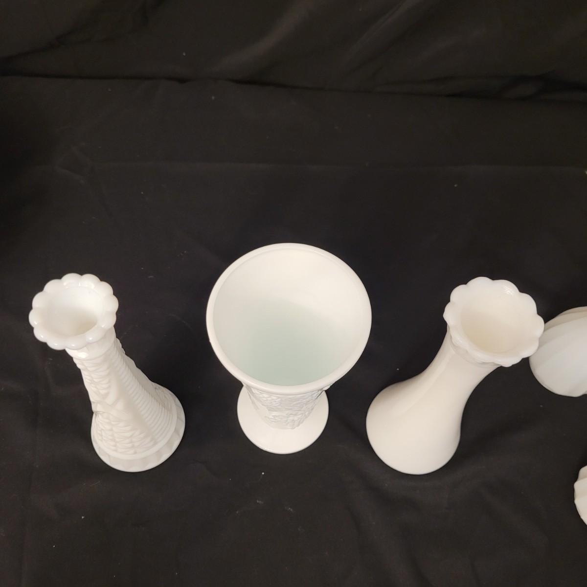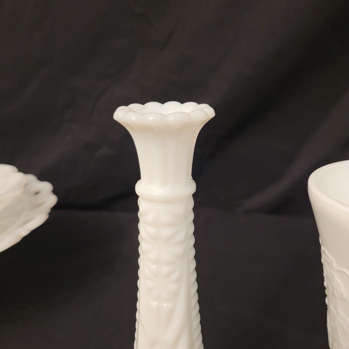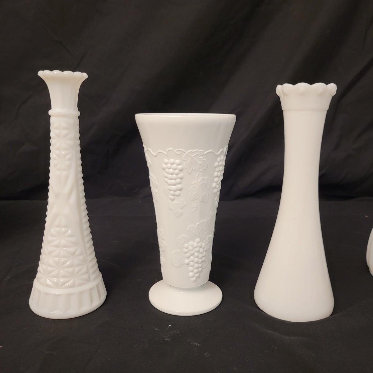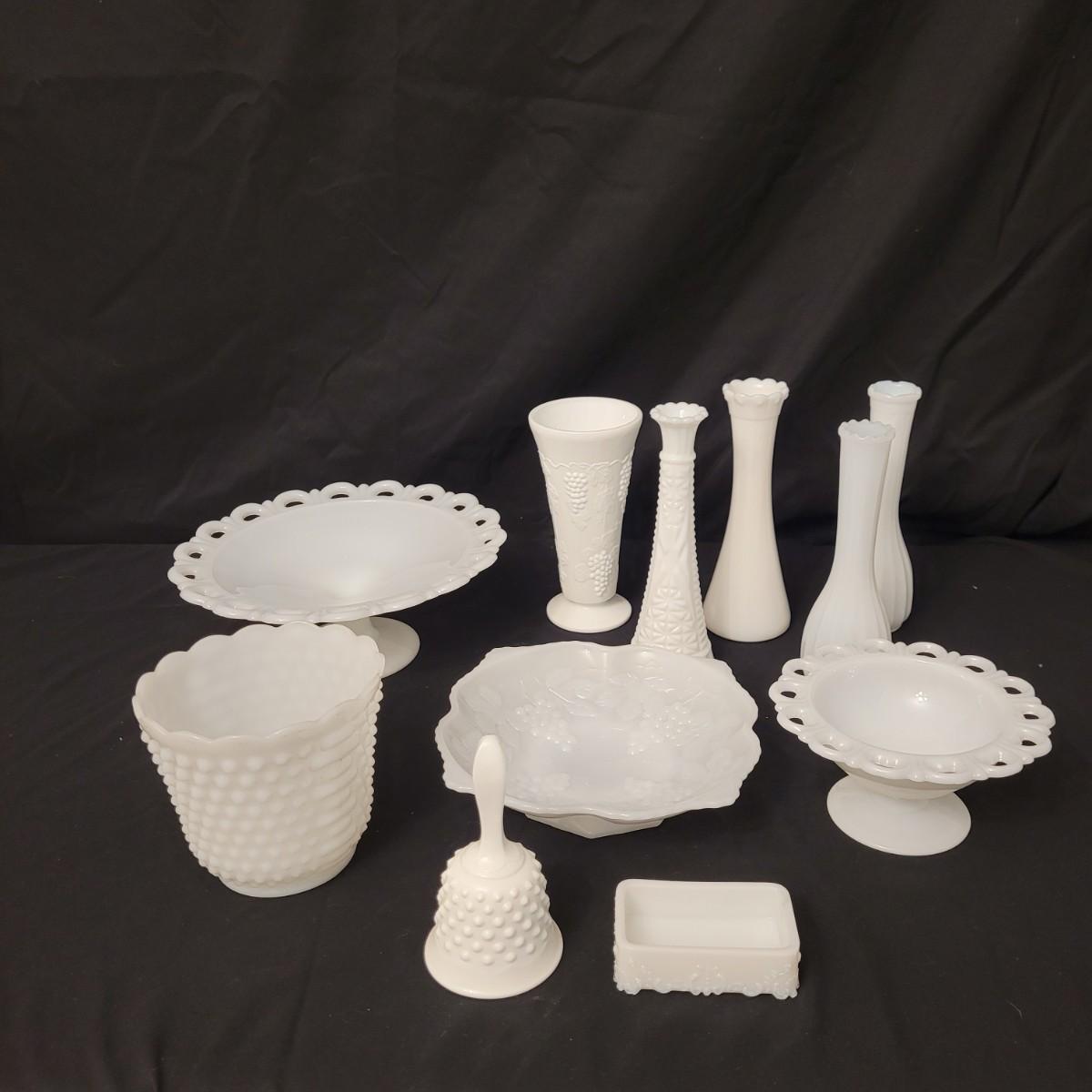Eleven piece collection of milk and white glass items, including a large serving stand, two serving bowls, a wide mouth vase, five narrow vases, a soap dish and ringing bell. Items are in good condition with very few chips and are only slightly dirty (see photos). Serving stand measures approximately 11"DIA x 4.5"H. Shipping available.