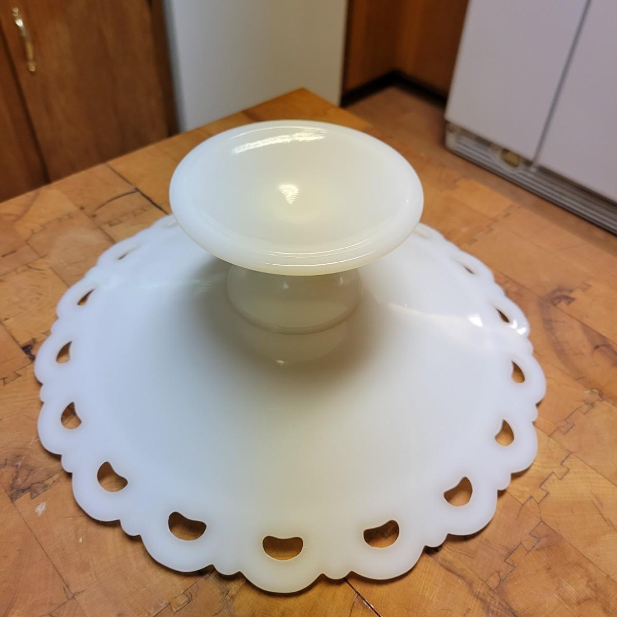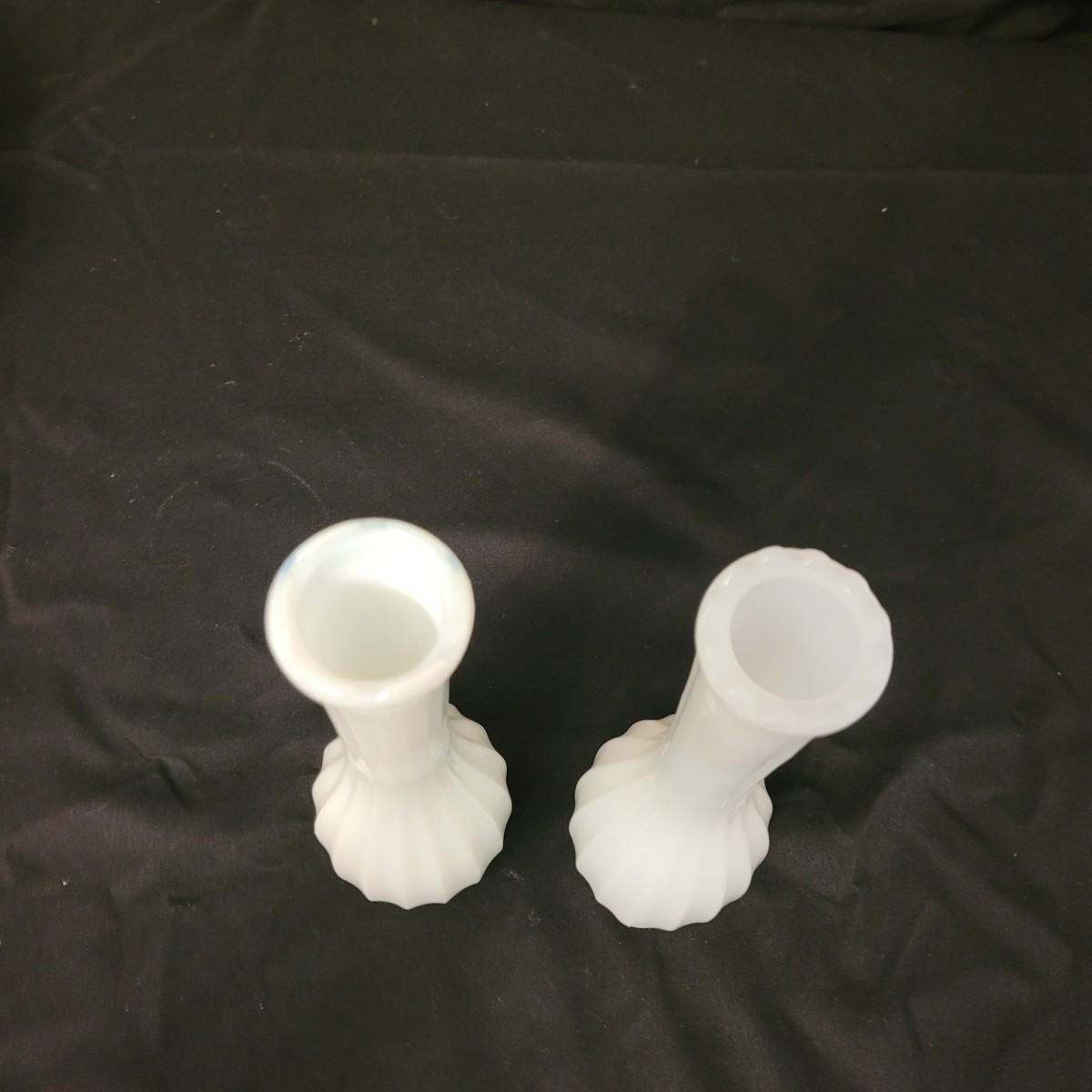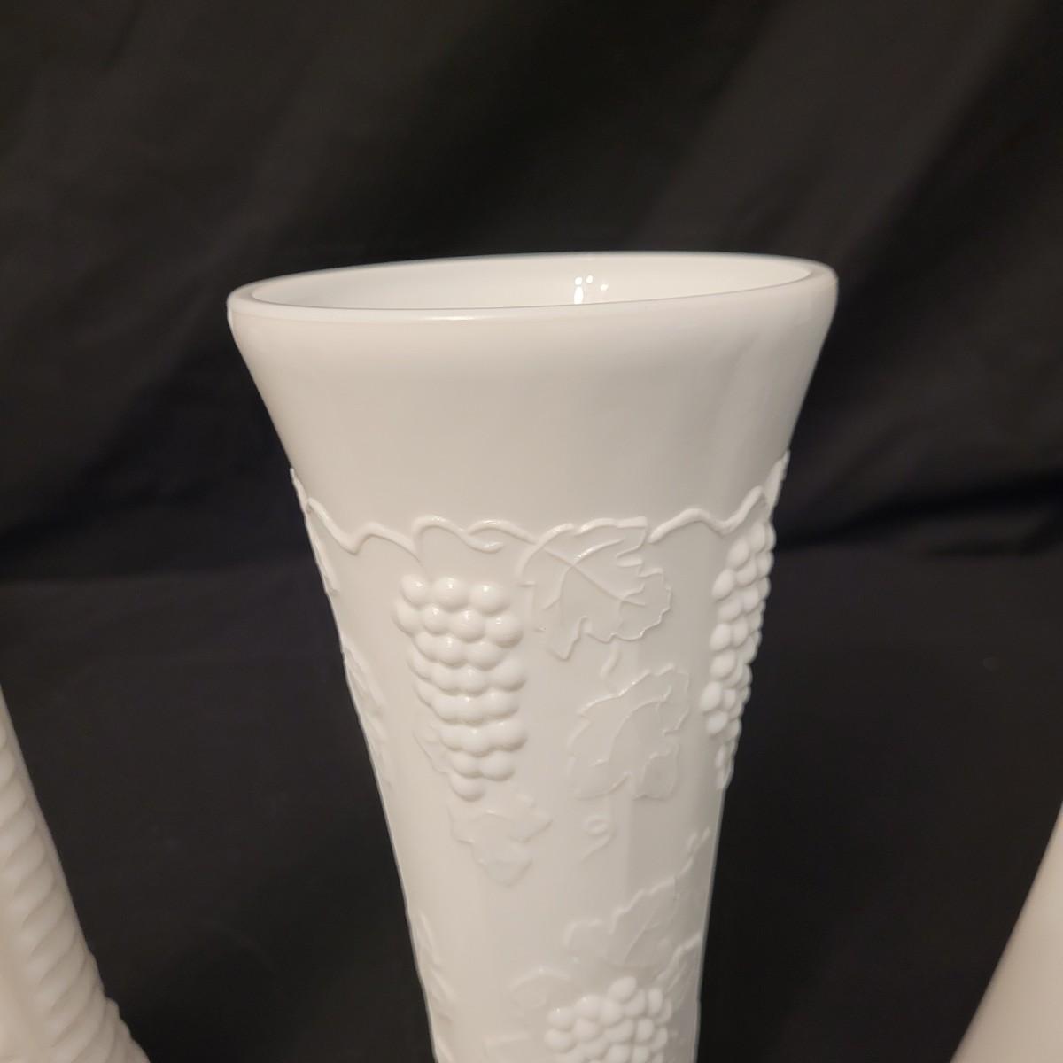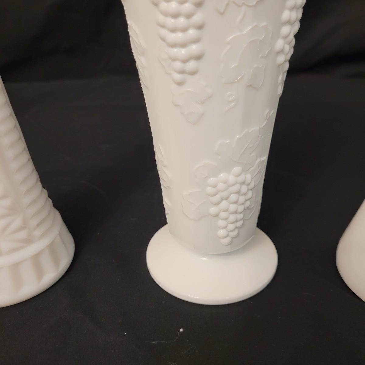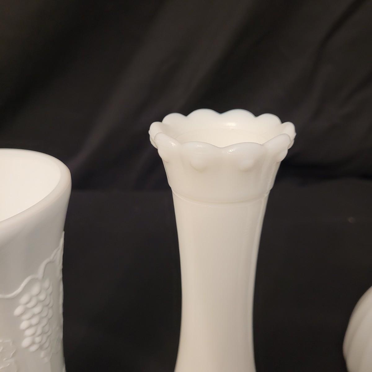 Eleven piece collection of milk and white glass items, including a large serving stand, two serving bowls, a wide mouth vase, five narrow vases, a soap dish and ringing bell. Items are in good condition with very few chips and are only slightly dirty (see photos). Serving stand measures approximately 11"DIA x 4.5"H. Shipping available.