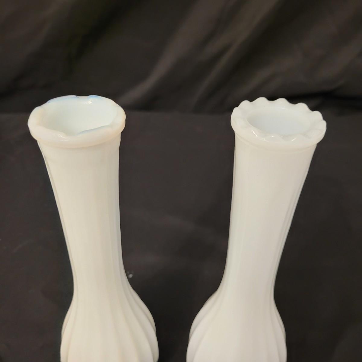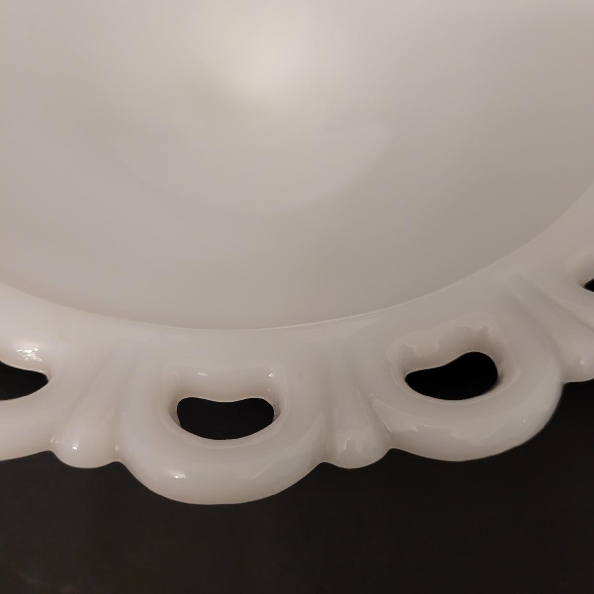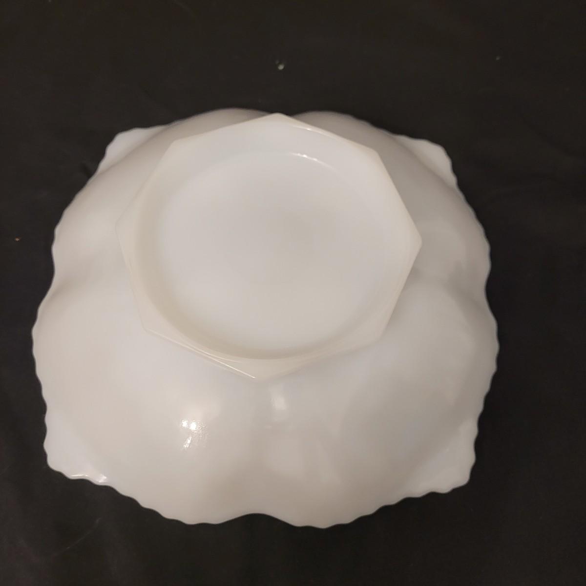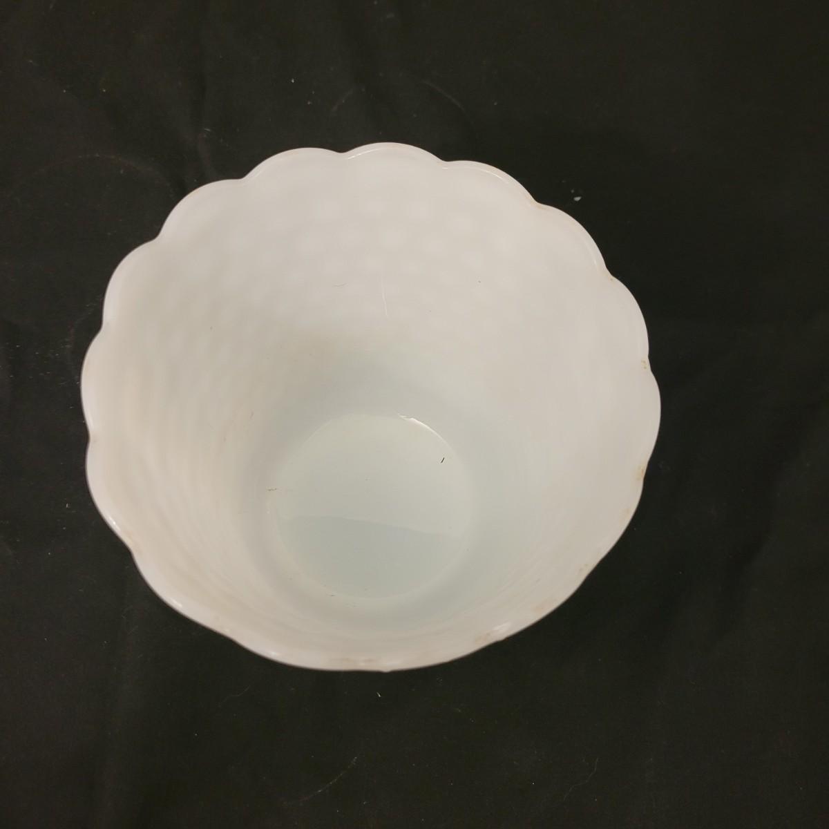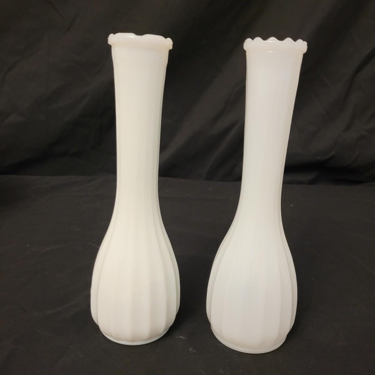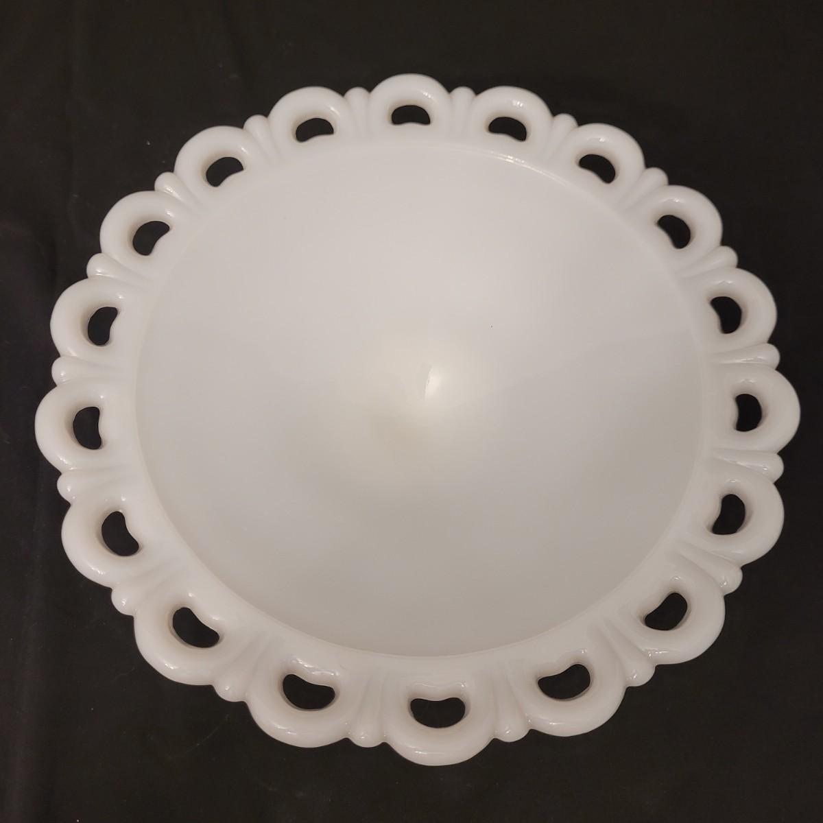 Eleven piece collection of milk and white glass items, including a large serving stand, two serving bowls, a wide mouth vase, five narrow vases, a soap dish and ringing bell. Items are in good condition with very few chips and are only slightly dirty (see photos). Serving stand measures approximately 11"DIA x 4.5"H. Shipping available.
