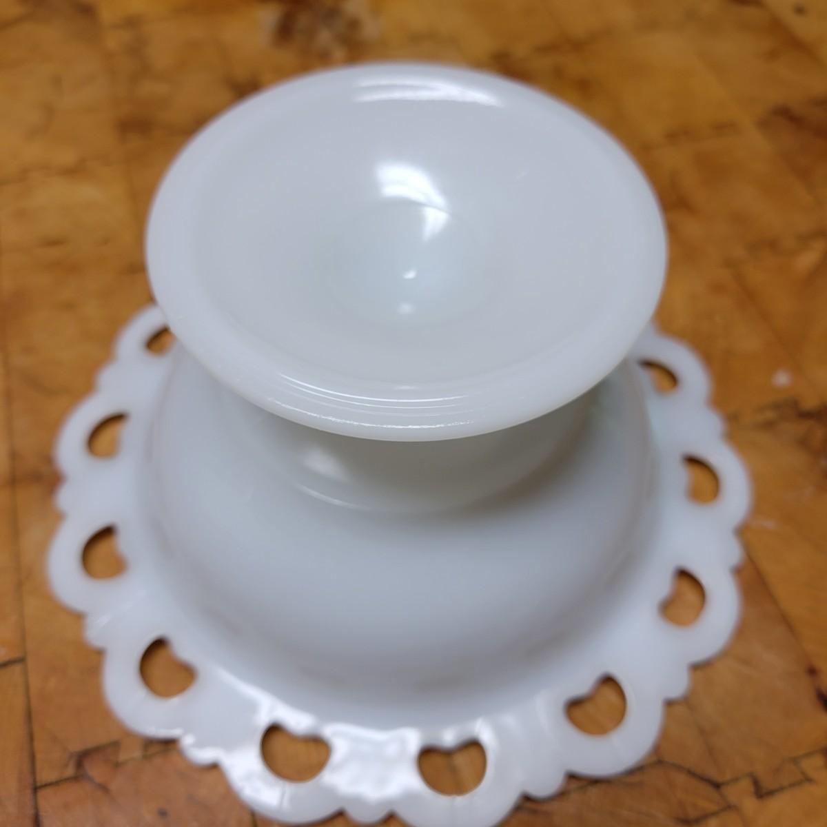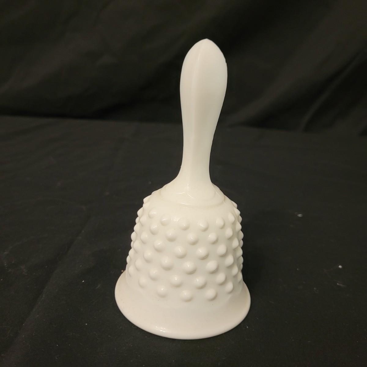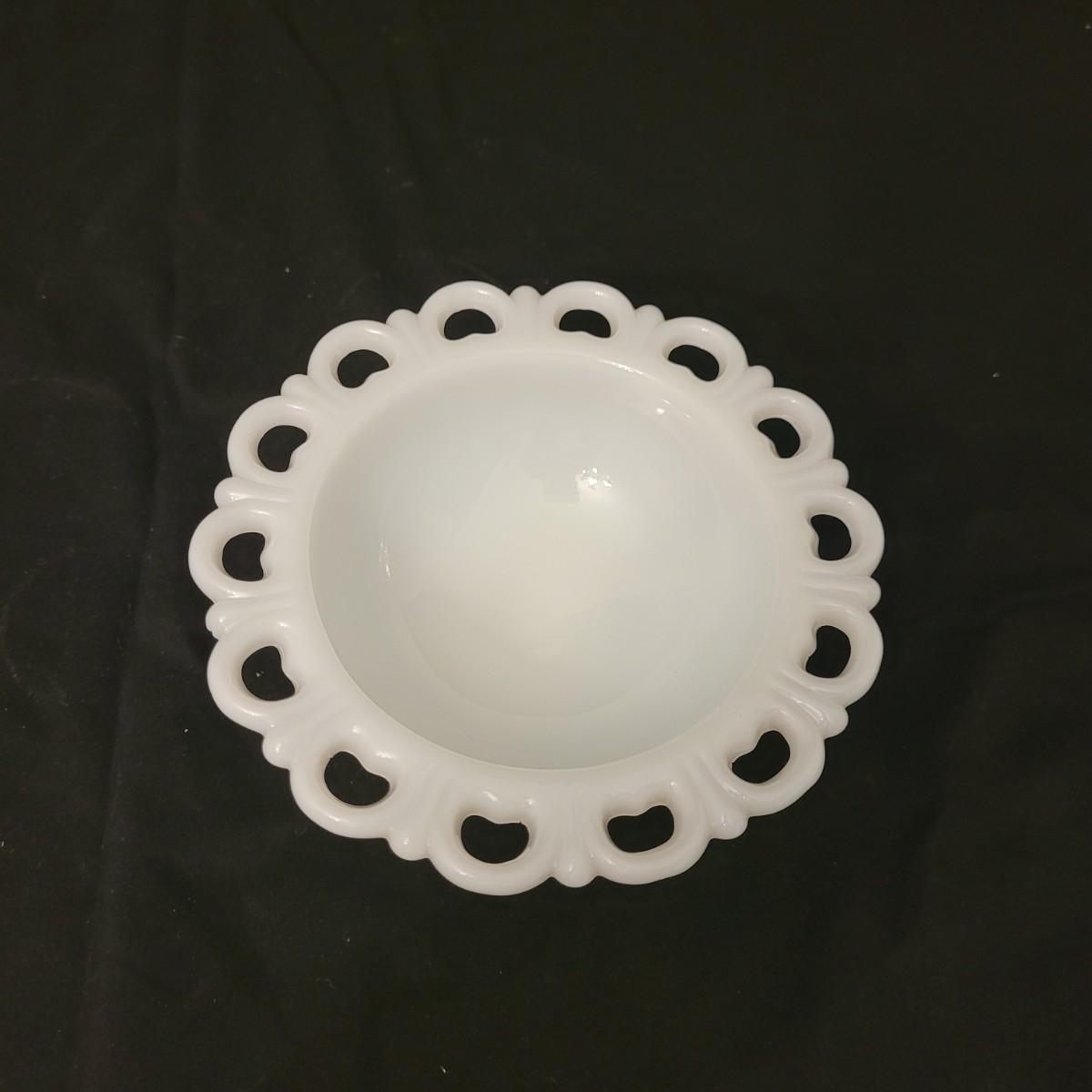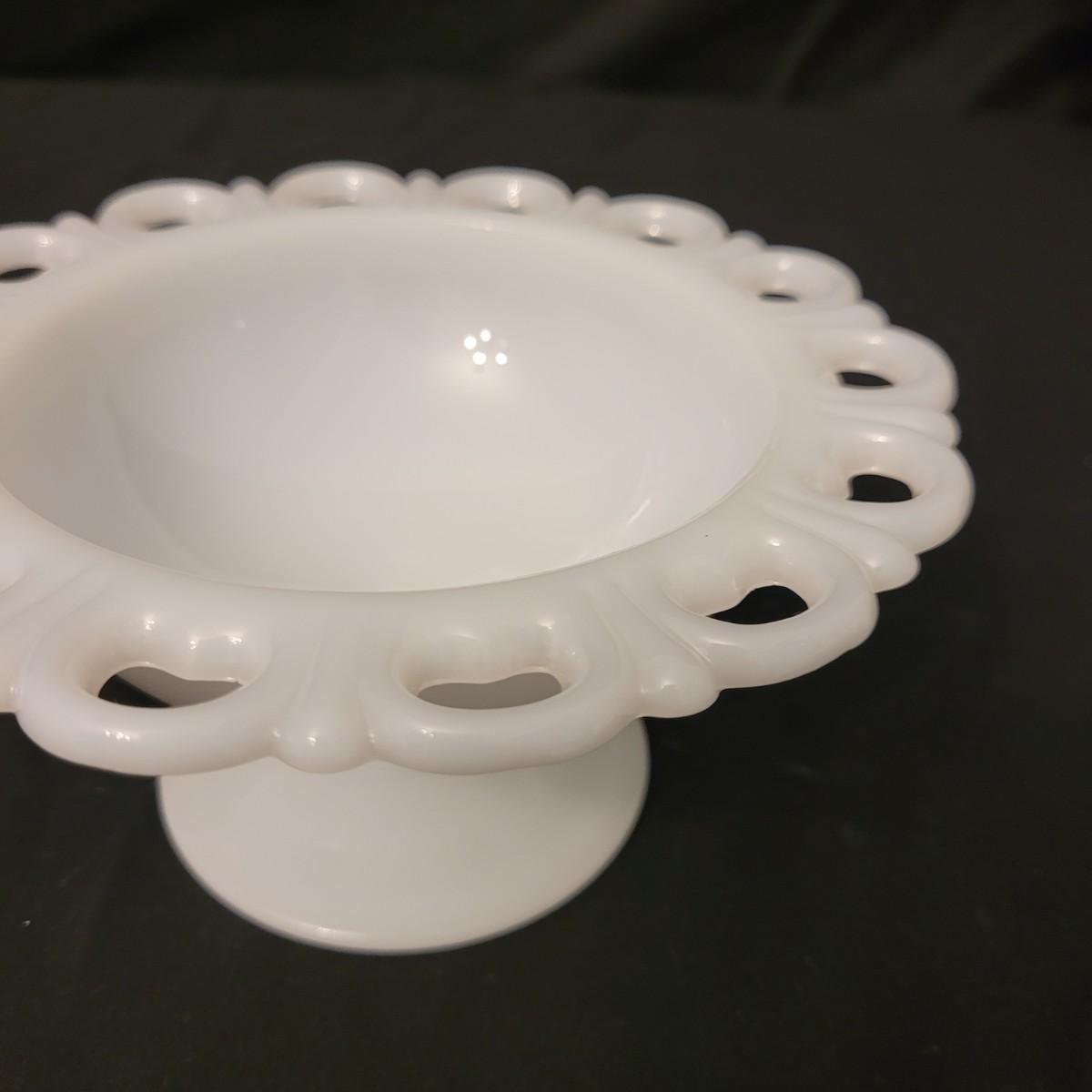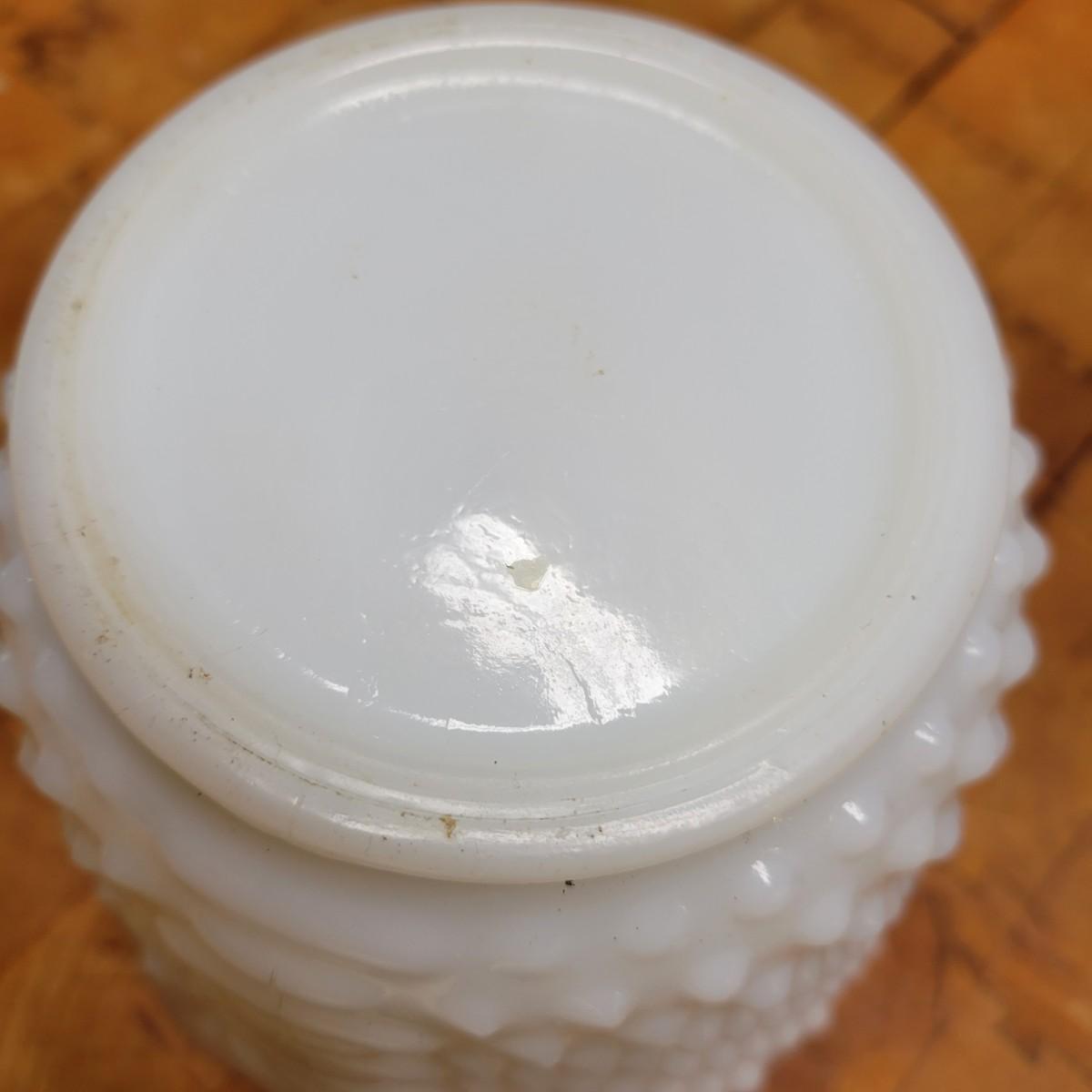 Eleven piece collection of milk and white glass items, including a large serving stand, two serving bowls, a wide mouth vase, five narrow vases, a soap dish and ringing bell. Items are in good condition with very few chips and are only slightly dirty (see photos). Serving stand measures approximately 11"DIA x 4.5"H. Shipping available.