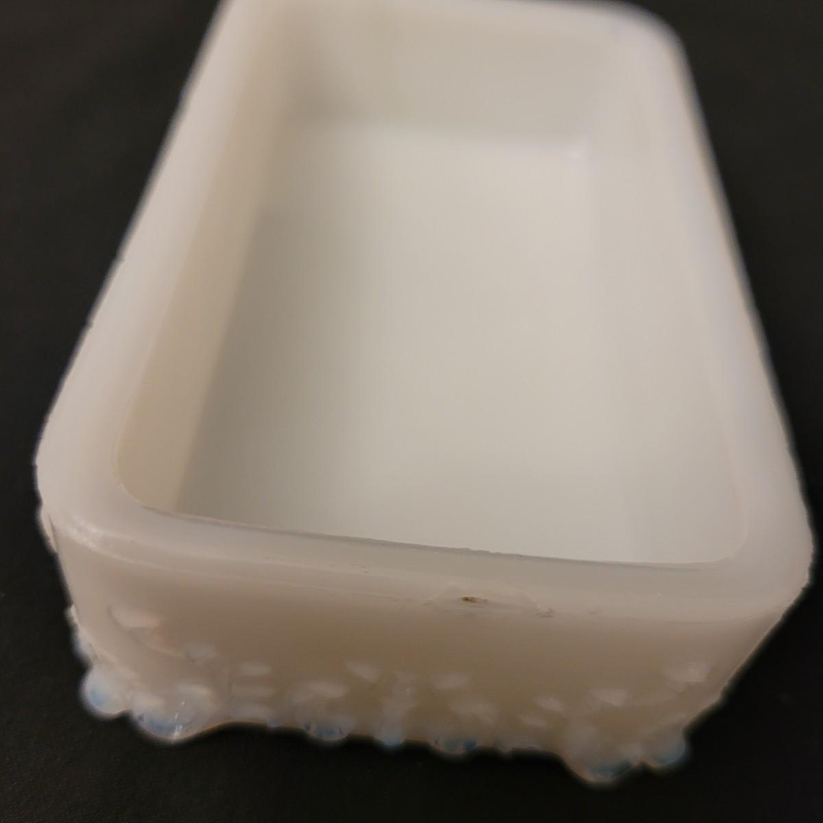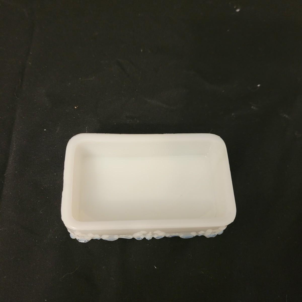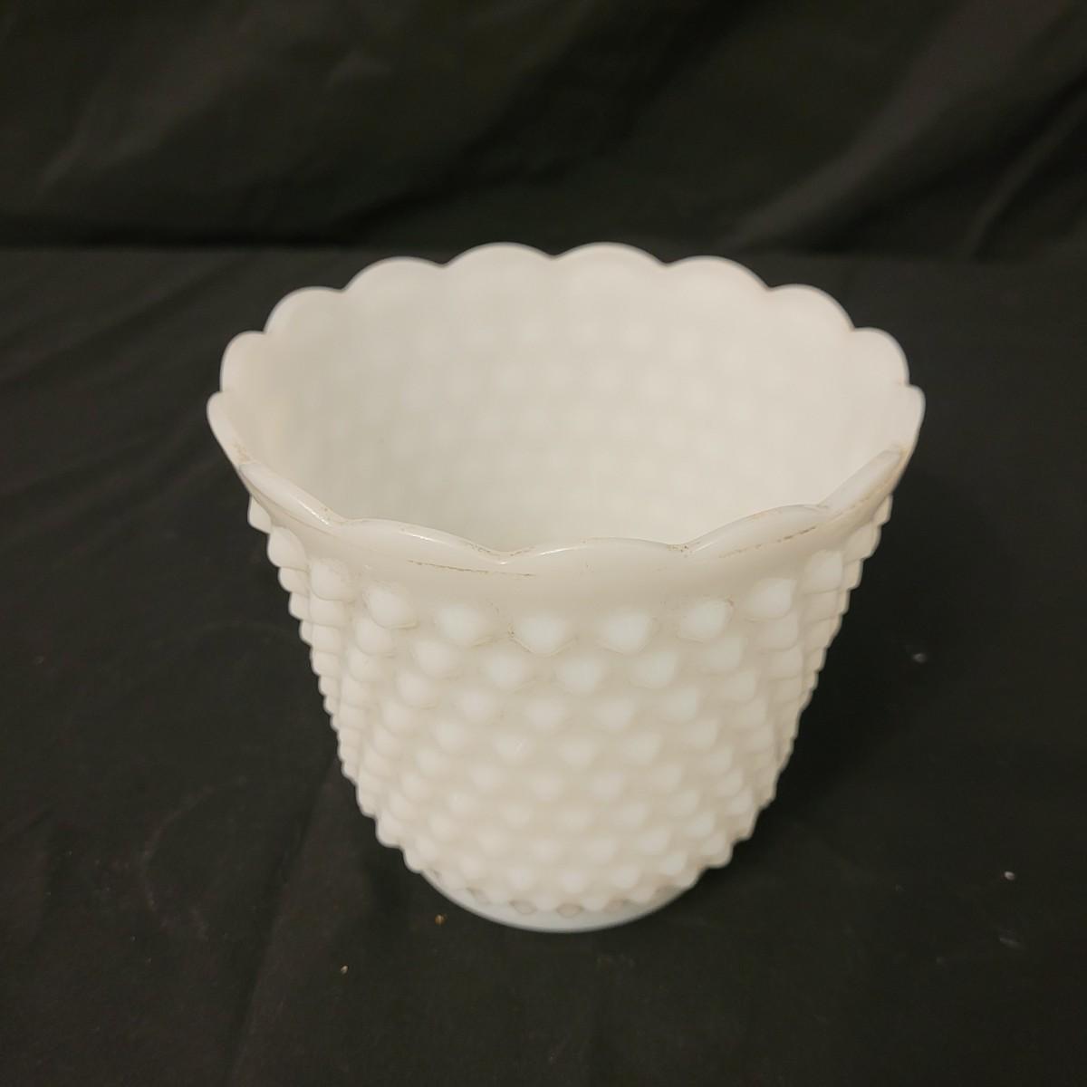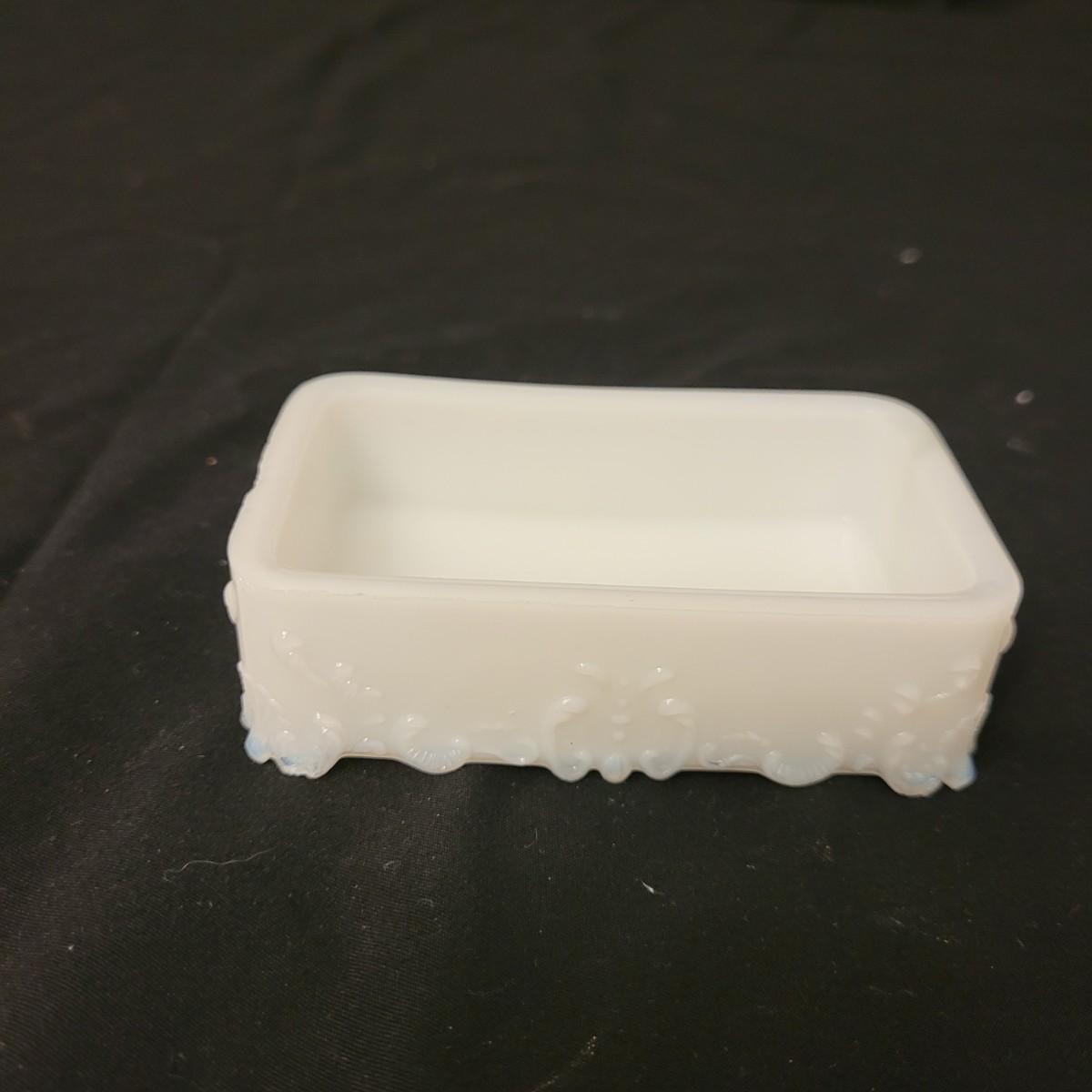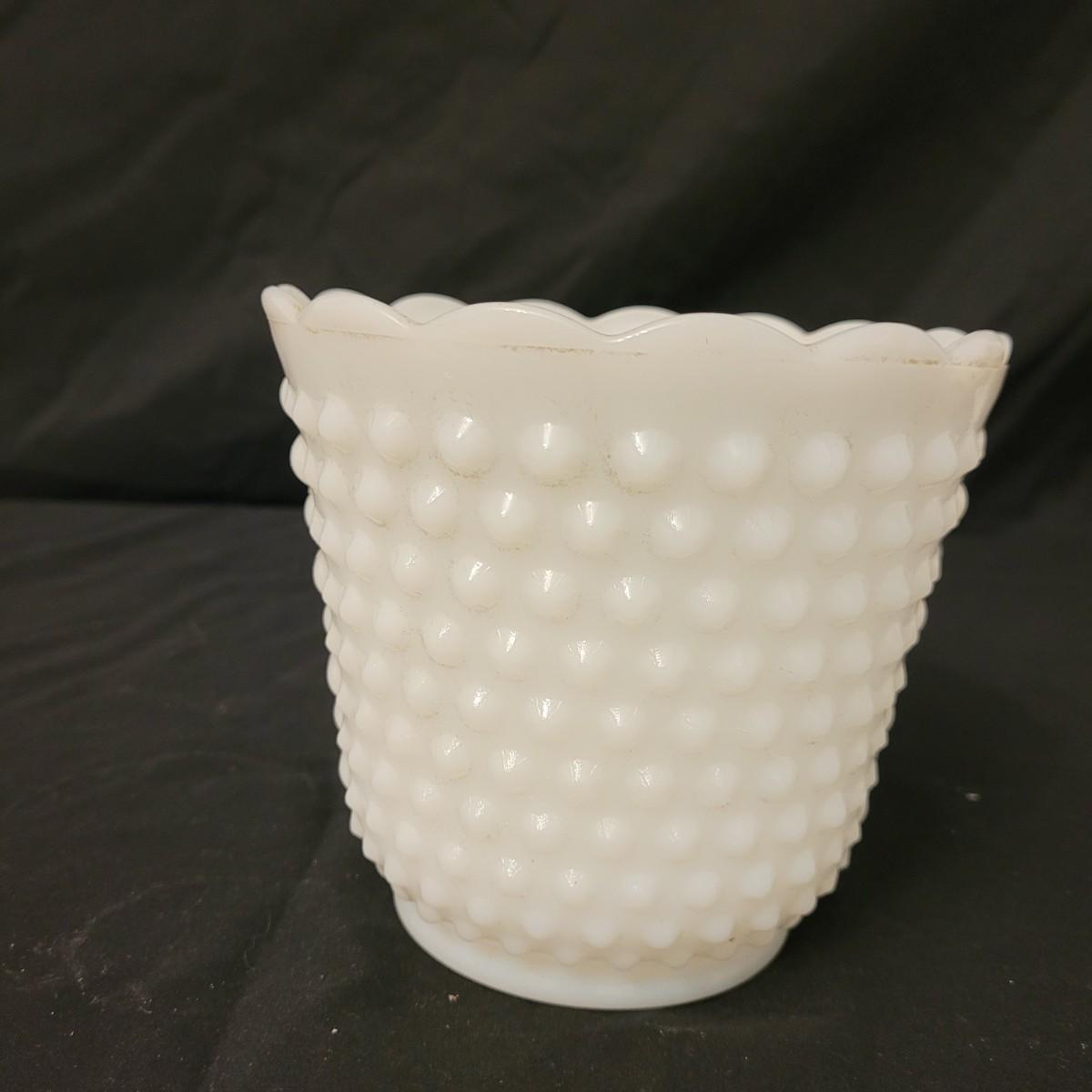 Eleven piece collection of milk and white glass items, including a large serving stand, two serving bowls, a wide mouth vase, five narrow vases, a soap dish and ringing bell. Items are in good condition with very few chips and are only slightly dirty (see photos). Serving stand measures approximately 11"DIA x 4.5"H. Shipping available.