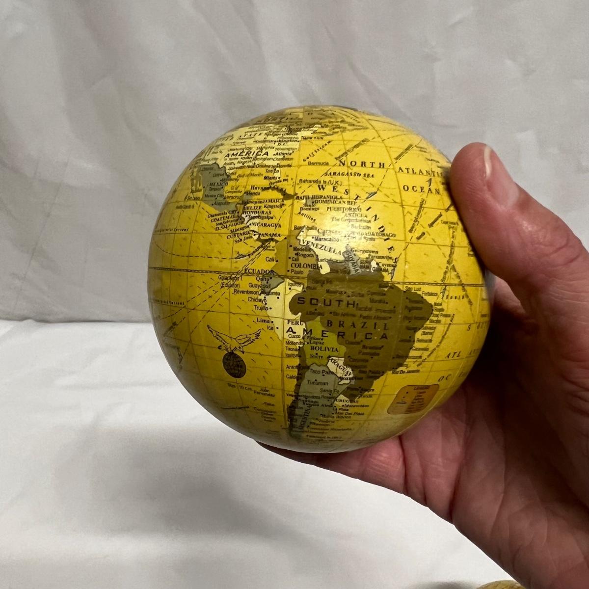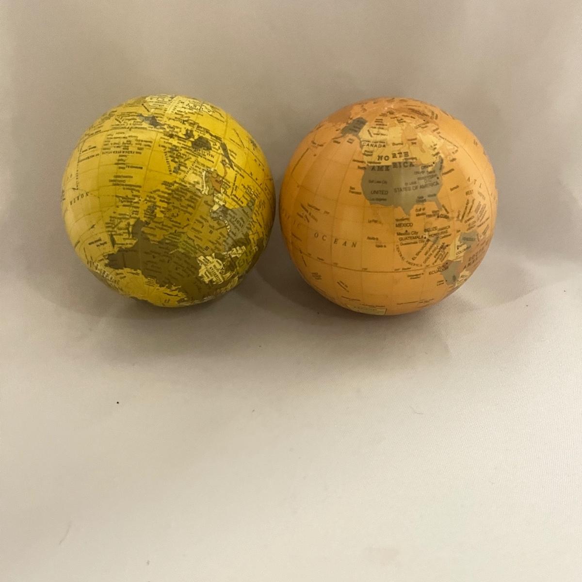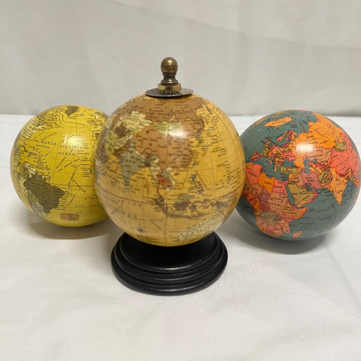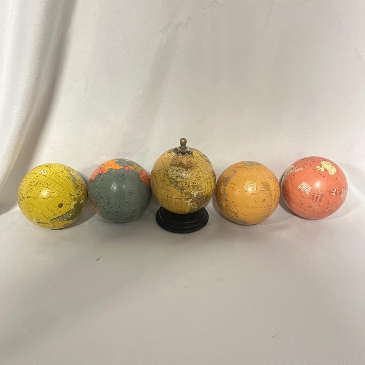 This collection of globes includes five in total. The antiqued globe has a wooden base. They appear to be a coated cardboard material. Globes measure 4”D x 6”H.