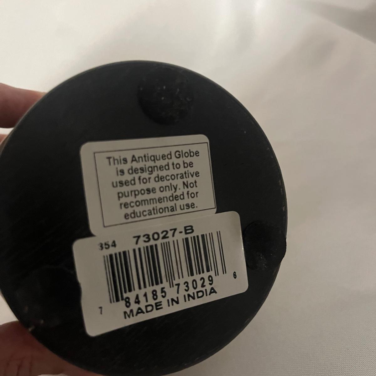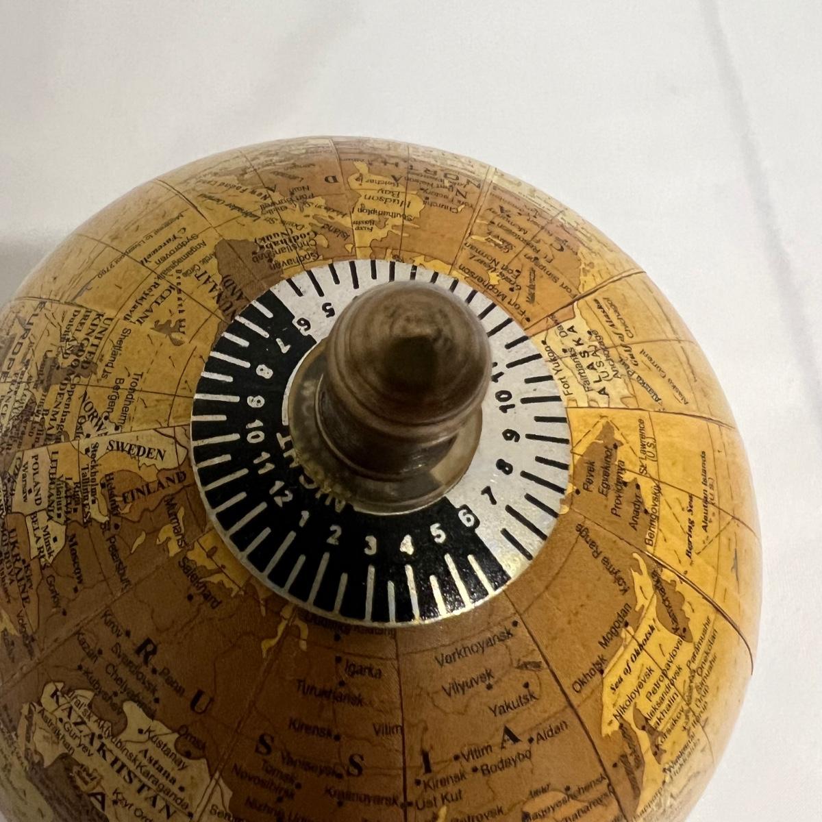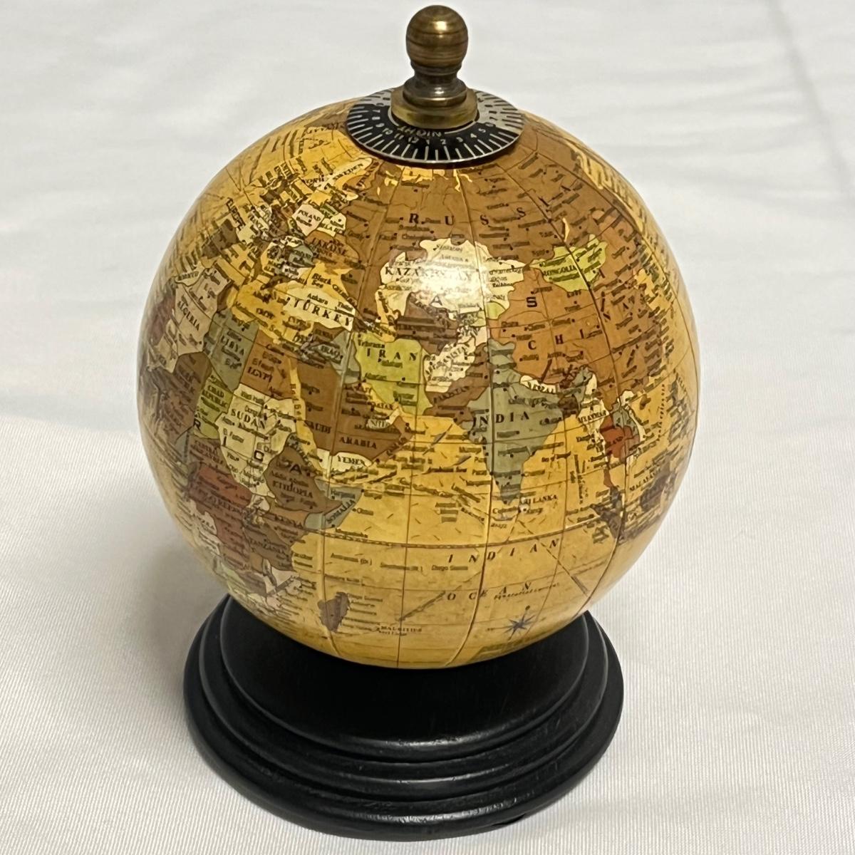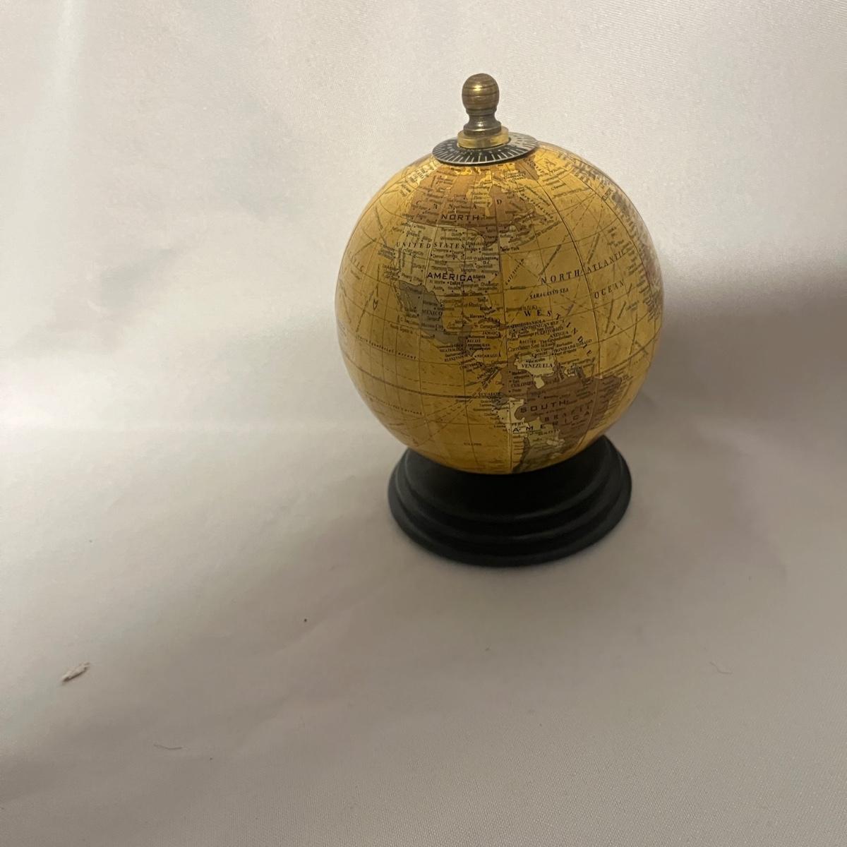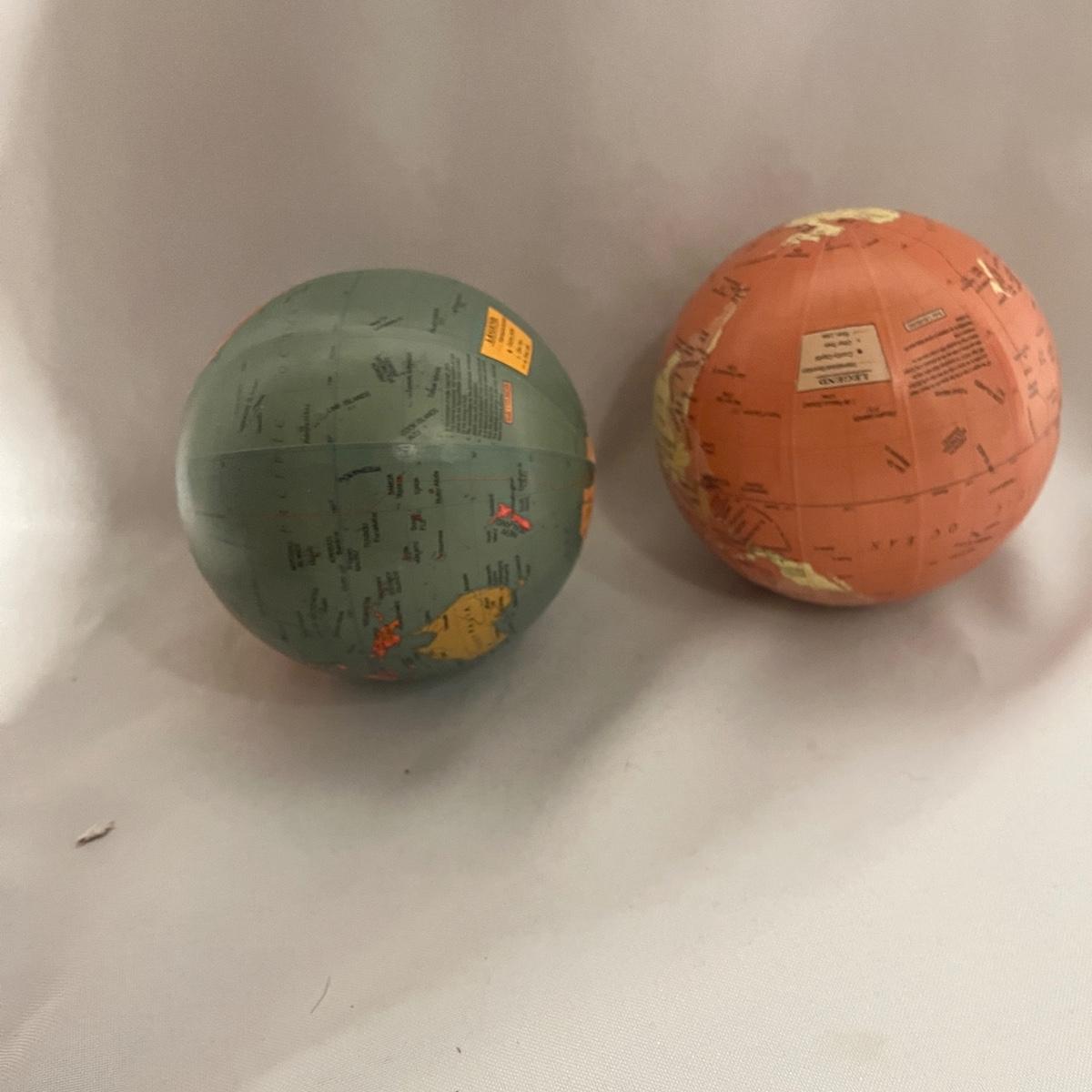 This collection of globes includes five in total. The antiqued globe has a wooden base. They appear to be a coated cardboard material. Globes measure 4”D x 6”H.