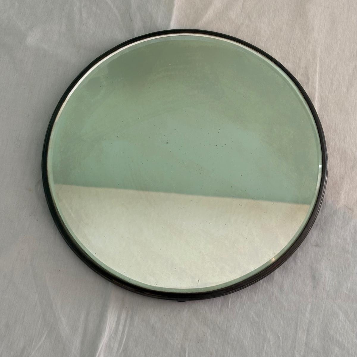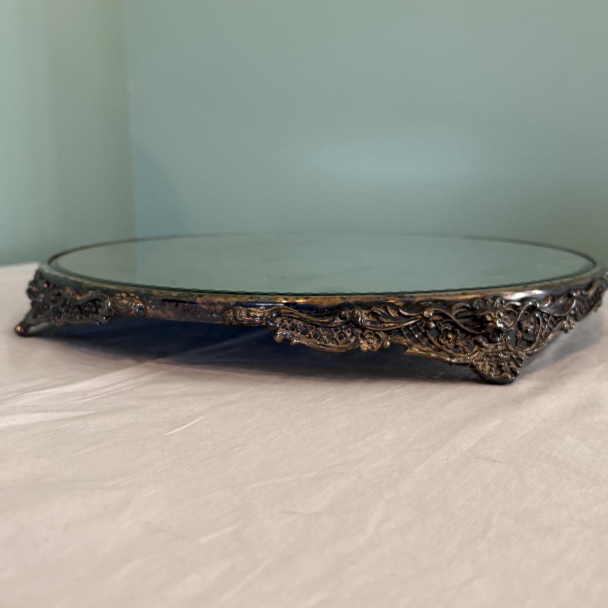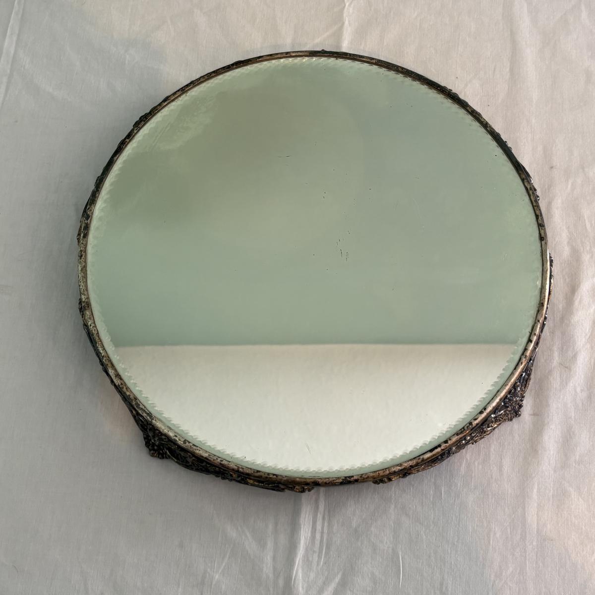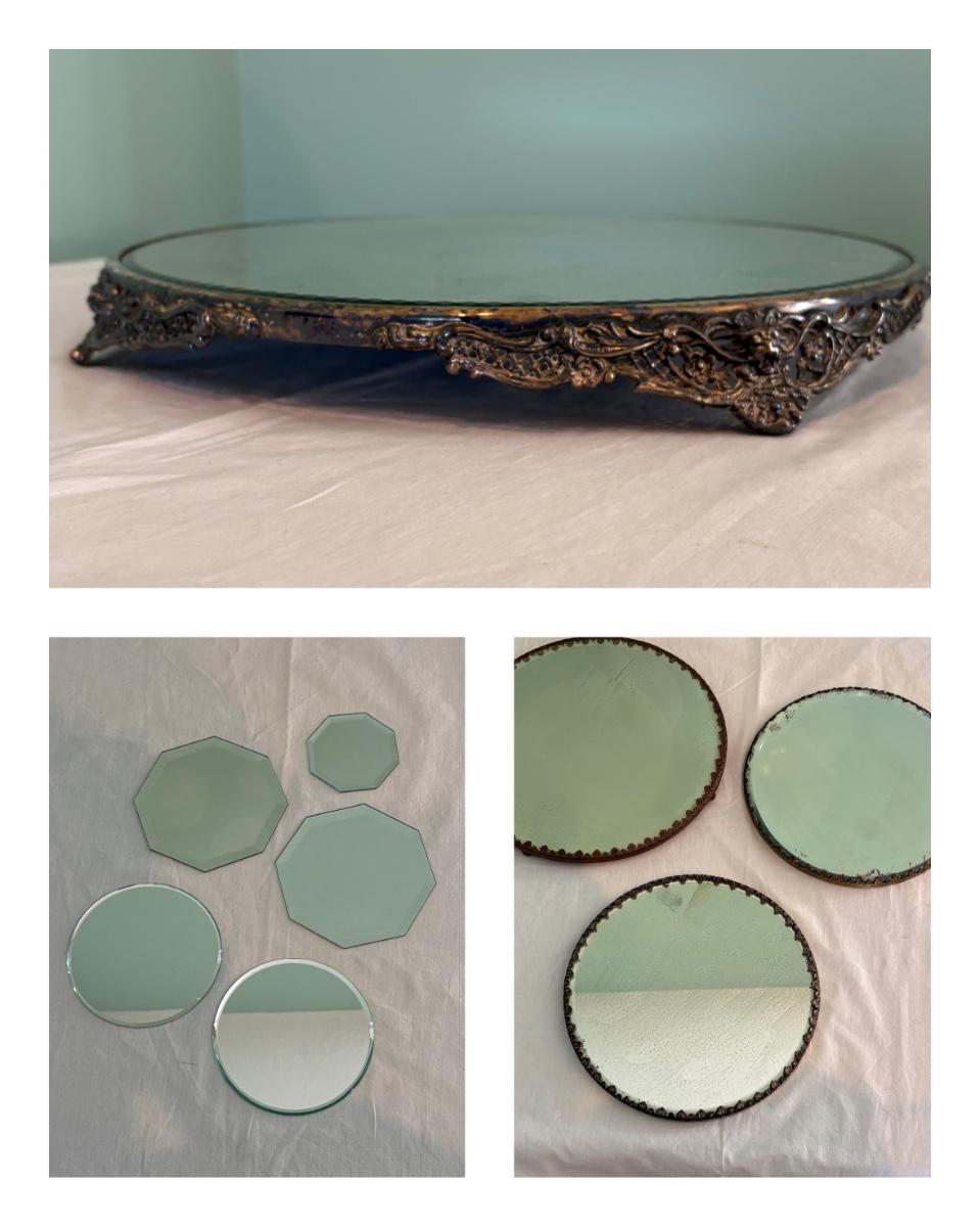 This lot includes a variety of approximately 12 mirrored vanity trays, coasters, and candle holders. The largest vanity tray with an ornate filigree border has measurements of approximately 14"D x 1.5"H and the smallest round coasters are 6"D. Several of the vintage silver plated trays have blemishes, see pictures for reference.