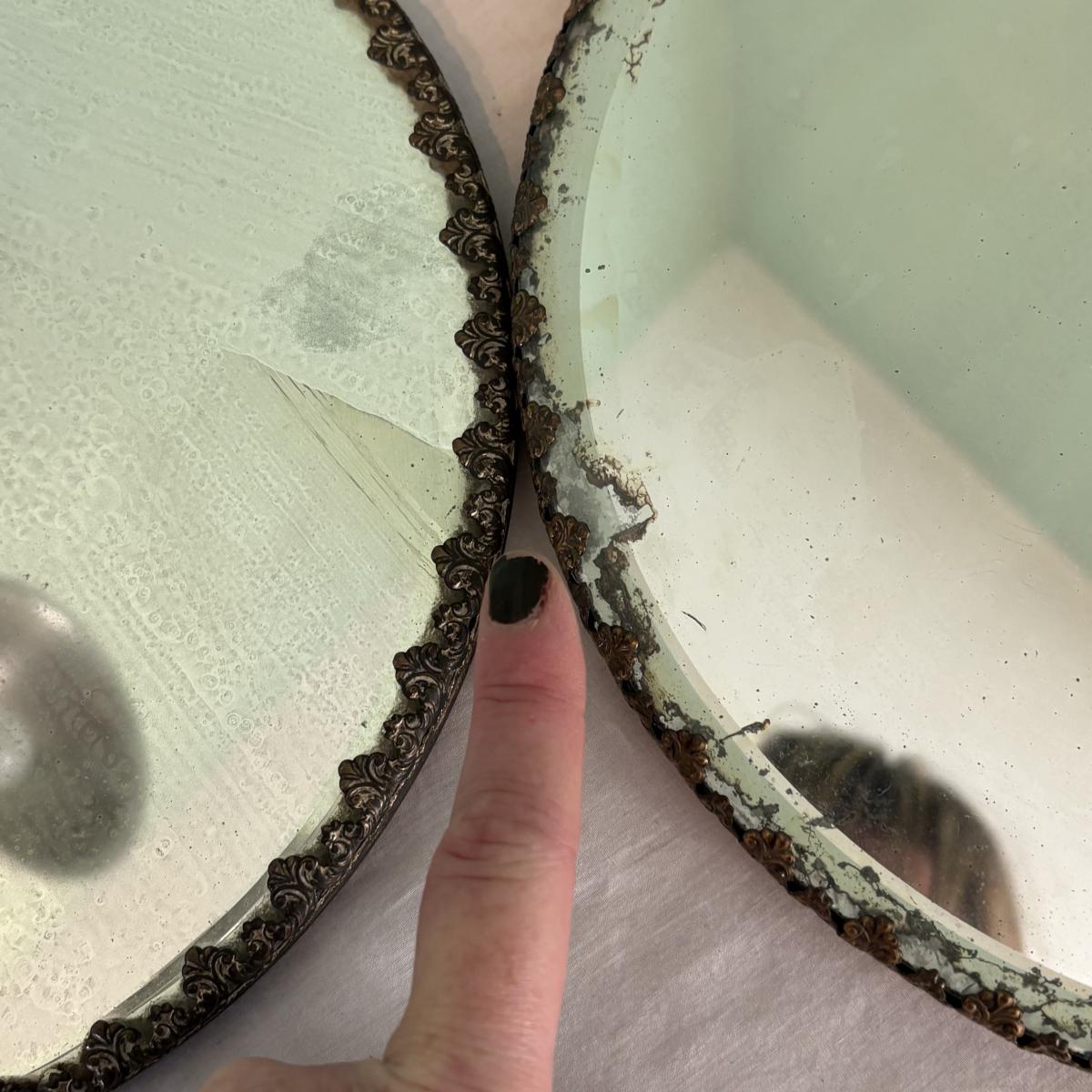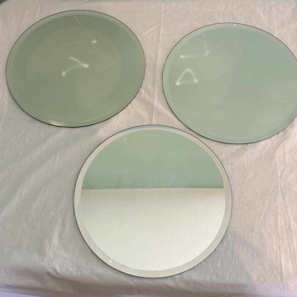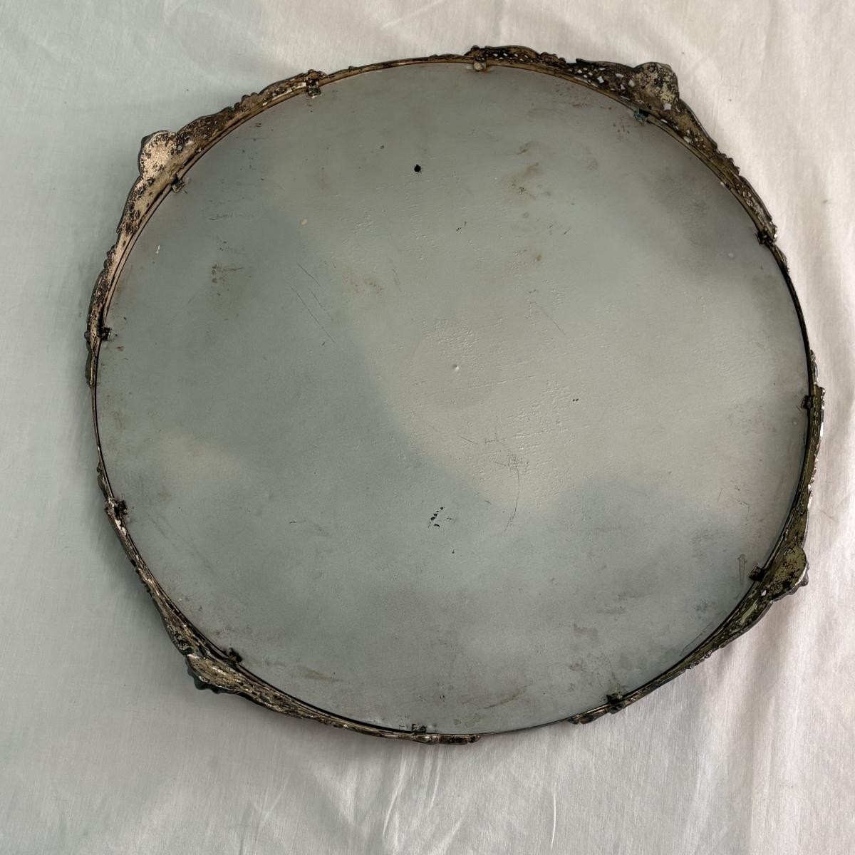 This lot includes a variety of approximately 12 mirrored vanity trays, coasters, and candle holders. The largest vanity tray with an ornate filigree border has measurements of approximately 14"D x 1.5"H and the smallest round coasters are 6"D. Several of the vintage silver plated trays have blemishes, see pictures for reference.