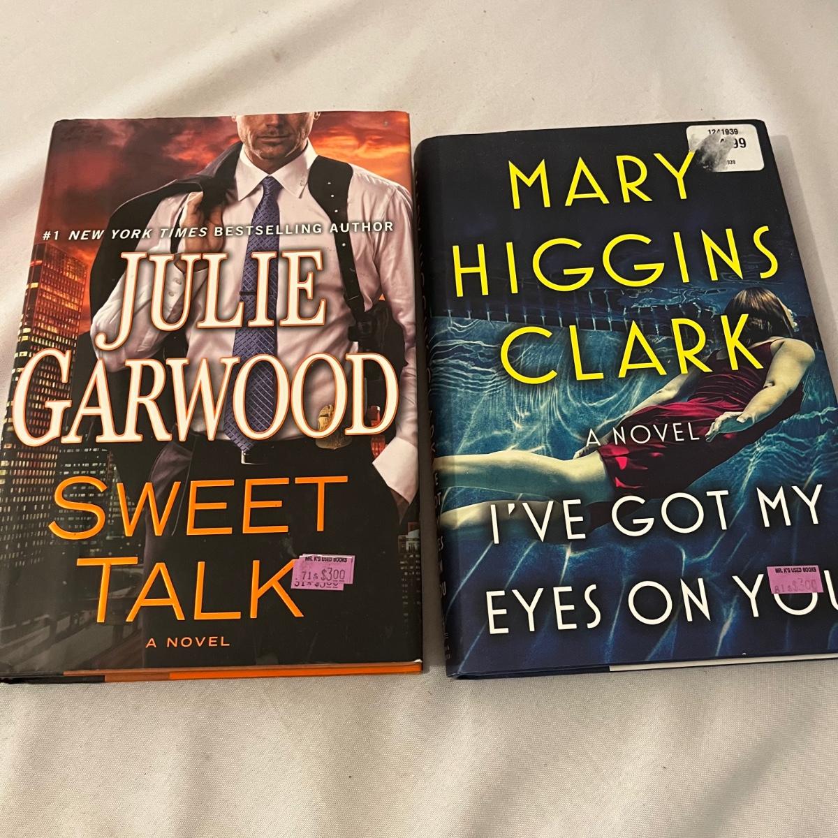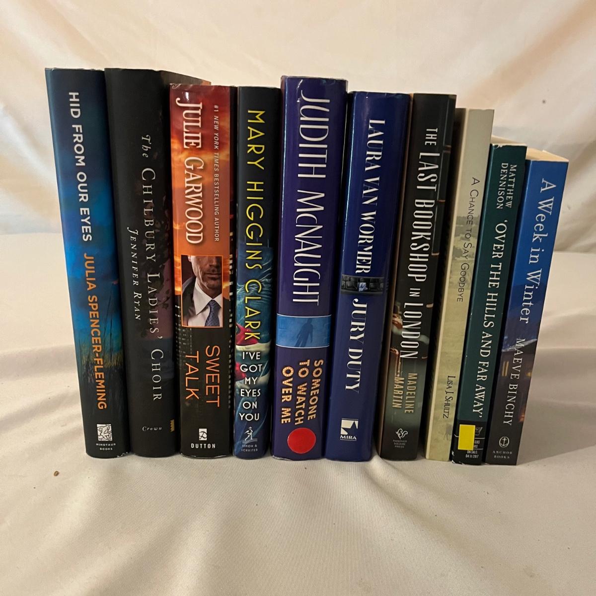 This lot includes ten novels with books by authors Mary Higgins Clark, Julie Garwood, Maeve Binchy, Madeline Martin and more. Also includes Issy and LA book light that needs battery so it was not tested.