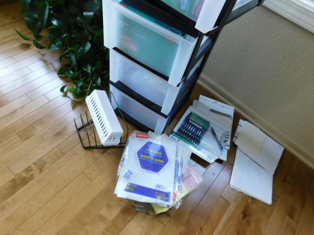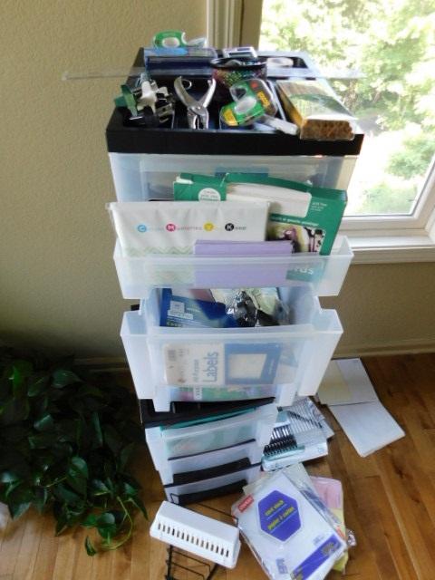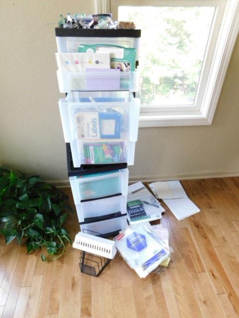 Collection of Office Supplies and Plastic Storage Bin Towers