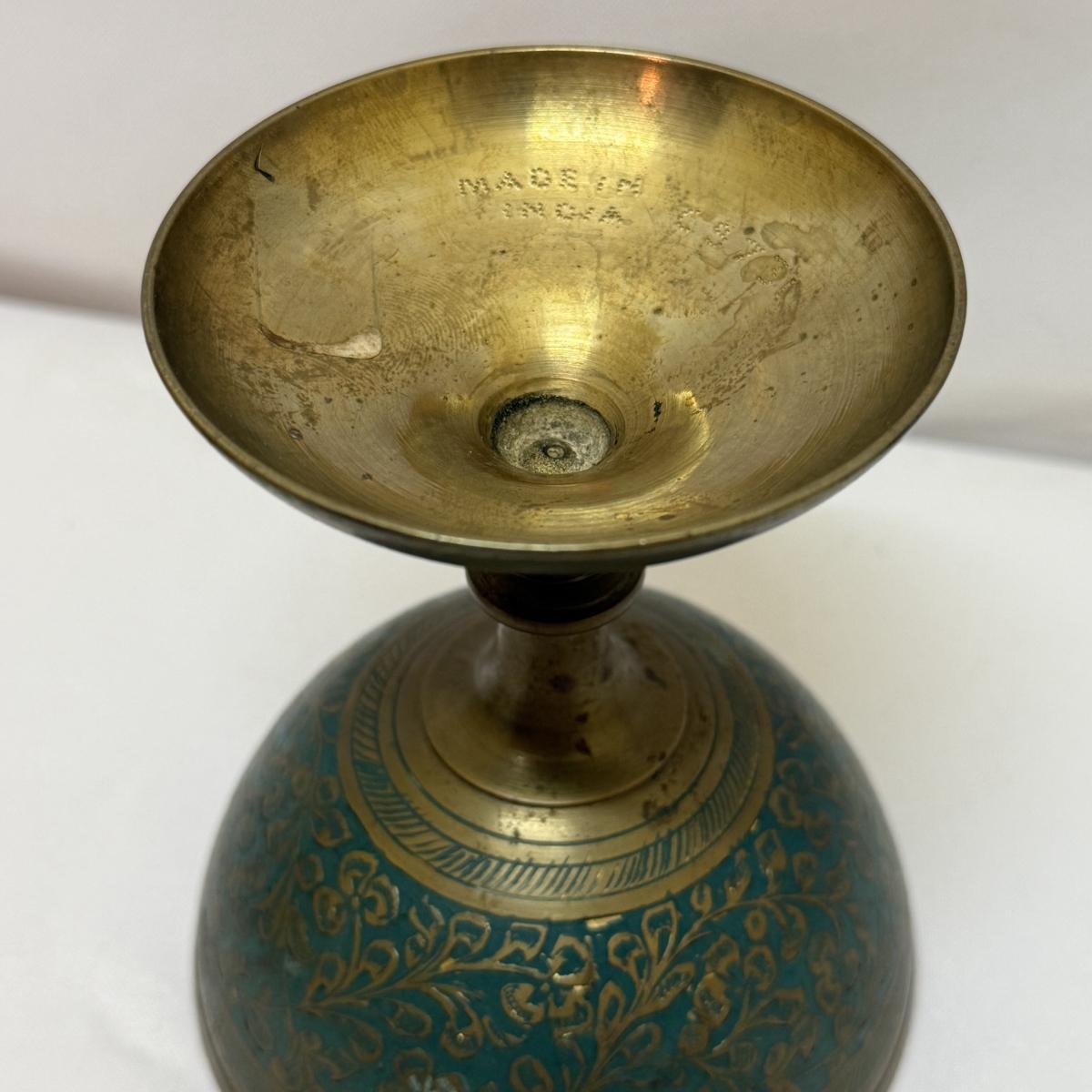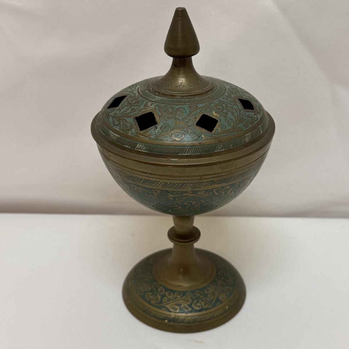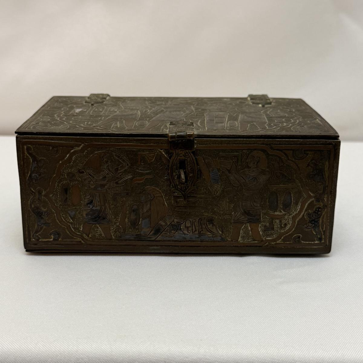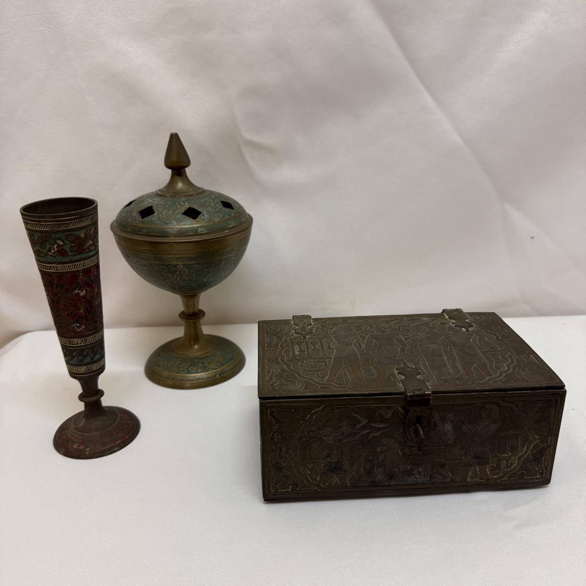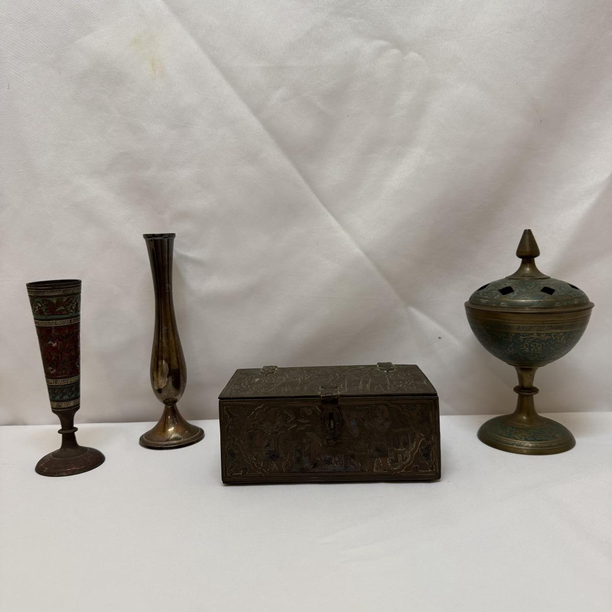 Four ornate functional decor items, three of which are marked Made in India. The three most decorated items appear to be made from brass; the stem vase appears to be silverplated. The box is wood inside with a metal exterior. It has a little locking latch on the front and is 6” x 3.75” x 2.5”H. The metal pin on the back hinge functions fine but has some damage. Foam pads have been added to the bottom of the box.