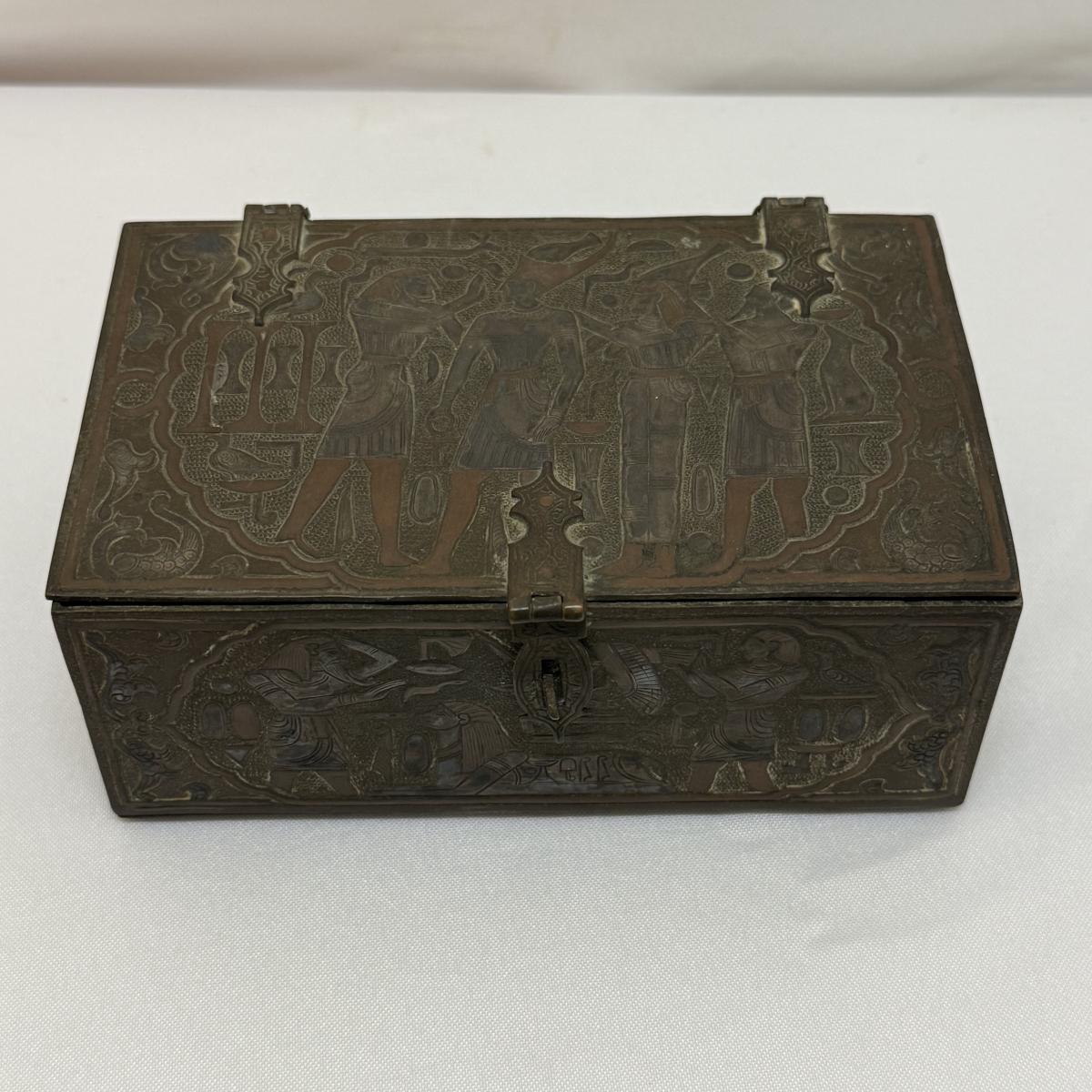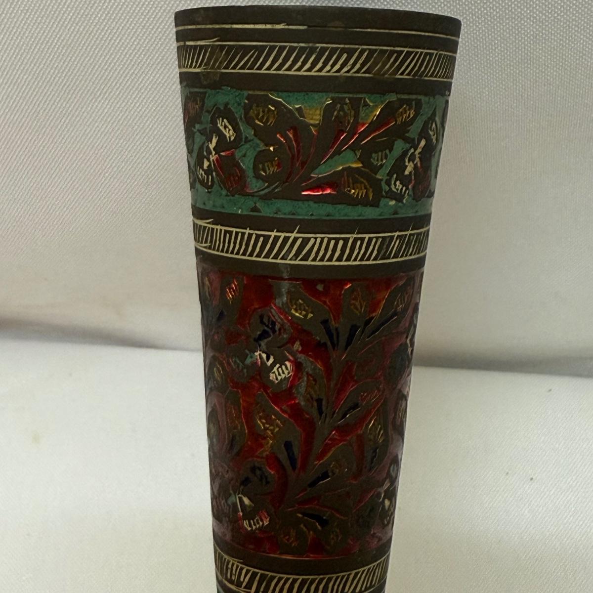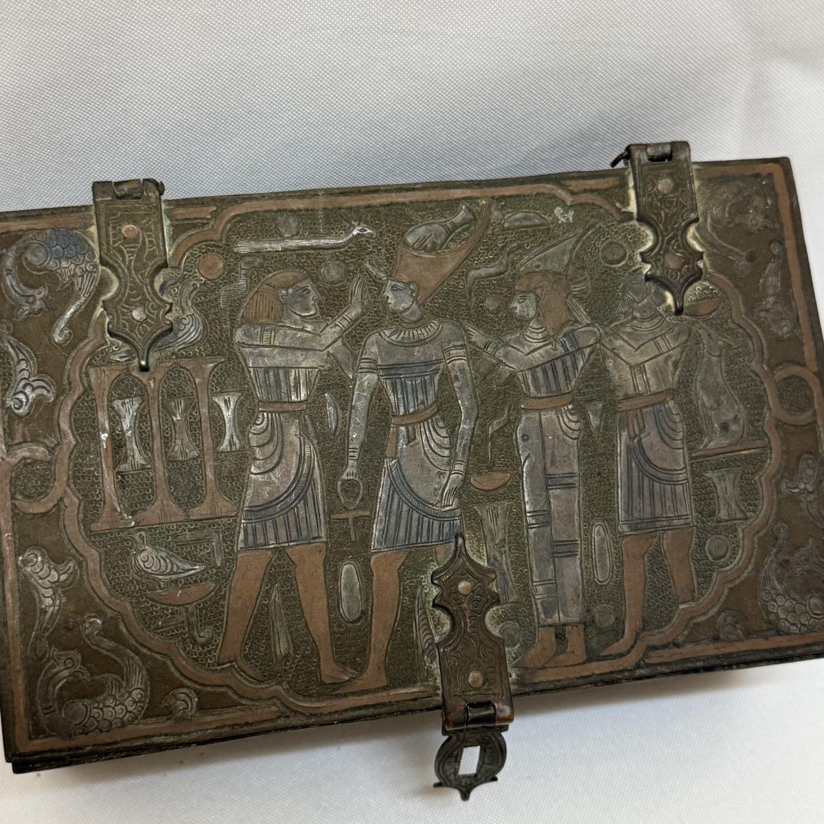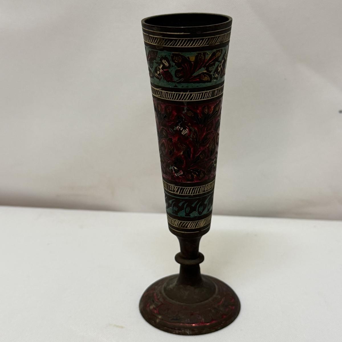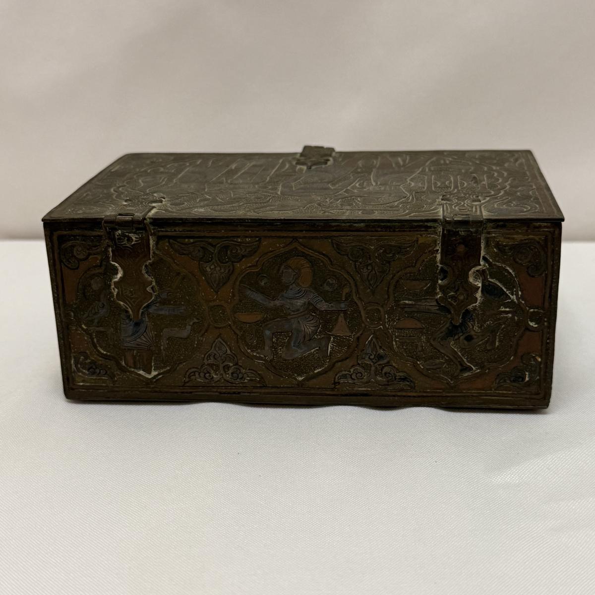 Four ornate functional decor items, three of which are marked Made in India. The three most decorated items appear to be made from brass; the stem vase appears to be silverplated. The box is wood inside with a metal exterior. It has a little locking latch on the front and is 6” x 3.75” x 2.5”H. The metal pin on the back hinge functions fine but has some damage. Foam pads have been added to the bottom of the box.