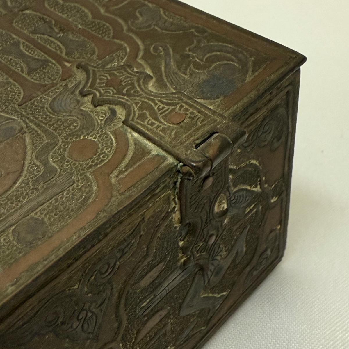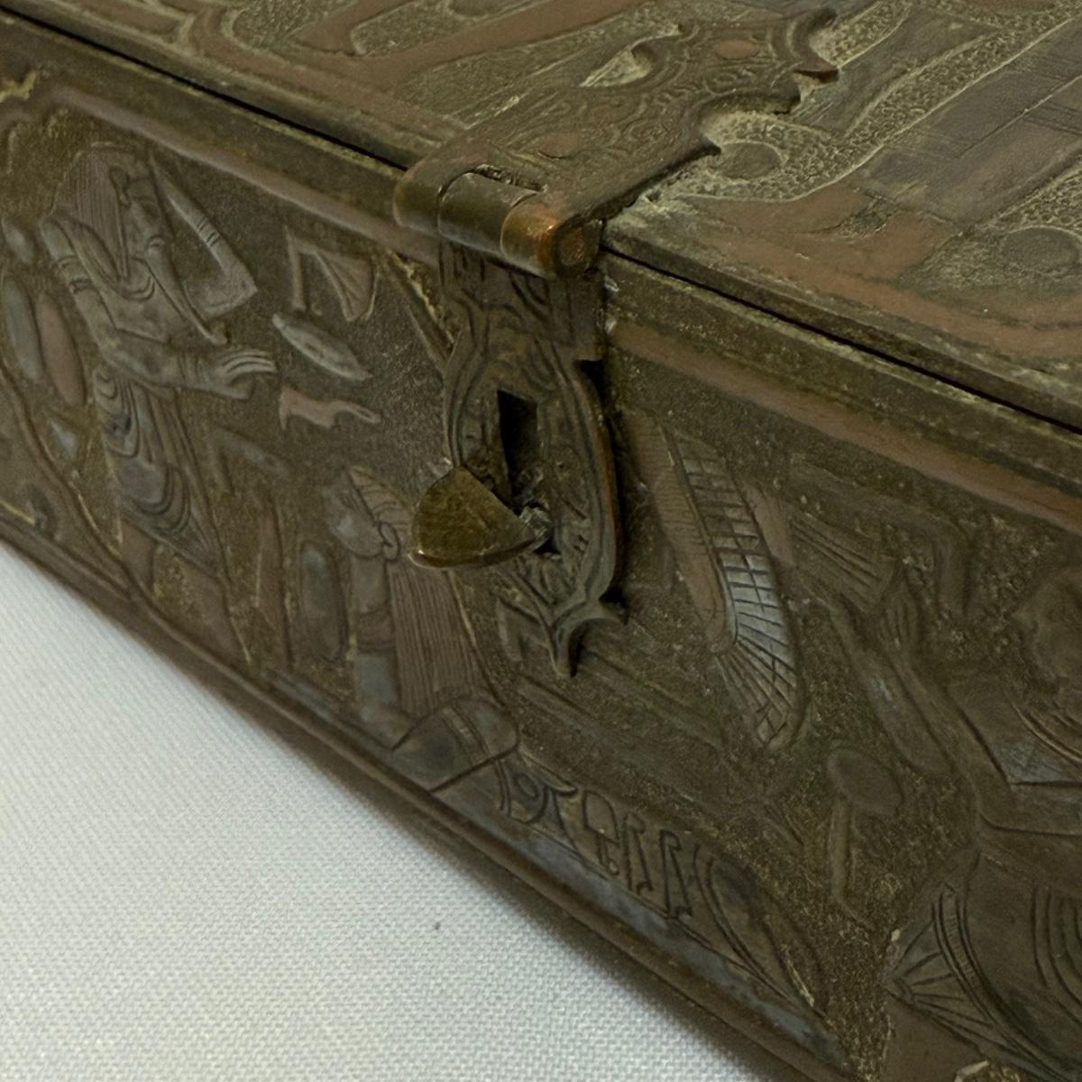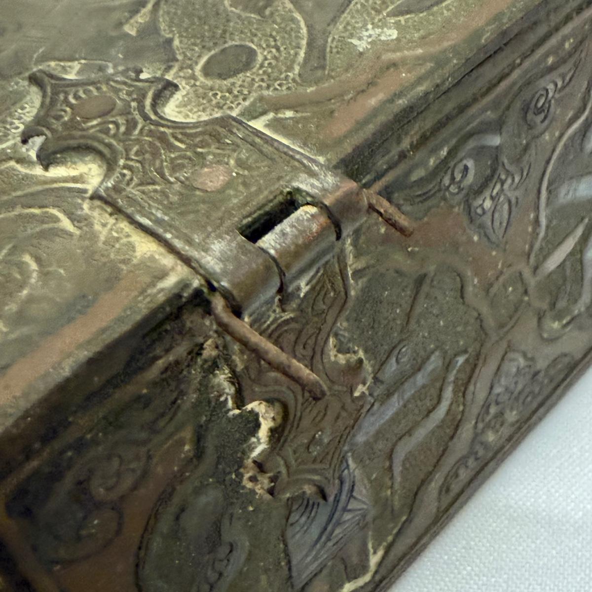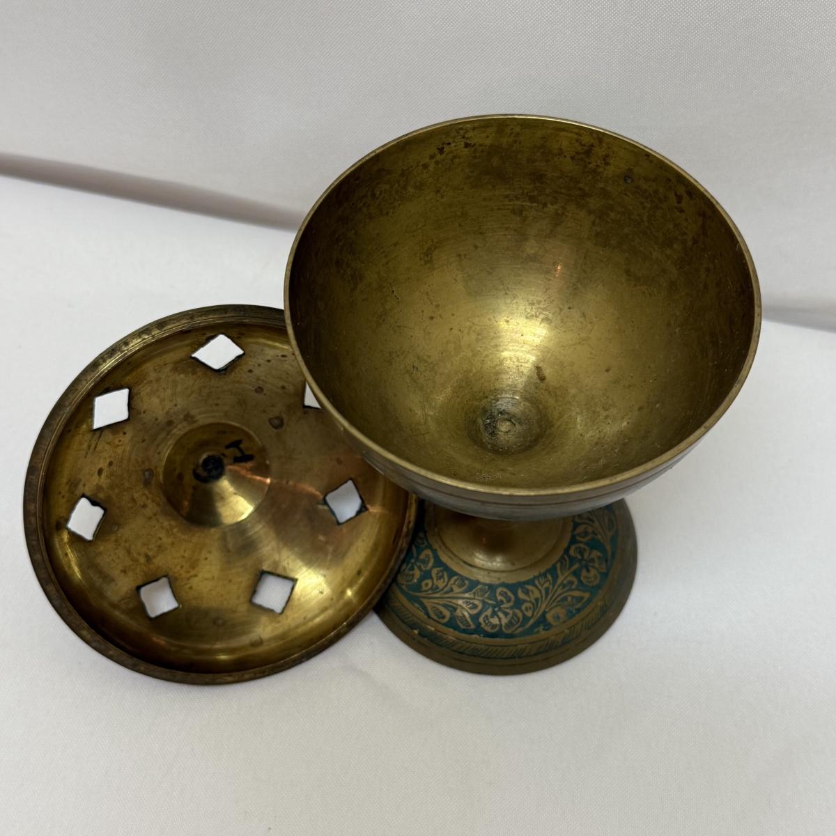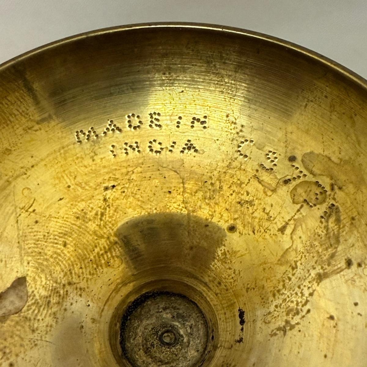 Four ornate functional decor items, three of which are marked Made in India. The three most decorated items appear to be made from brass; the stem vase appears to be silverplated. The box is wood inside with a metal exterior. It has a little locking latch on the front and is 6” x 3.75” x 2.5”H. The metal pin on the back hinge functions fine but has some damage. Foam pads have been added to the bottom of the box.
