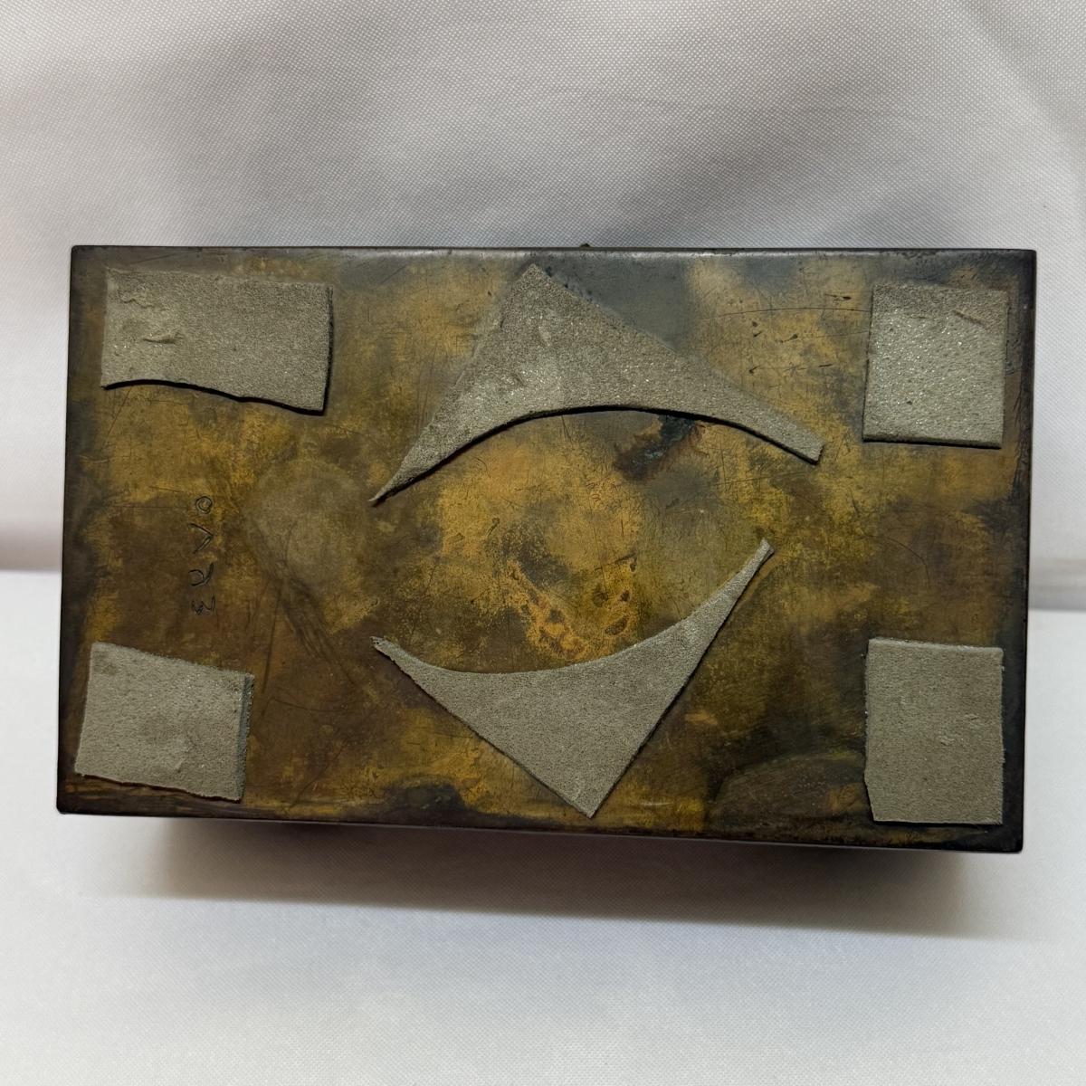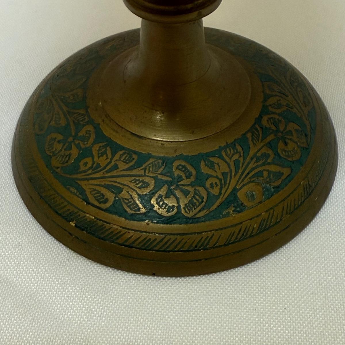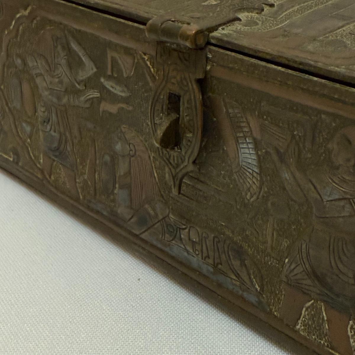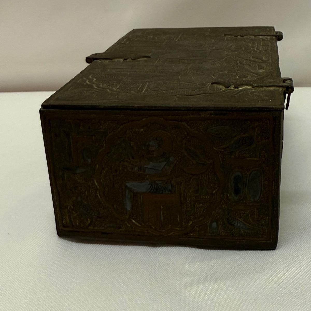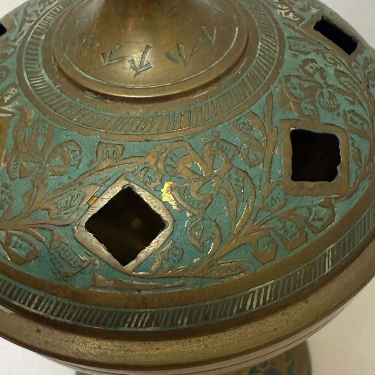 Four ornate functional decor items, three of which are marked Made in India. The three most decorated items appear to be made from brass; the stem vase appears to be silverplated. The box is wood inside with a metal exterior. It has a little locking latch on the front and is 6” x 3.75” x 2.5”H. The metal pin on the back hinge functions fine but has some damage. Foam pads have been added to the bottom of the box.