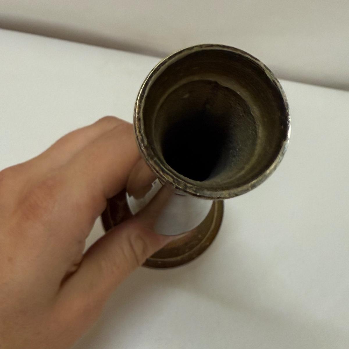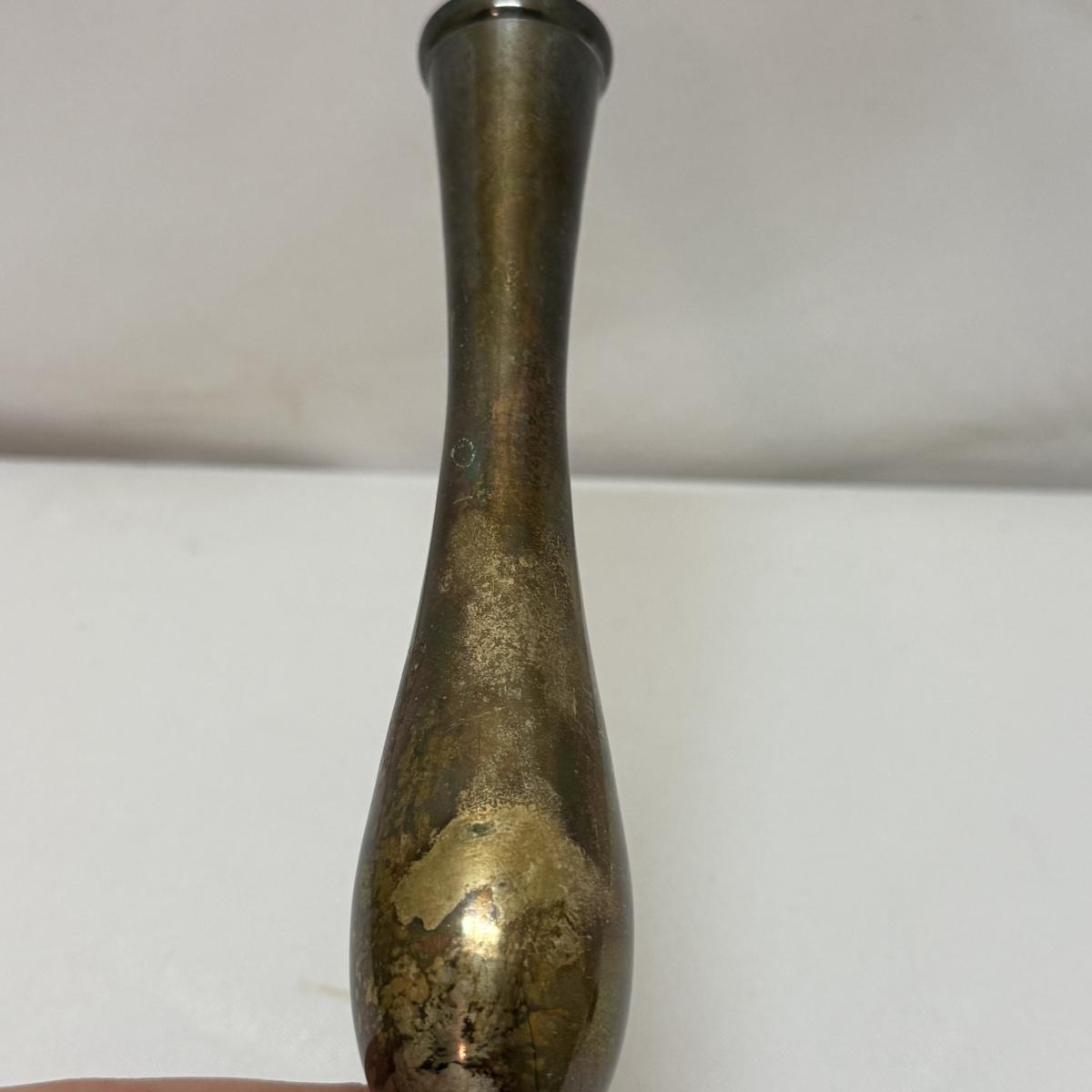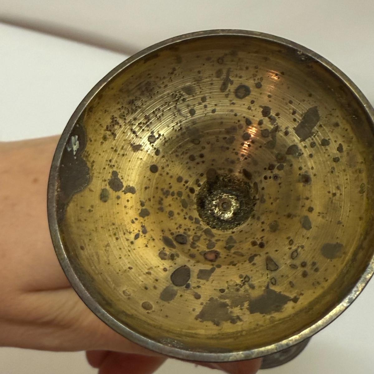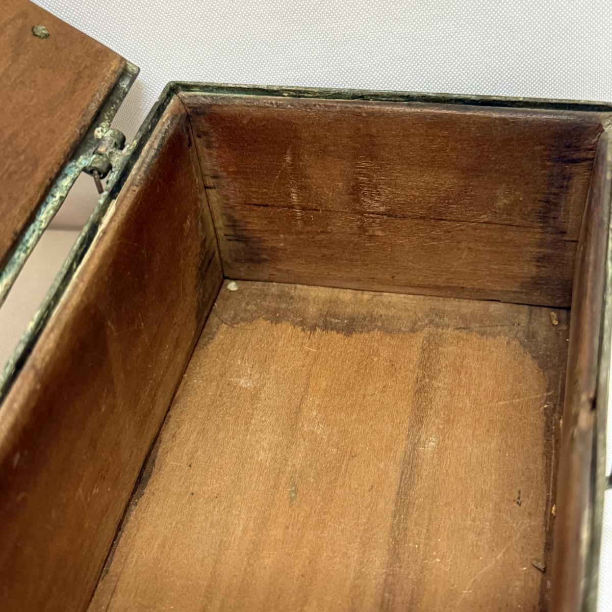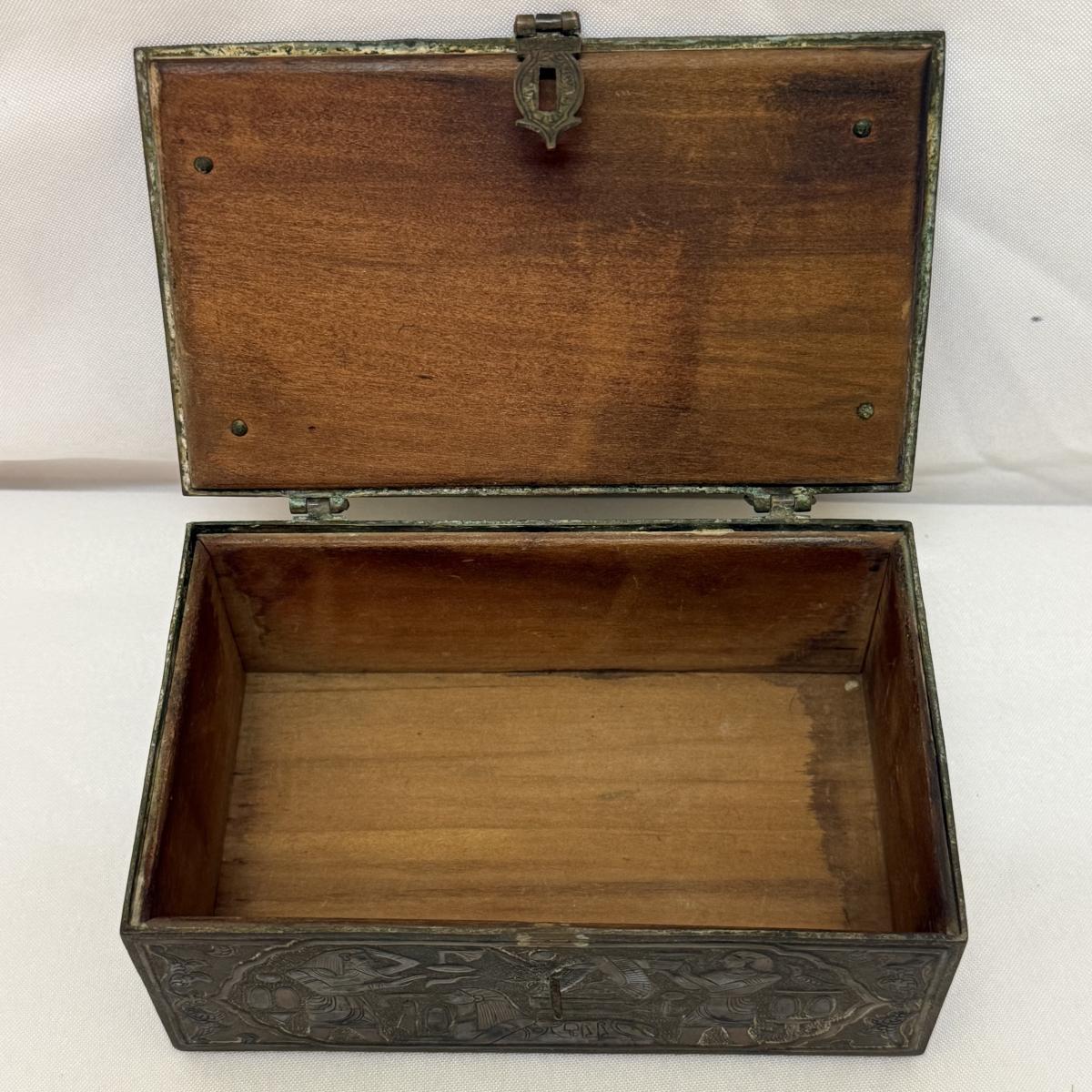 Four ornate functional decor items, three of which are marked Made in India. The three most decorated items appear to be made from brass; the stem vase appears to be silverplated. The box is wood inside with a metal exterior. It has a little locking latch on the front and is 6” x 3.75” x 2.5”H. The metal pin on the back hinge functions fine but has some damage. Foam pads have been added to the bottom of the box.