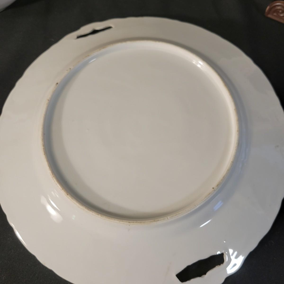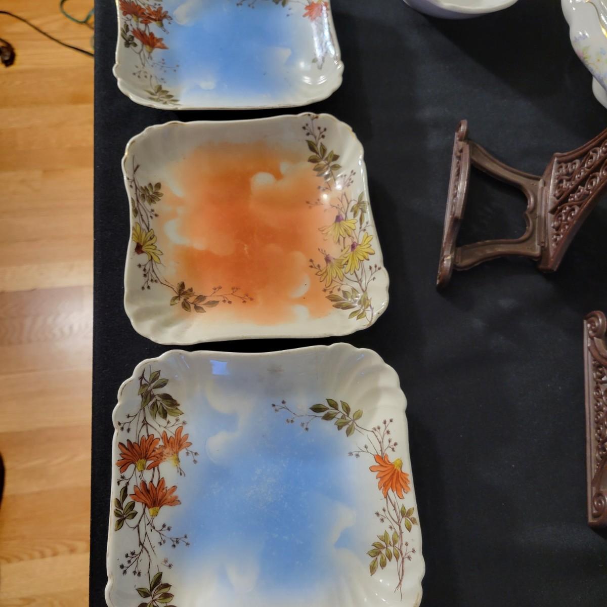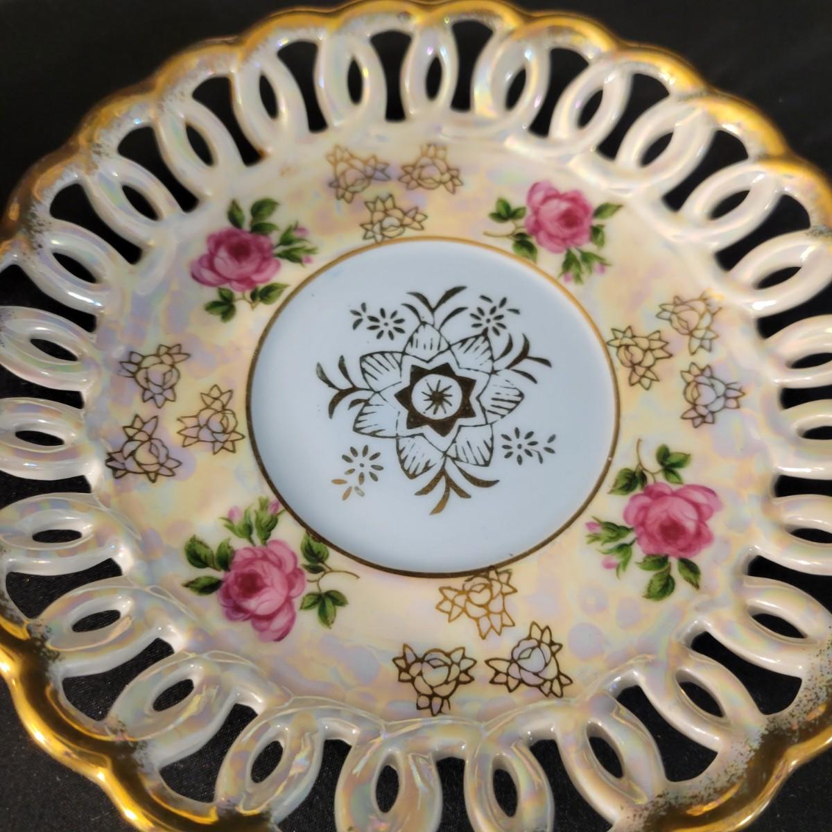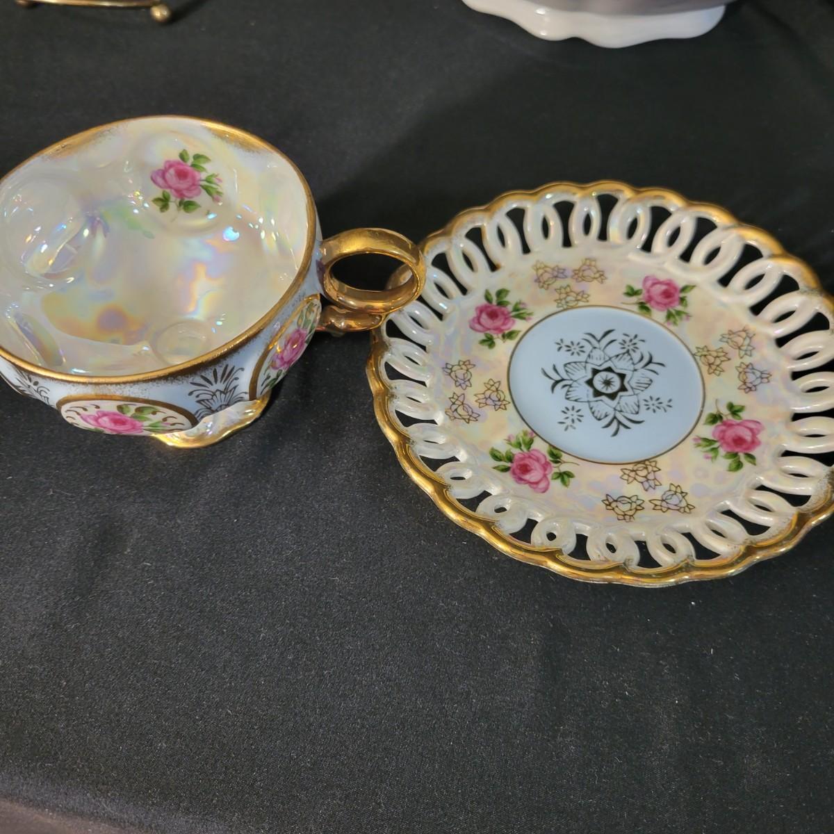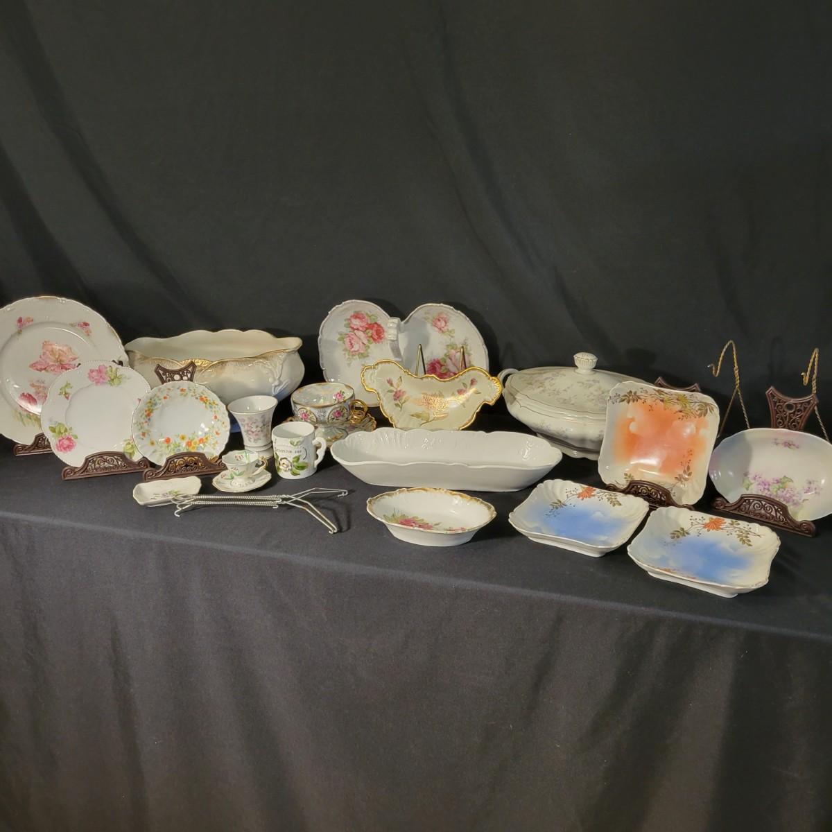 This is a large assortment of ornate china manufactured by Ucagco, Lefton, American China Co and others in good condition. Some pieces do have some pitting and crazing, and the largest piece has a minor crack. See attached pictures for more detail. Included is an assortment of plate stands and hangers. The largest piece measures approximately 11.5" x 8.5" x 5" Local pickup only