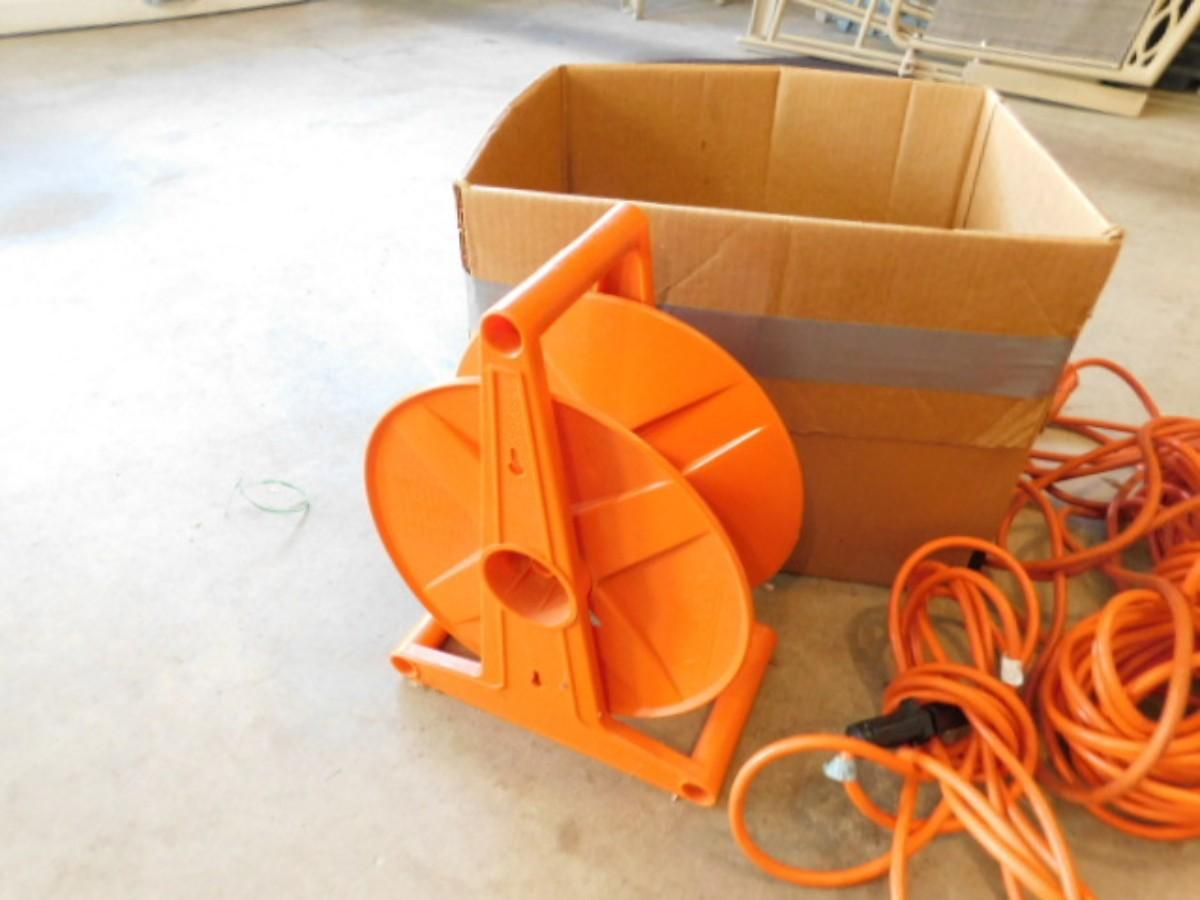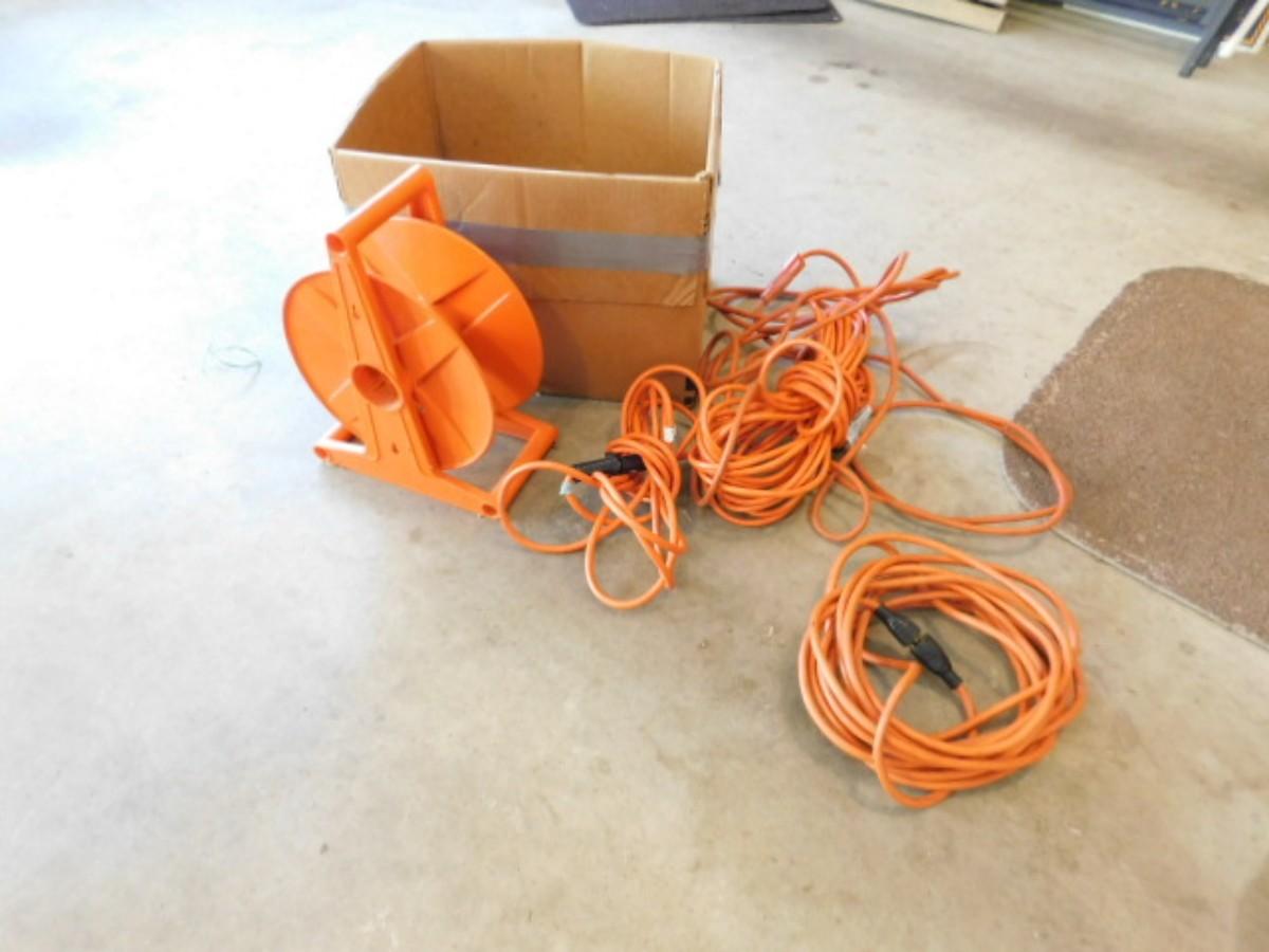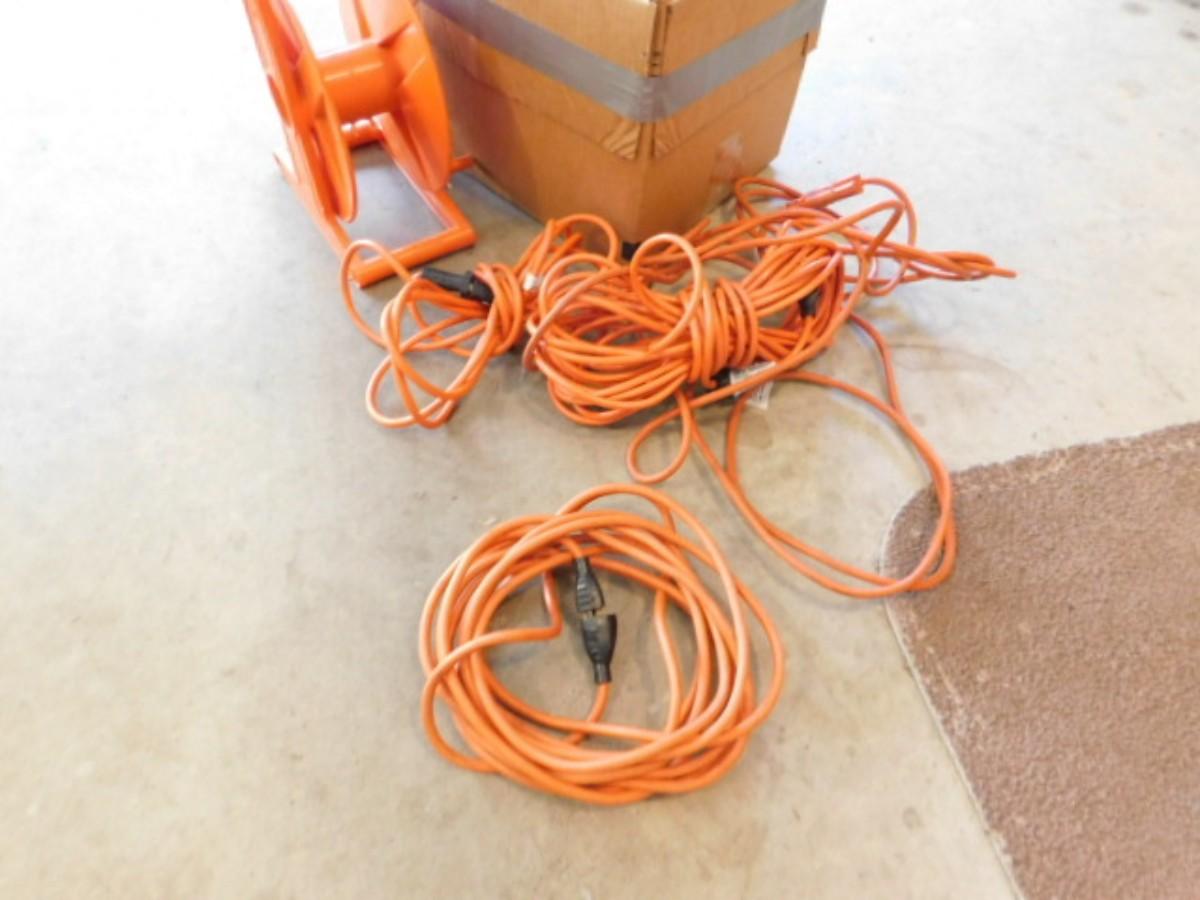 Collection of Outdoor Grade Extension Cords Various Lengths and Cord Reel