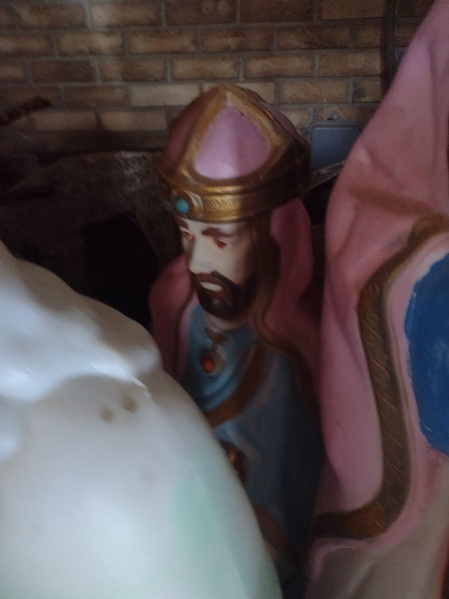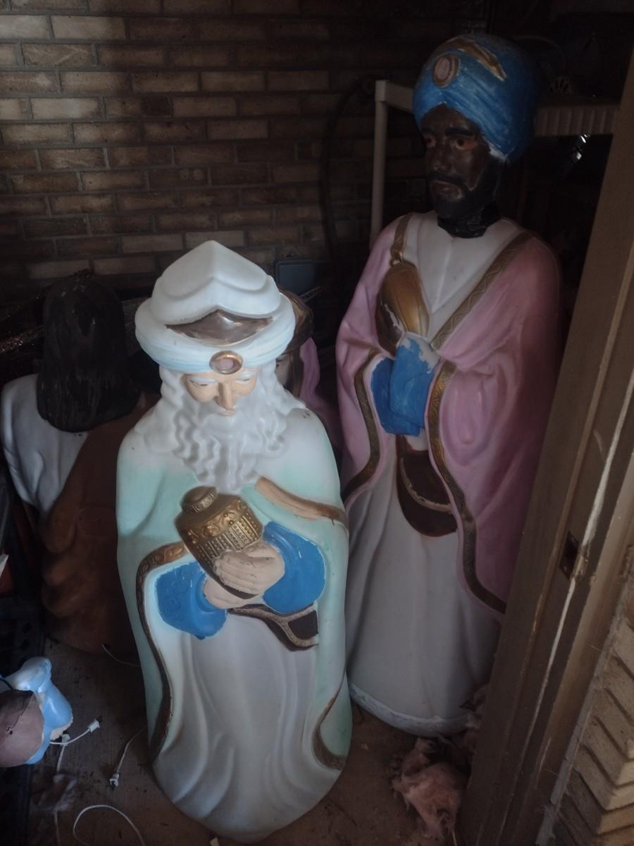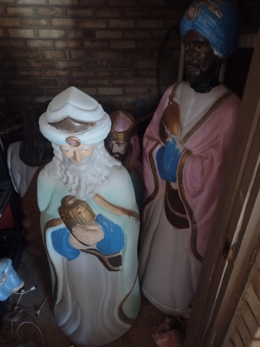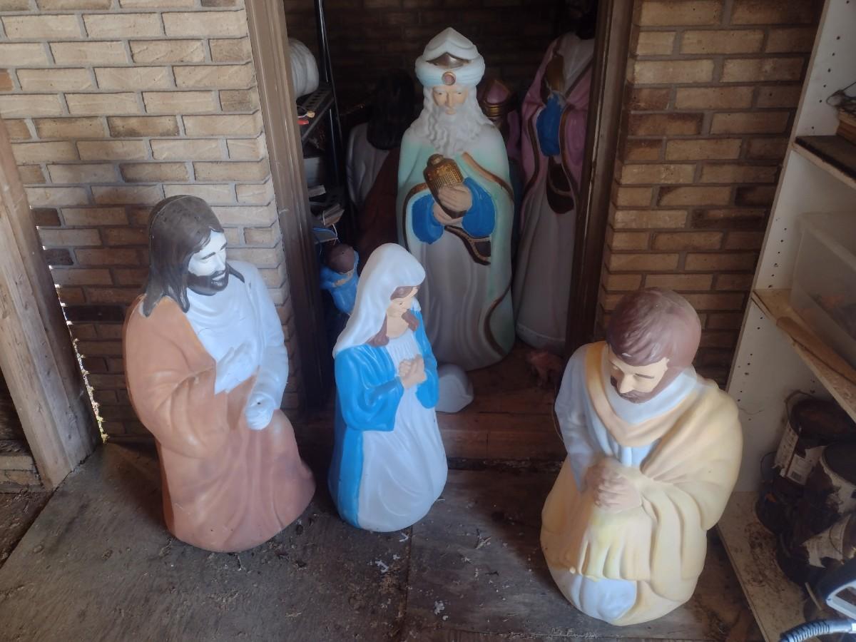Collection of Outdoor Nativity Scene Blow Mold Characters some pieces have cracks or open dents.