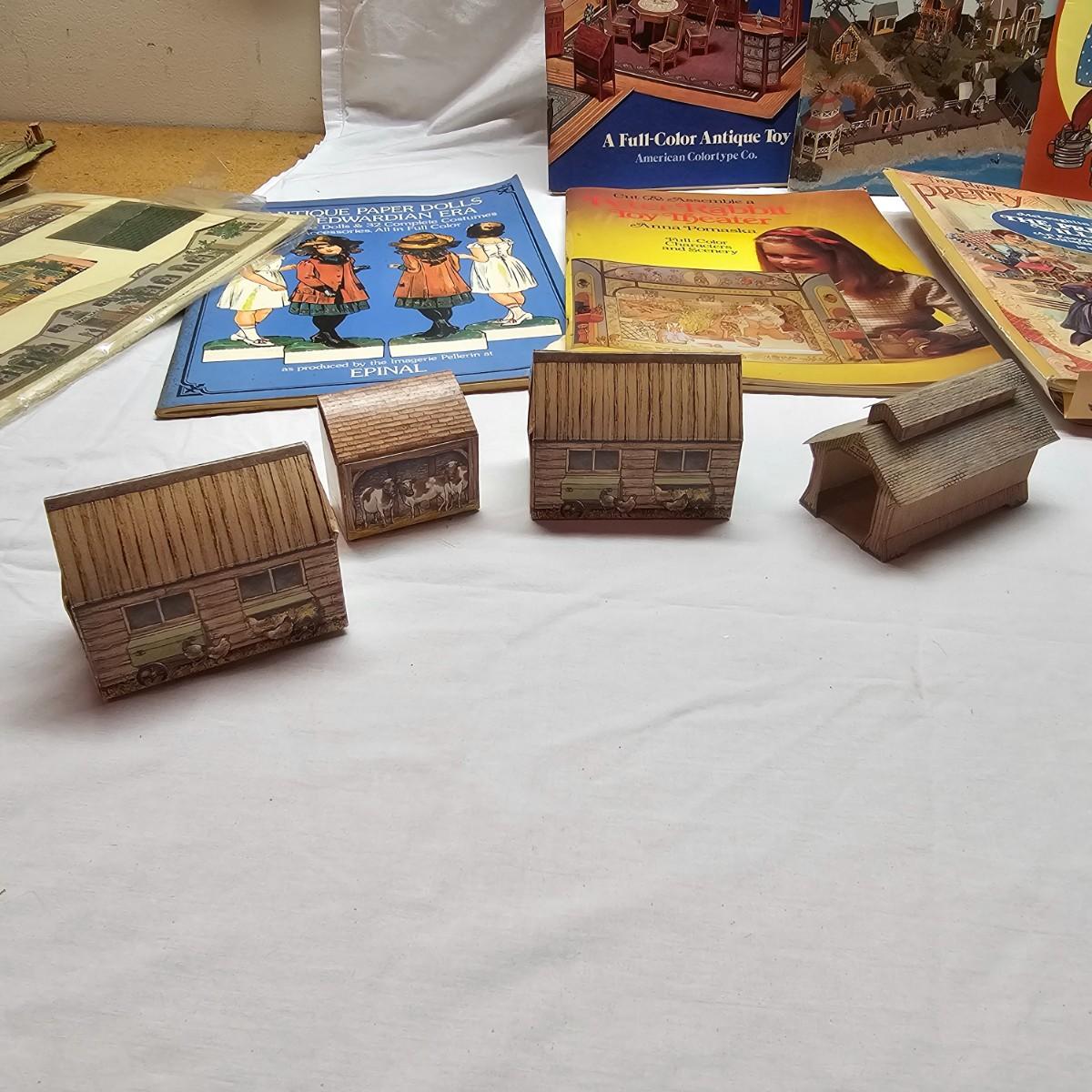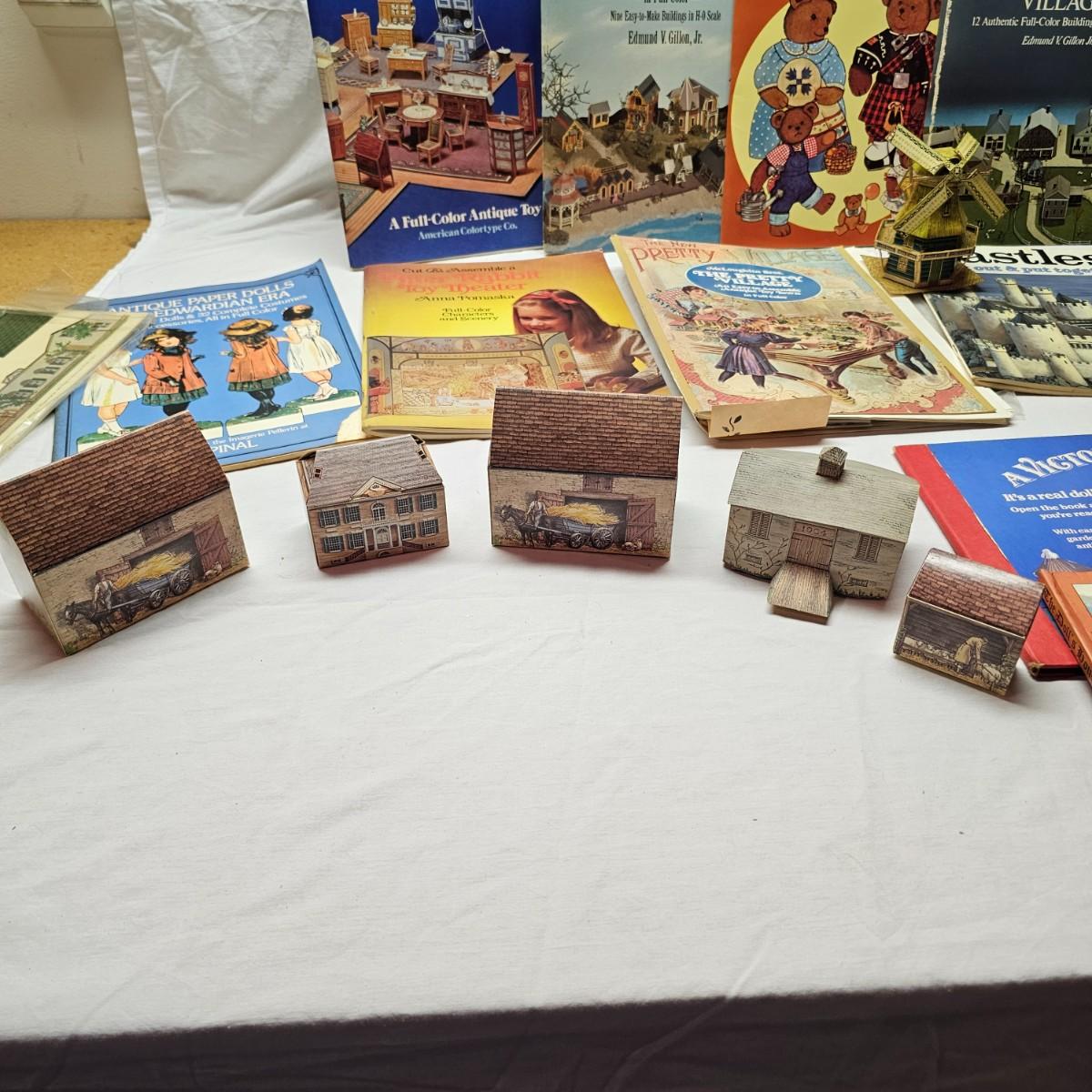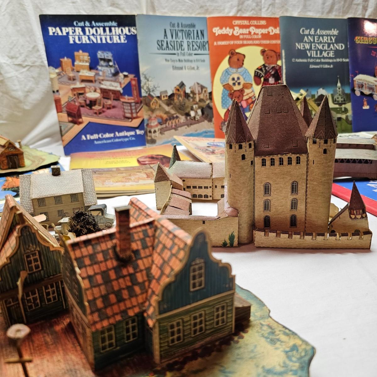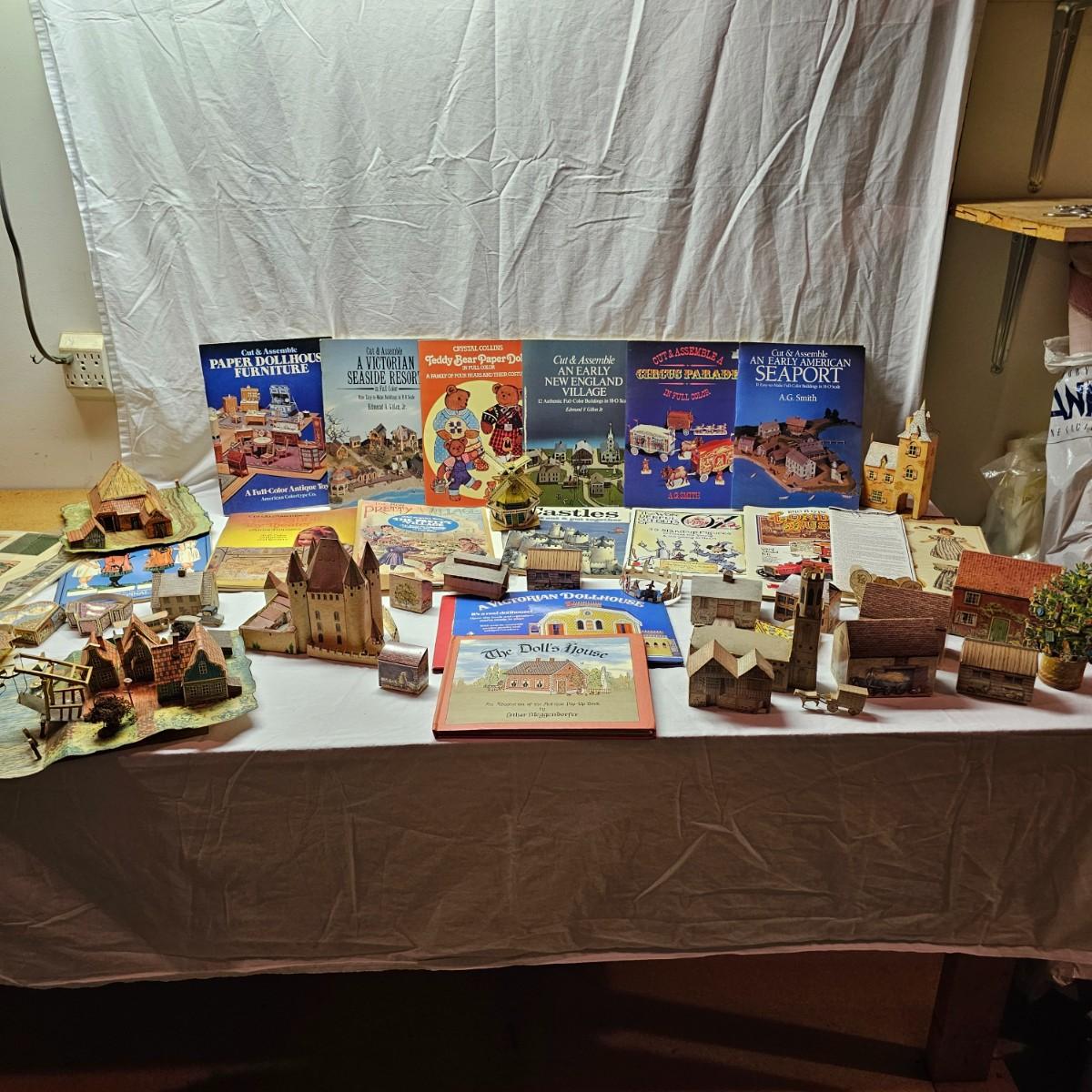 Seaside, farms, cottages, castles and more. Many items already put together, but several books ready for crafting. Largest item assembled is the bridge piece, measures 16" x 11" x 4"H. Also includes some pop-up books with houses in them and some of the original style paper dolls and clothes. Some pieces in need of TLC. See photos for details. Shipping available.