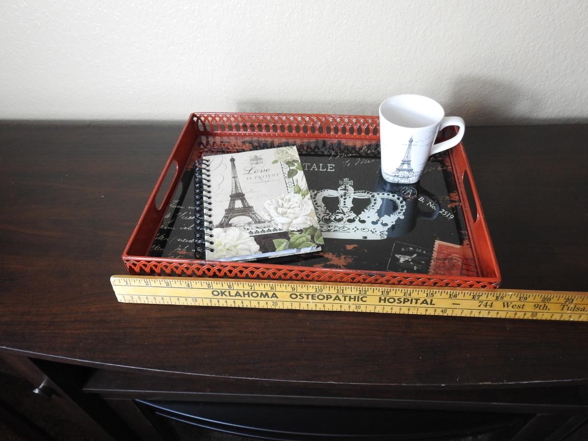 Paris decor to include solid metal handled tray ,Eiffel Tower mug and tablet all in great used condition