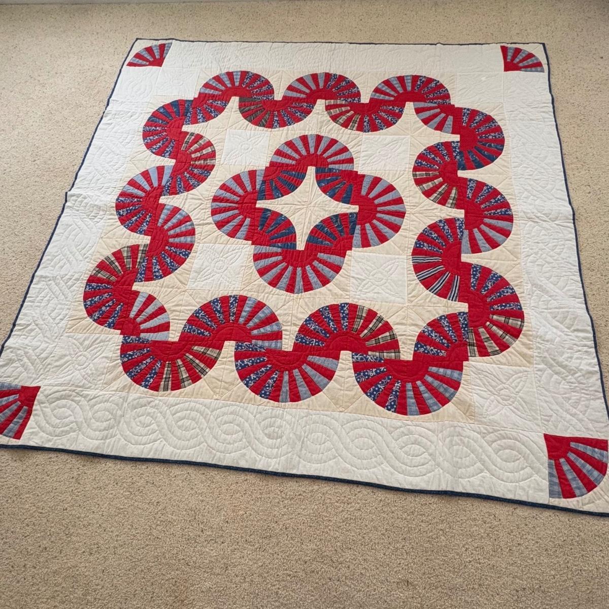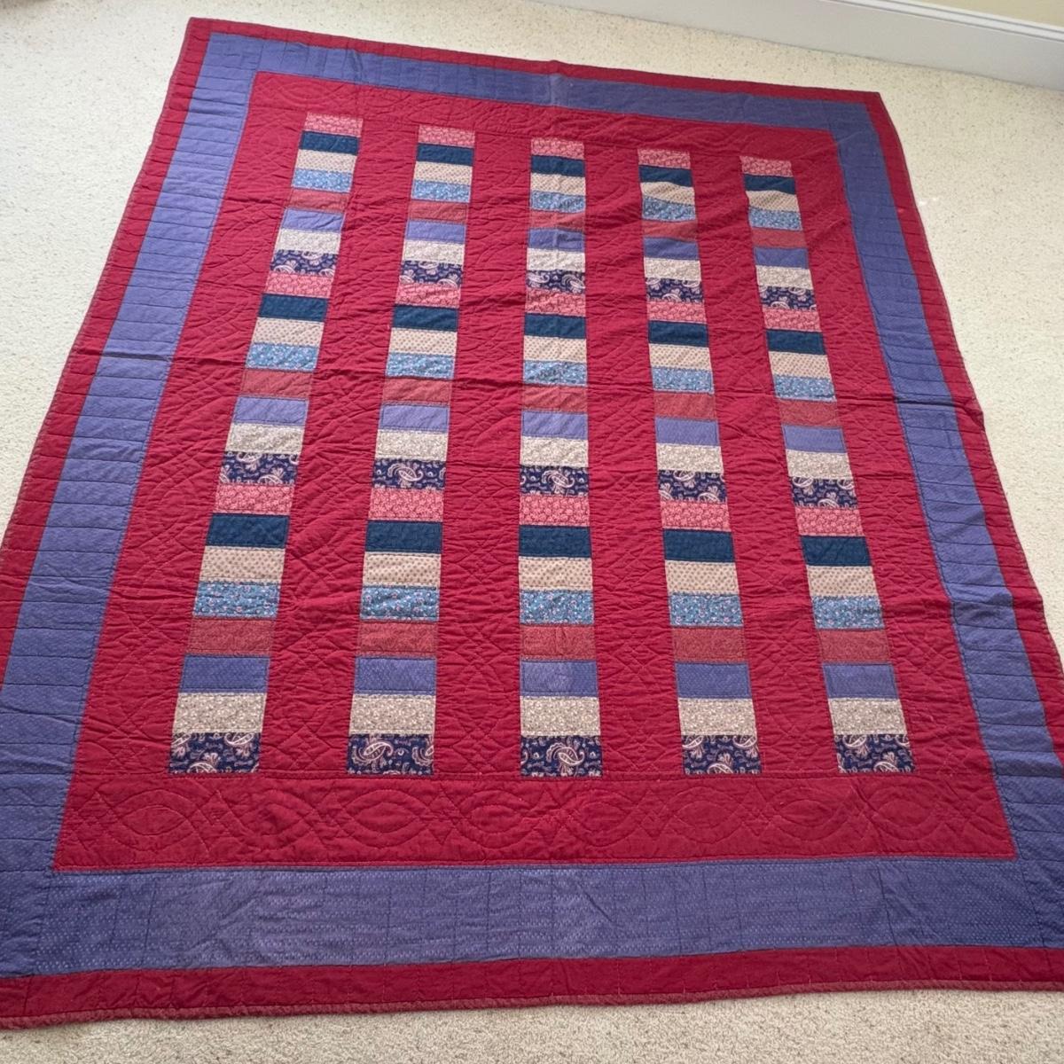 This lot includes a collection of 4 patchwork quilts of varying sizes, colors, and patterns. The largest quilt of the lot, with red and purple colors, measures at approximately 80" x 97"H. Shows signs of wear.