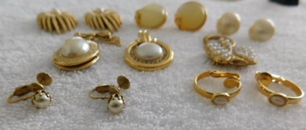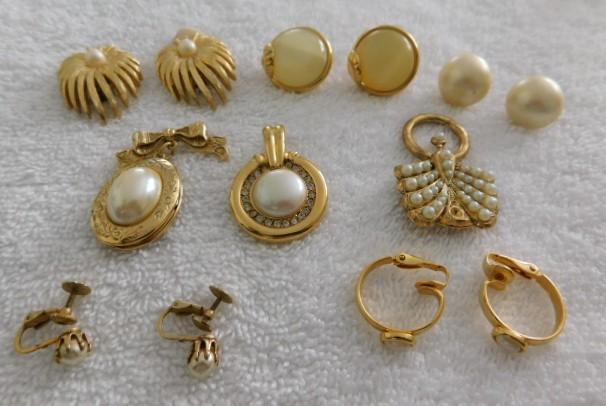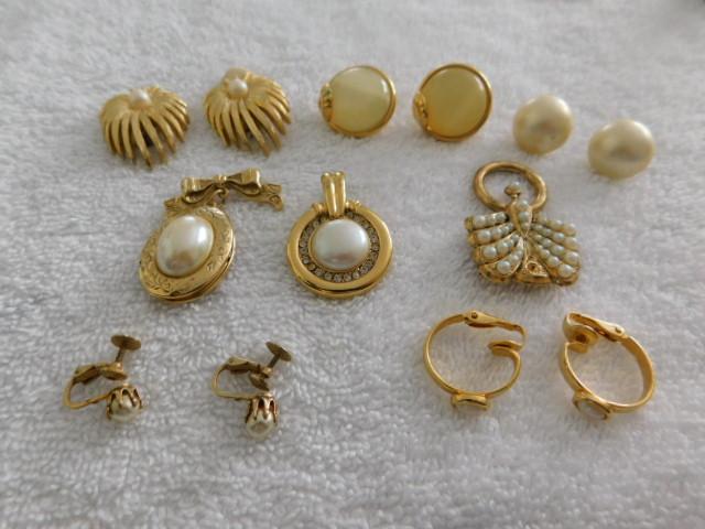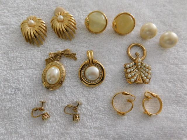 Collection of Pearl and Gold Plate Earrings, Pendants, and Pins
