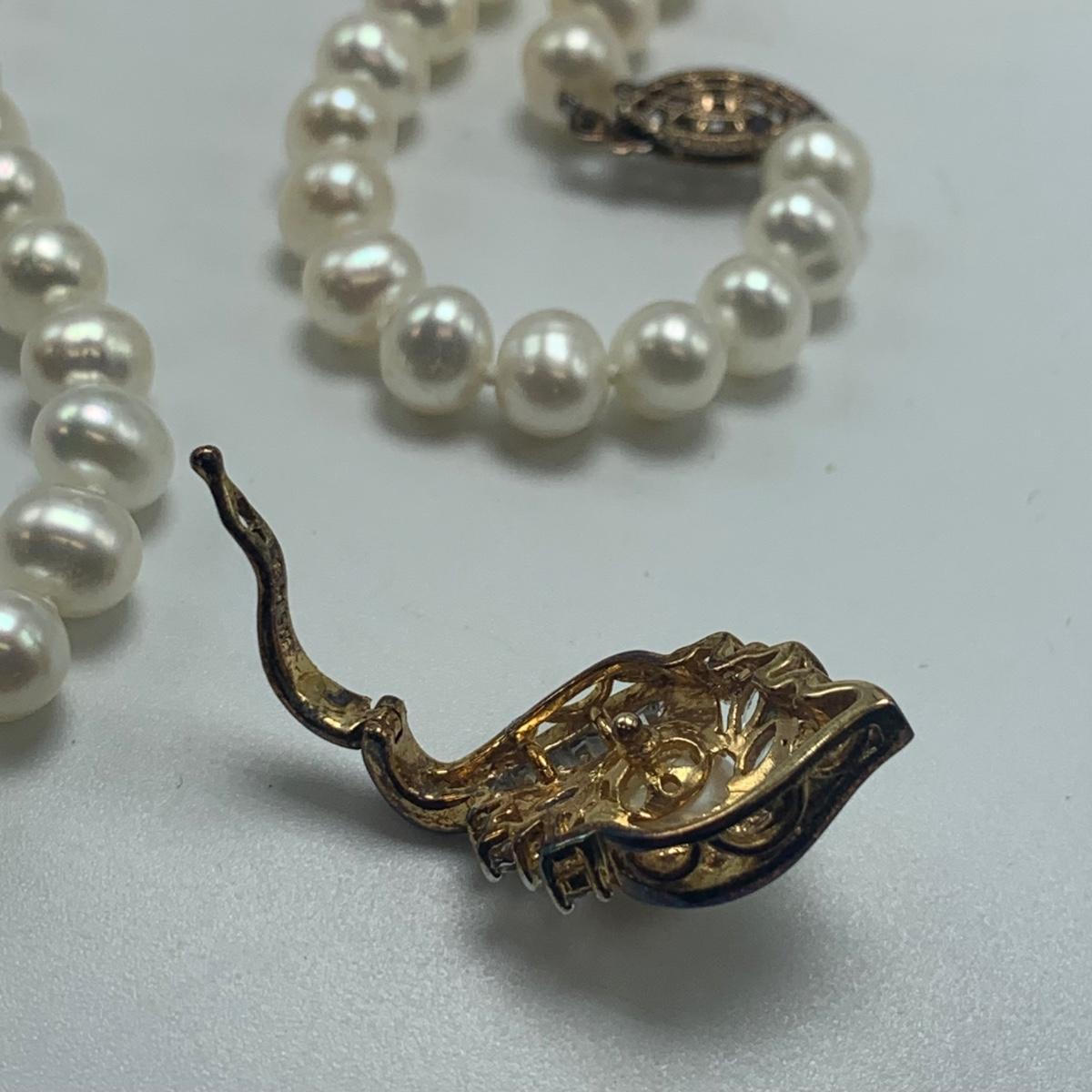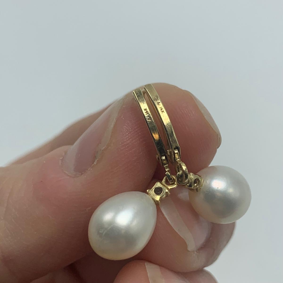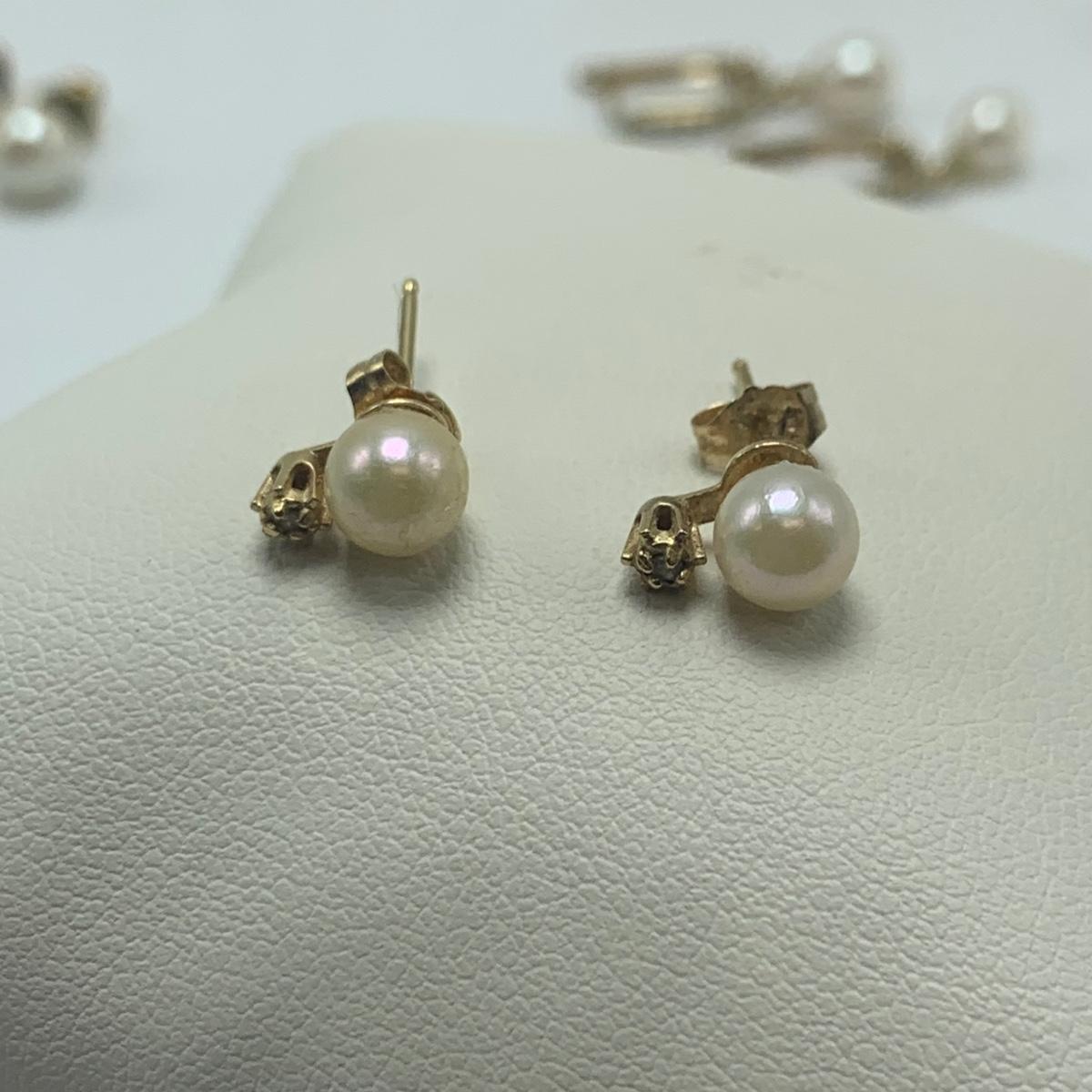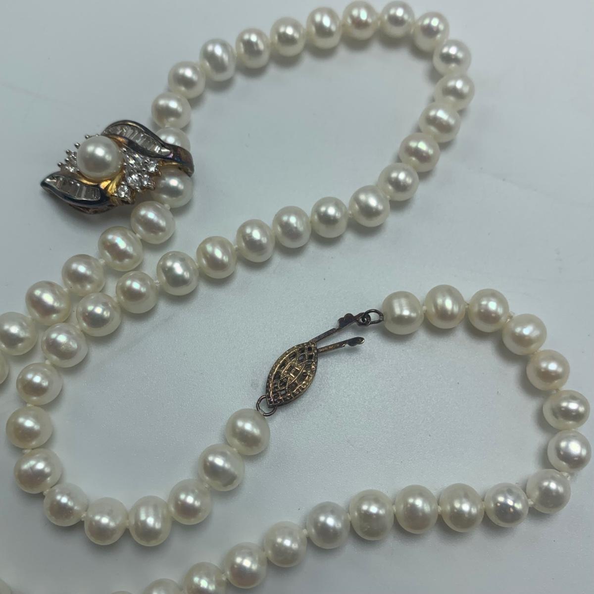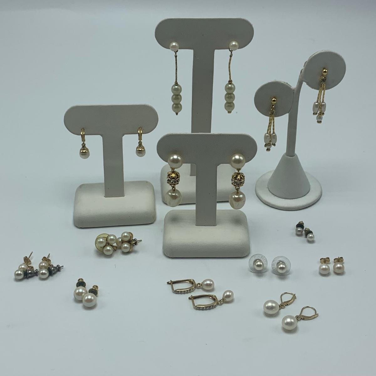 A collection of jewelry with pearl and pear-like gemstones. Included are five necklaces, 13 pairs of earrings for pierced ears, and two brooches. The longest necklace has three strands full of what appear to be freshwater pearls with a clasp stamped “˜14K’. It is 28”. The three single strand Pearl necklaces are all hand-knotted. One clasp is marked “˜14K’, one “˜10K’, and one “˜925’ along with its pendant. Some marks are found on earrings. Please see photos for any/all markings. Several have small clear gemstones. There is some tarnishing on some of the earrings and their backs.
