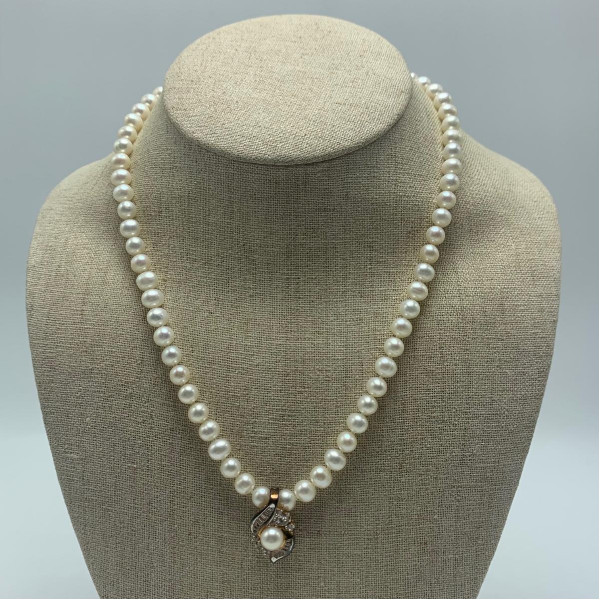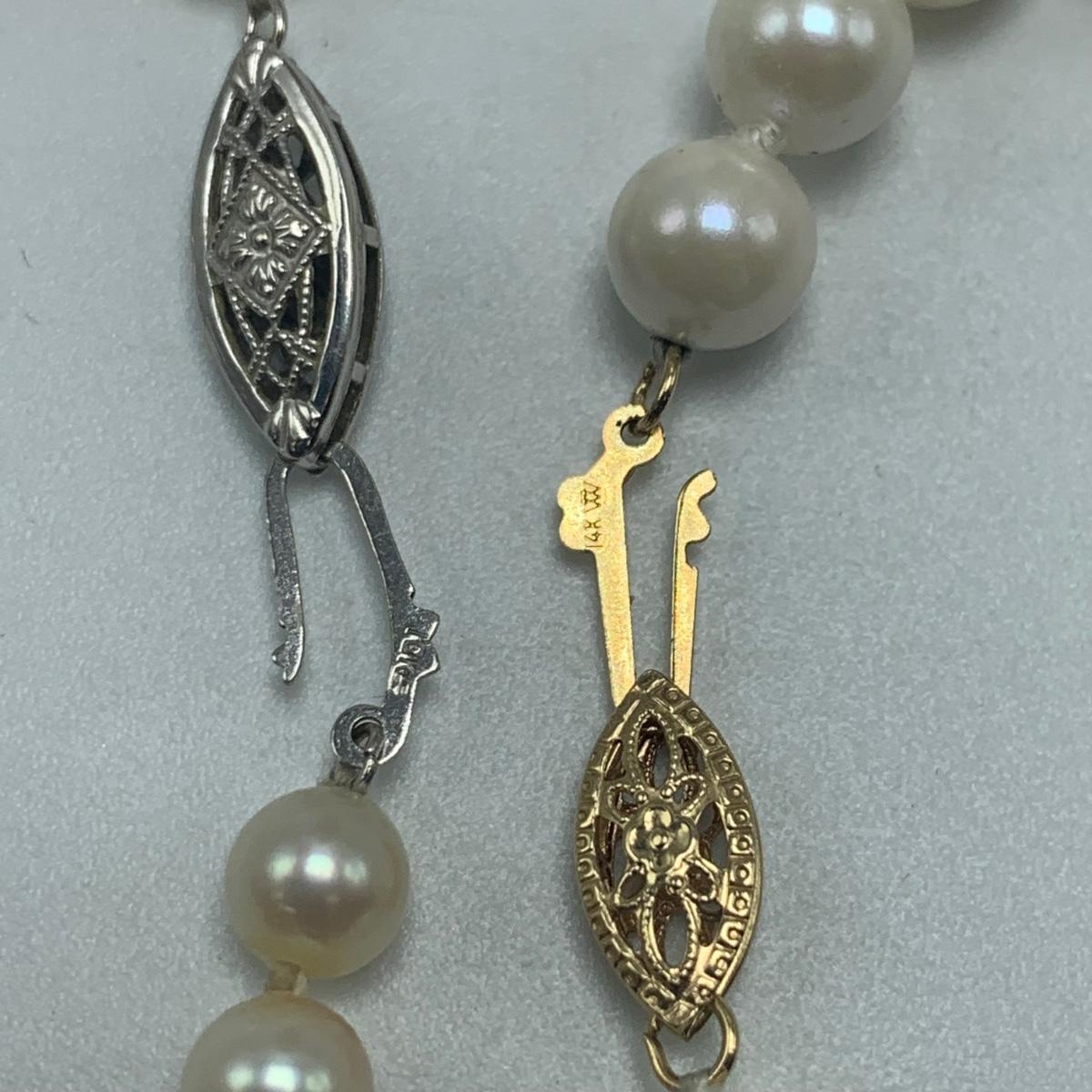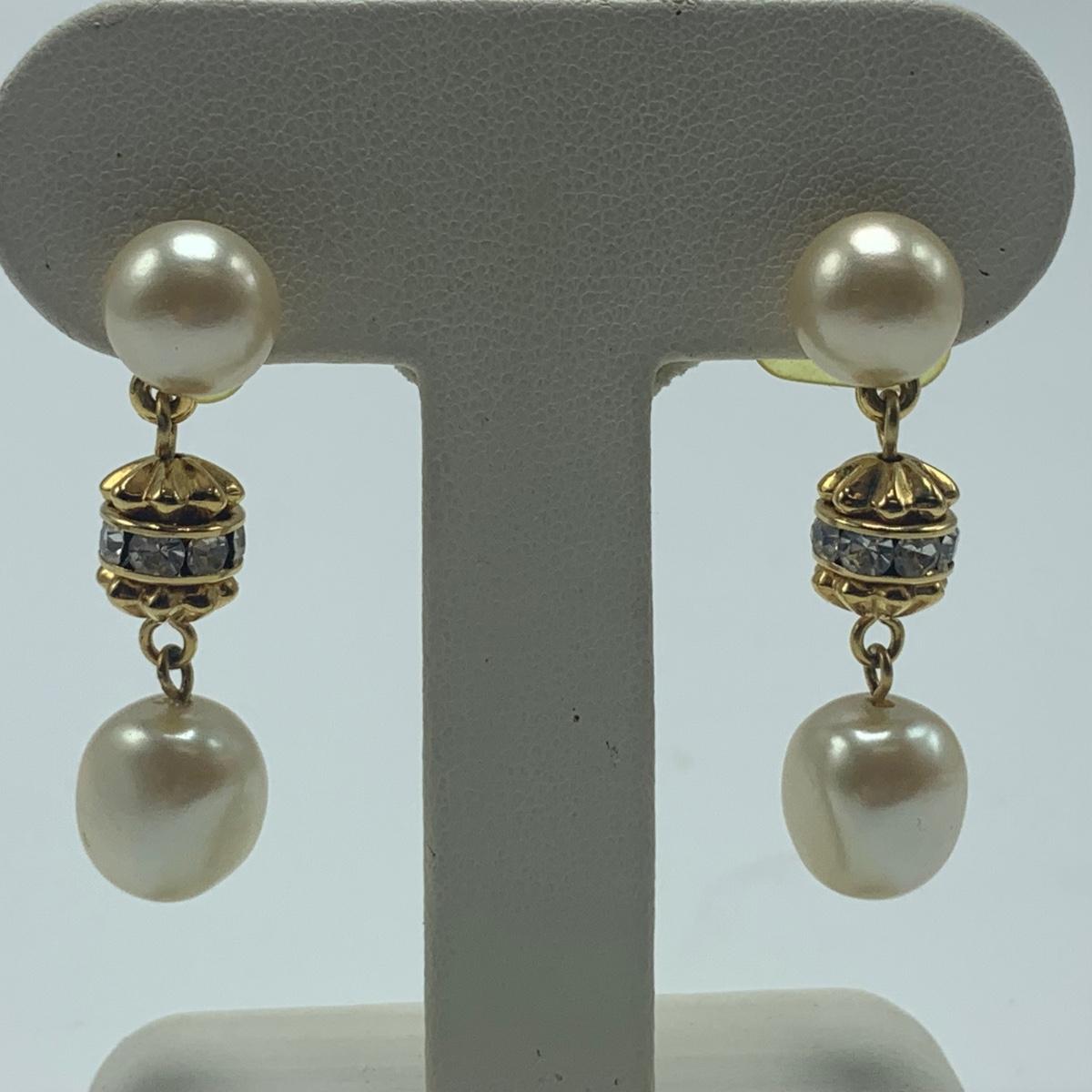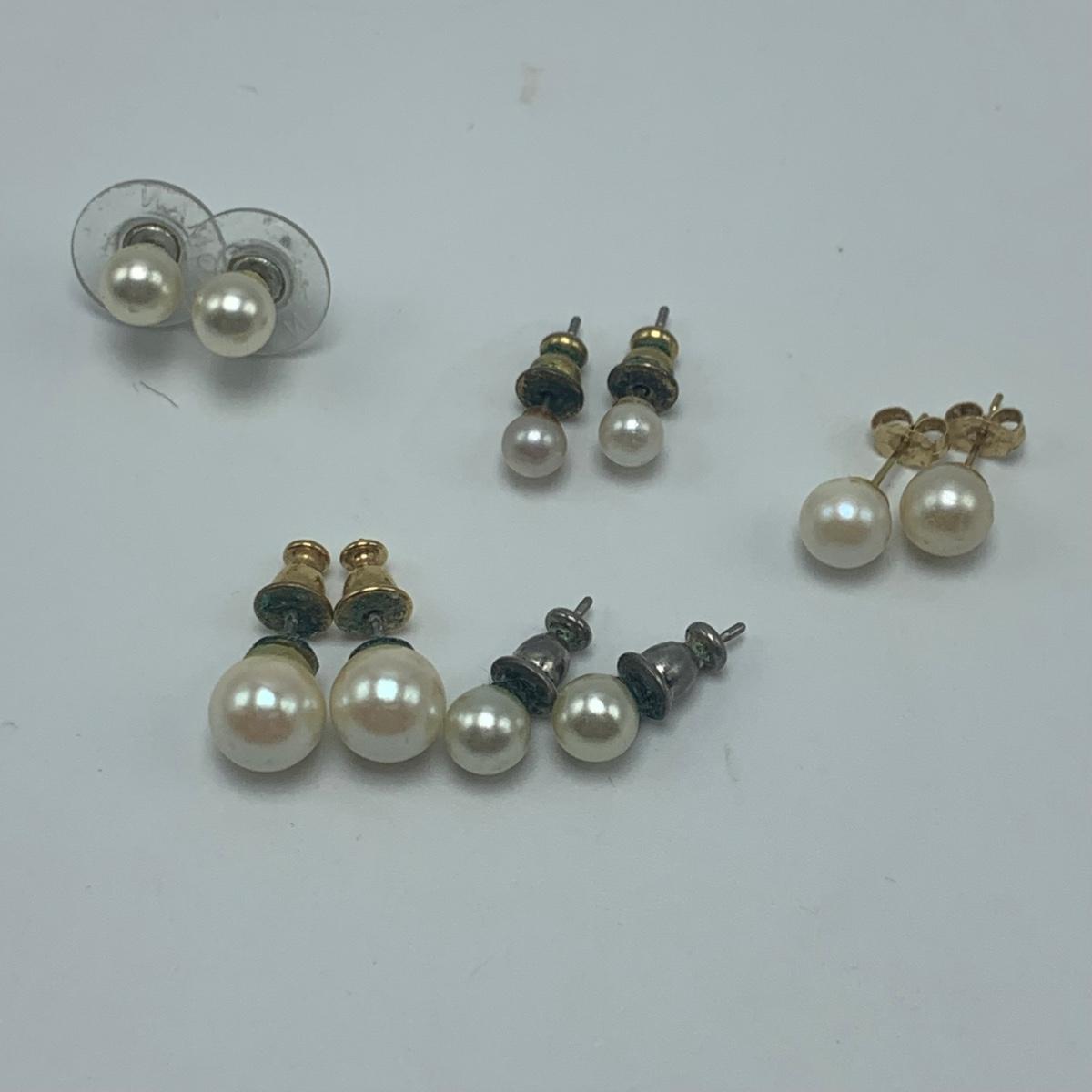 A collection of jewelry with pearl and pear-like gemstones. Included are five necklaces, 13 pairs of earrings for pierced ears, and two brooches. The longest necklace has three strands full of what appear to be freshwater pearls with a clasp stamped “˜14K’. It is 28”. The three single strand Pearl necklaces are all hand-knotted. One clasp is marked “˜14K’, one “˜10K’, and one “˜925’ along with its pendant. Some marks are found on earrings. Please see photos for any/all markings. Several have small clear gemstones. There is some tarnishing on some of the earrings and their backs.