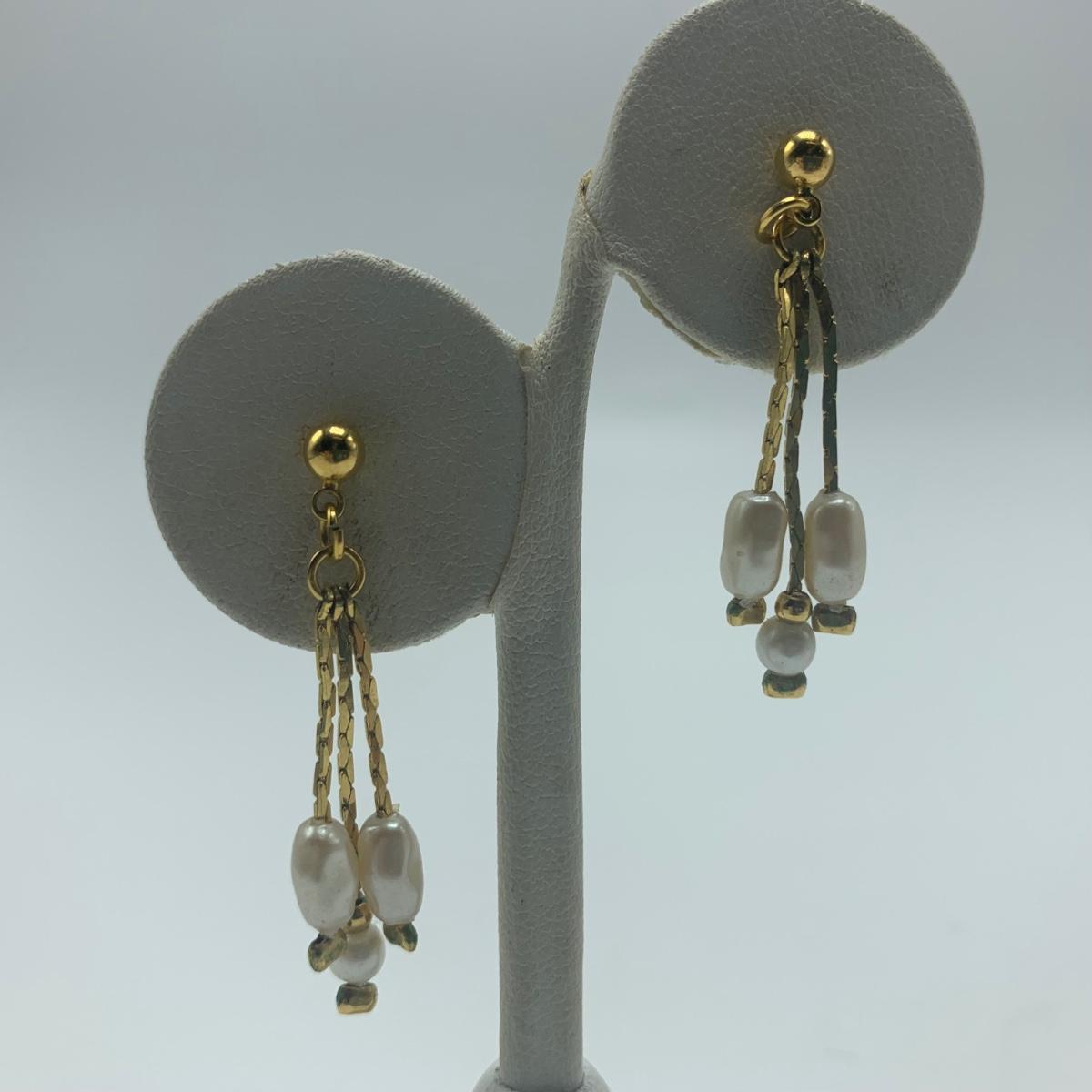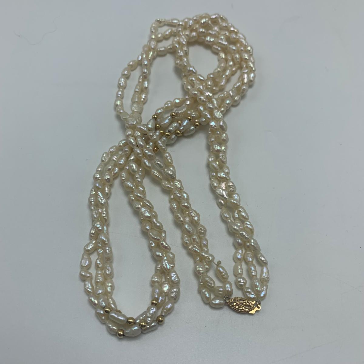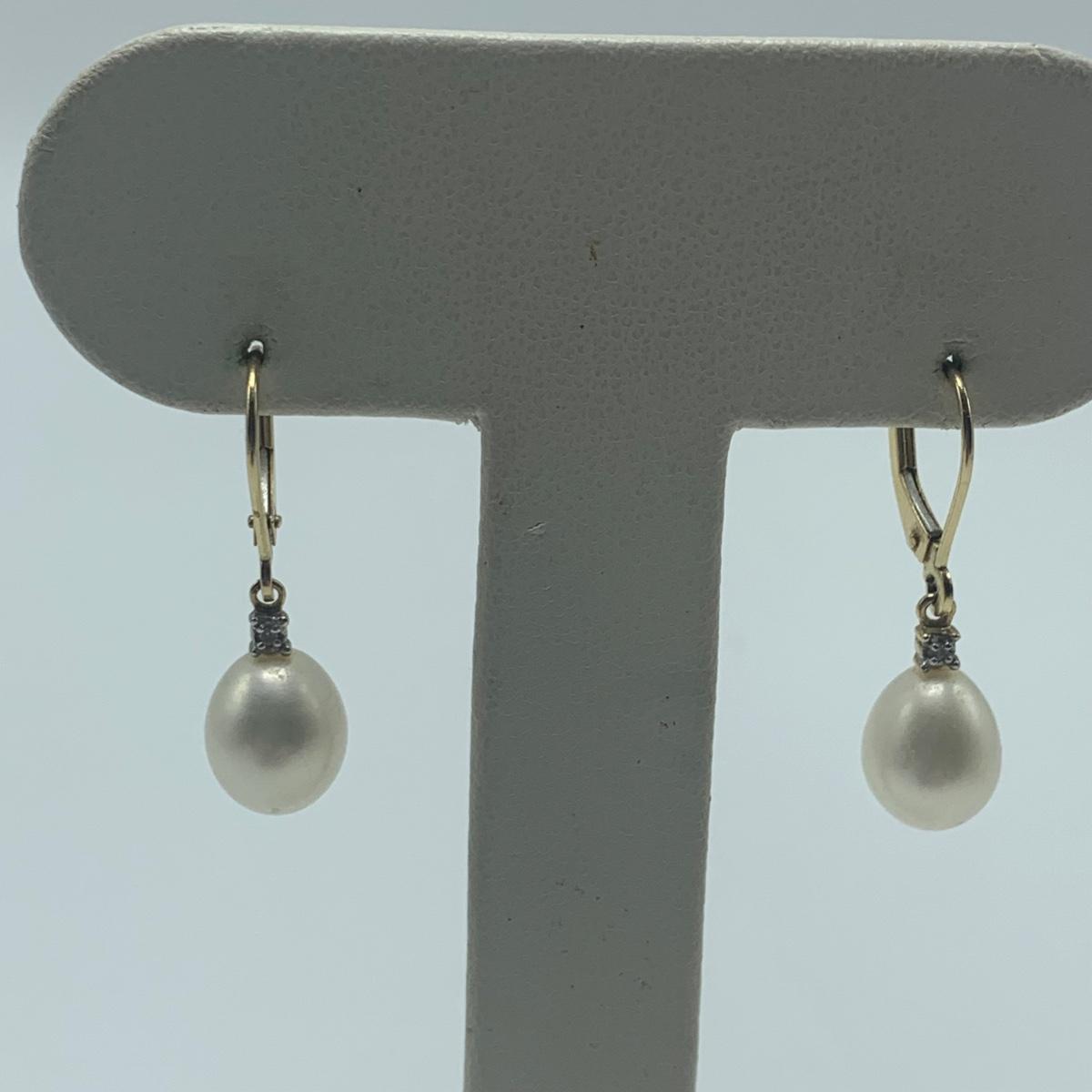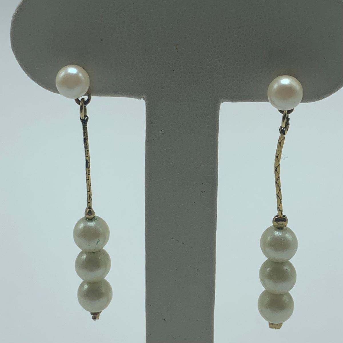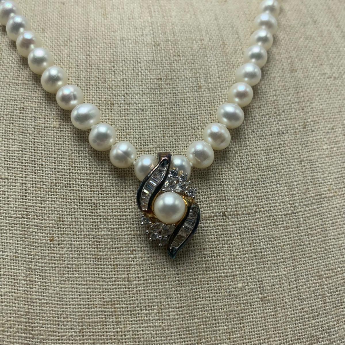 A collection of jewelry with pearl and pear-like gemstones. Included are five necklaces, 13 pairs of earrings for pierced ears, and two brooches. The longest necklace has three strands full of what appear to be freshwater pearls with a clasp stamped “˜14K’. It is 28”. The three single strand Pearl necklaces are all hand-knotted. One clasp is marked “˜14K’, one “˜10K’, and one “˜925’ along with its pendant. Some marks are found on earrings. Please see photos for any/all markings. Several have small clear gemstones. There is some tarnishing on some of the earrings and their backs.