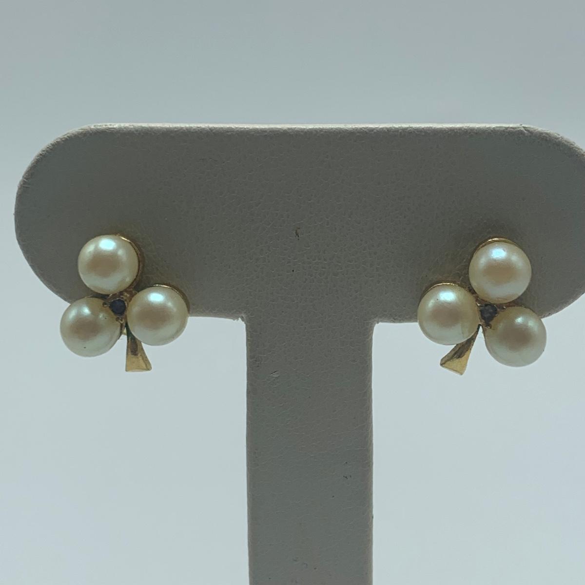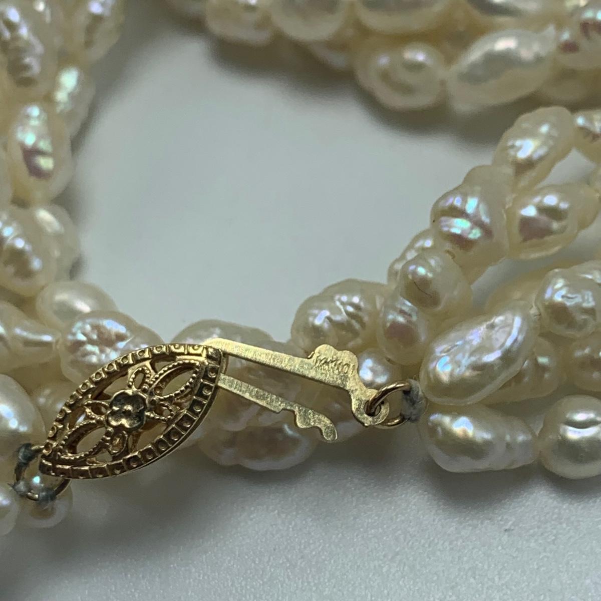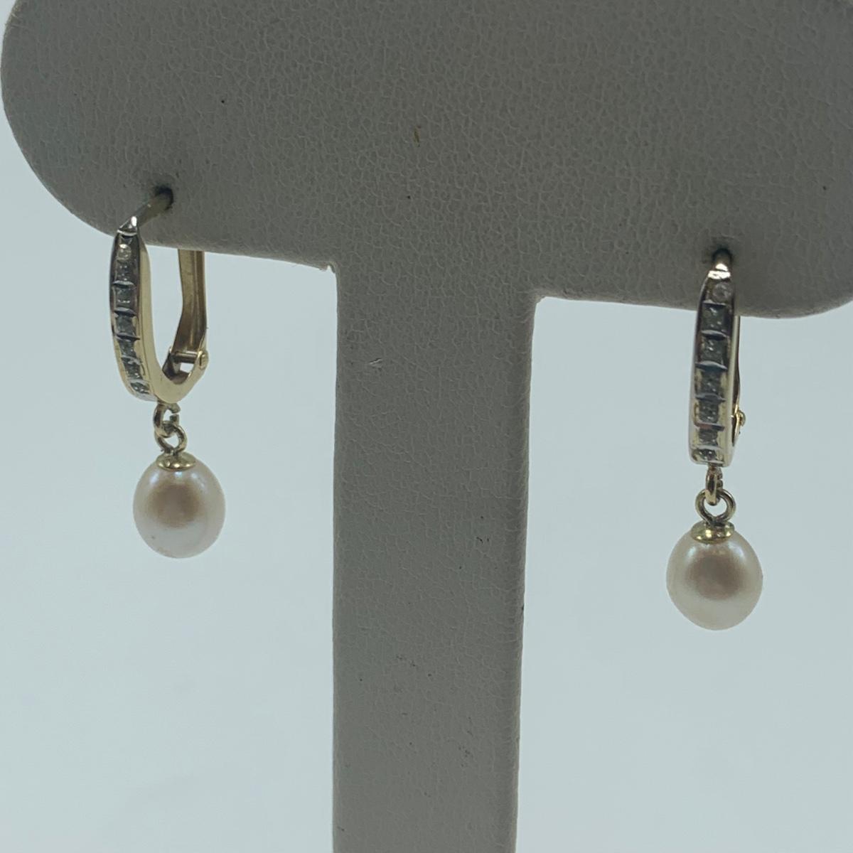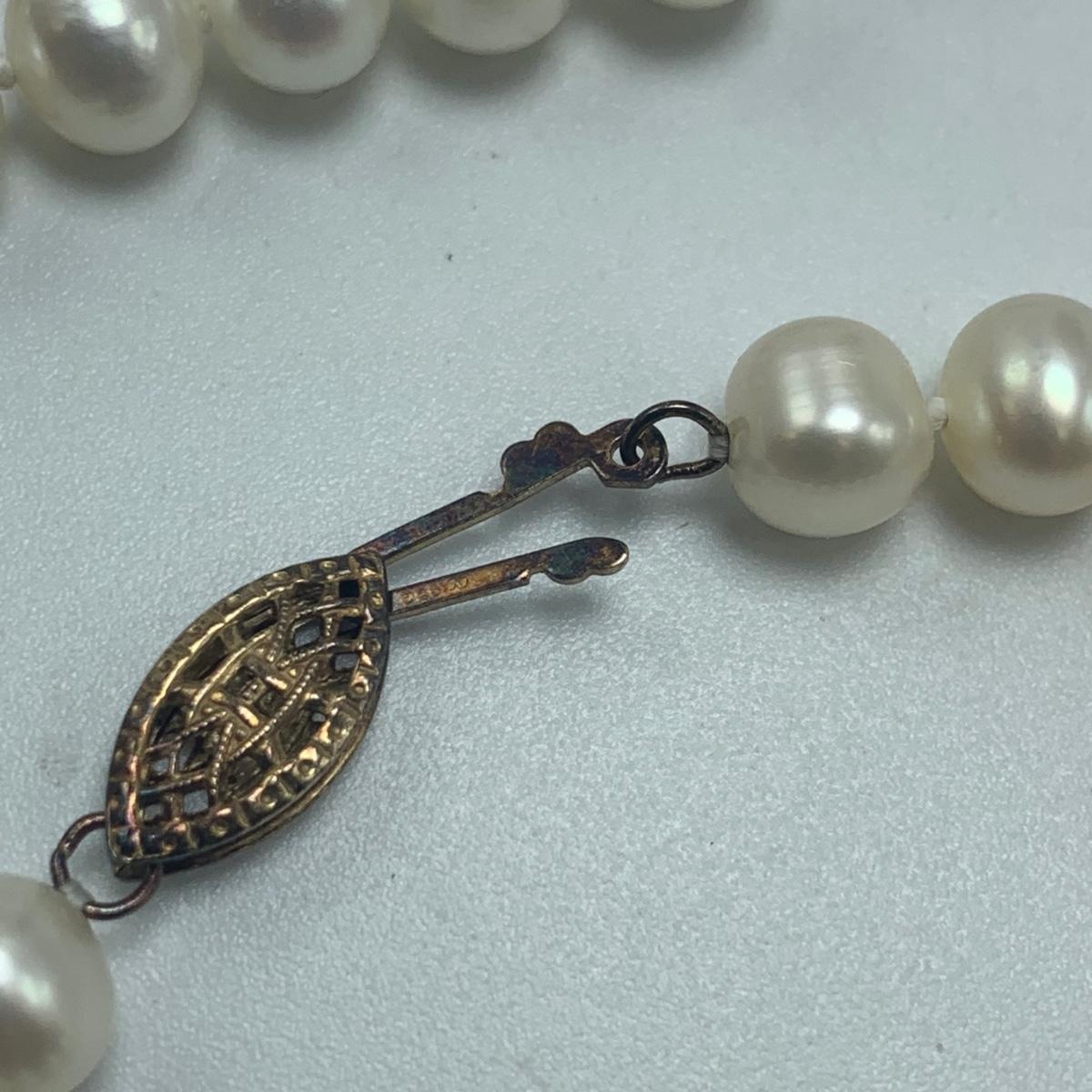 A collection of jewelry with pearl and pear-like gemstones. Included are five necklaces, 13 pairs of earrings for pierced ears, and two brooches. The longest necklace has three strands full of what appear to be freshwater pearls with a clasp stamped “˜14K’. It is 28”. The three single strand Pearl necklaces are all hand-knotted. One clasp is marked “˜14K’, one “˜10K’, and one “˜925’ along with its pendant. Some marks are found on earrings. Please see photos for any/all markings. Several have small clear gemstones. There is some tarnishing on some of the earrings and their backs.